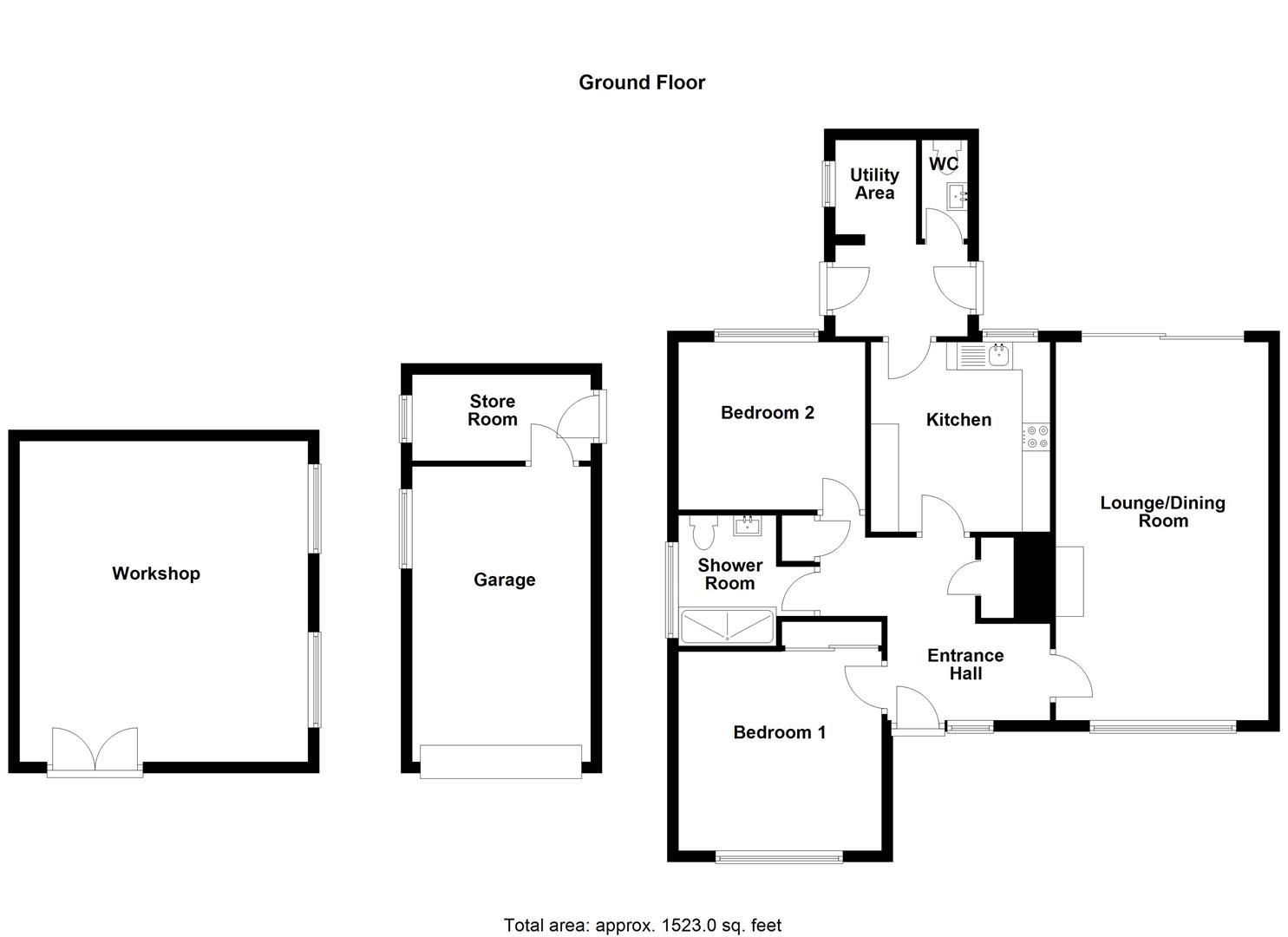 This unique and well maintained two bedroom detached bungalow set on an extensive plot with a large workshop has potential for renovation, development and has the potential for a commercial premises. The property provides well planned and well proportioned accommodation throughout, briefly comprising: entrance hall, kitchen, utility area lounge/dining room, two bedrooms, and shower room. Garage and storeroom, large workshop, gardens to the front and side, courtyard and spacious driveway to the rear. The property benefits from oil fired central heating.