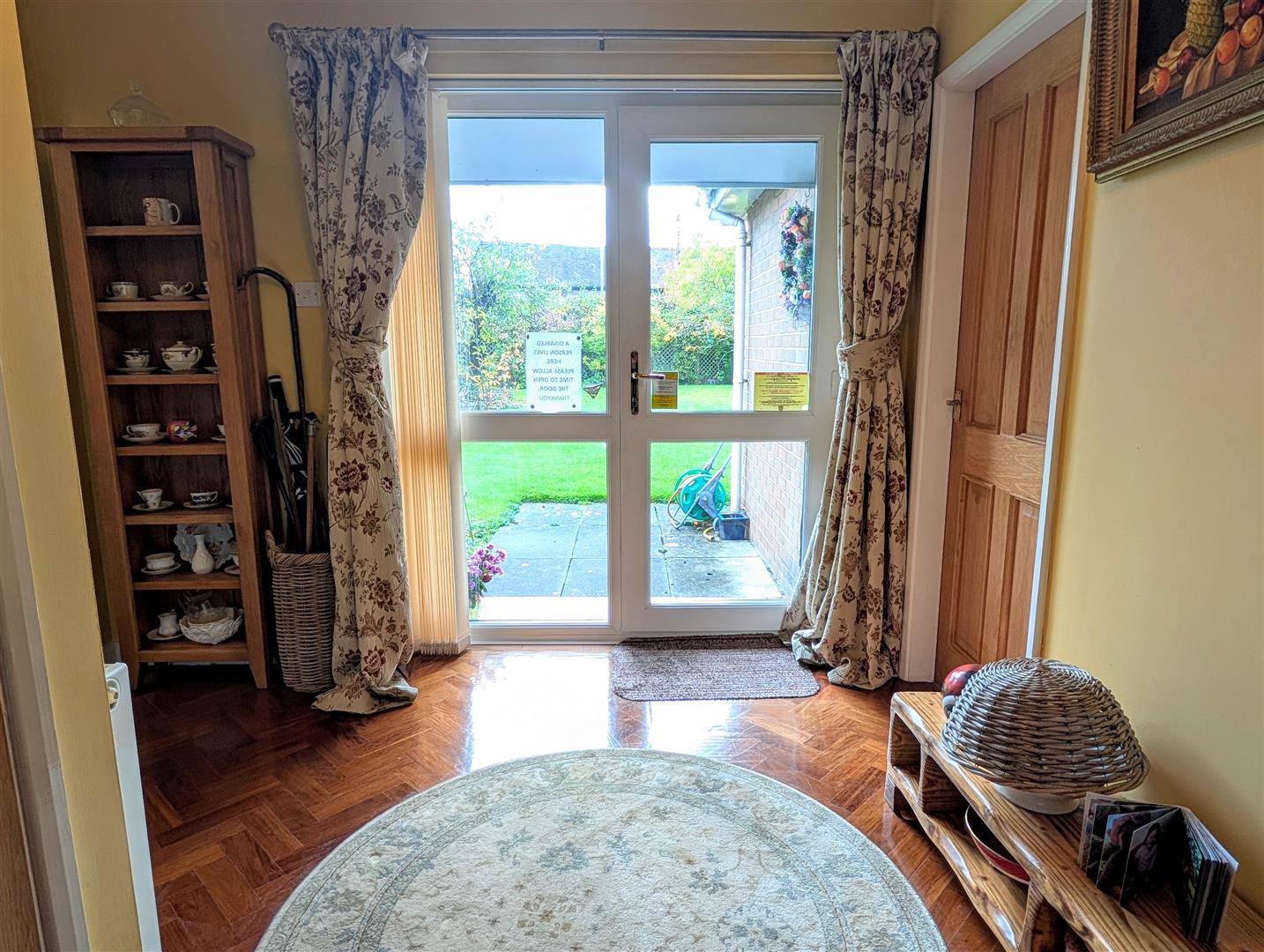 The property is set on an extensive plot with a large garden to the front, predominantly laid to lawn, inset with fruit trees.
