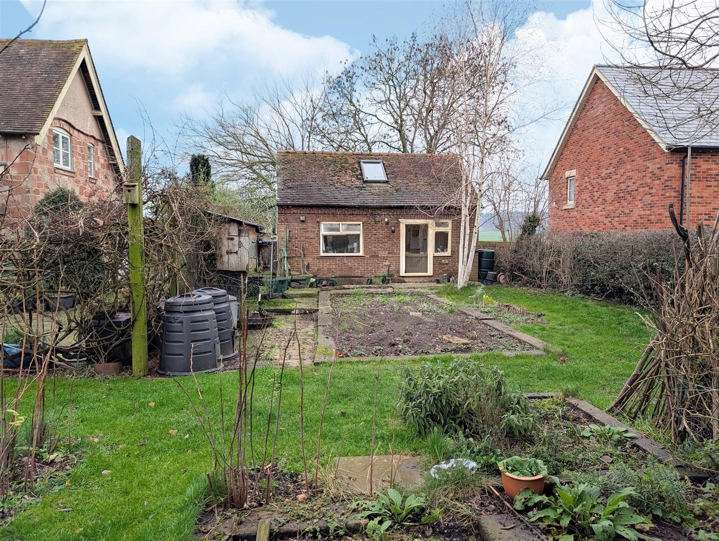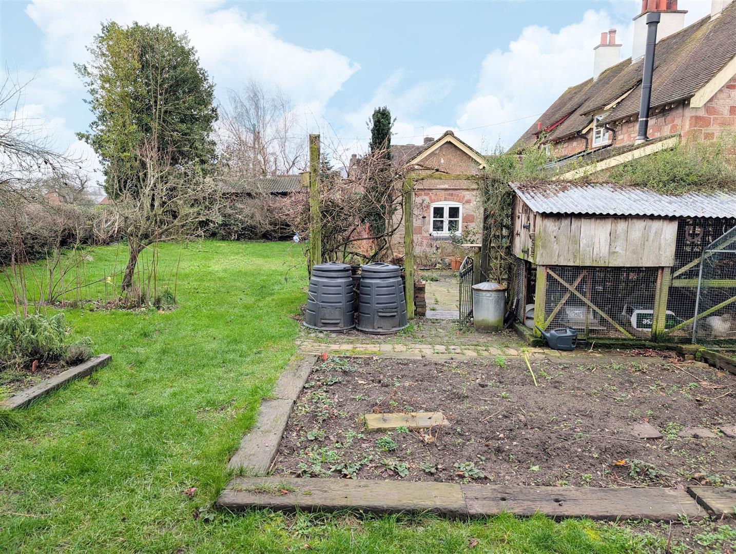 Gate leading to rear garden which is mainly laid to lawn with paved patio area, variety of vegetable patches and well stocked shrub beds and borders. The garden is enclosed by mature hedging and enjoying countryside views.