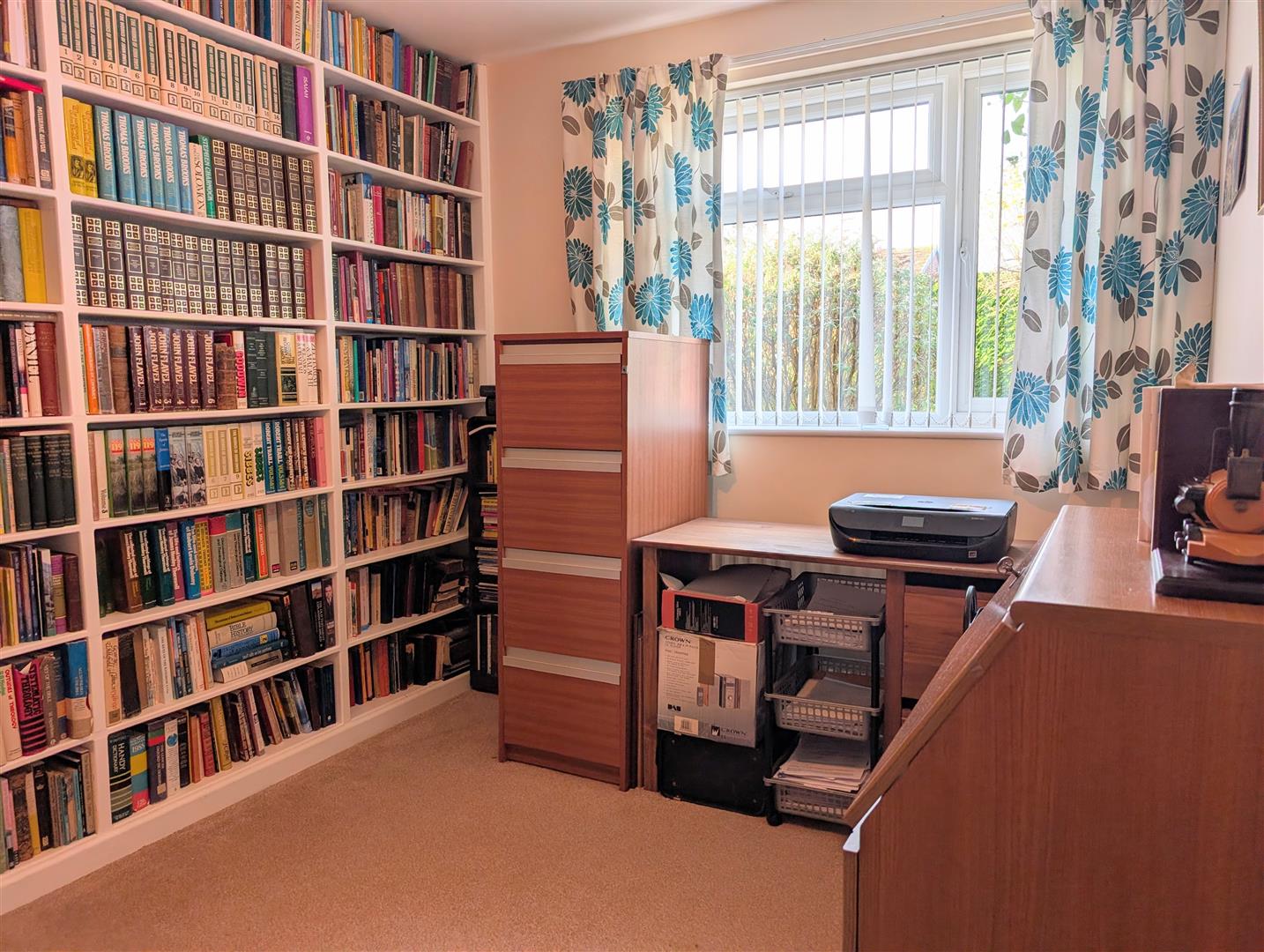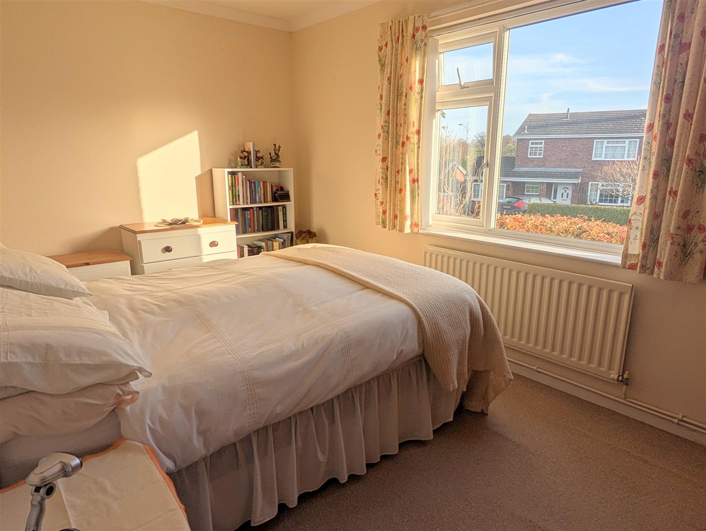 The property is approached over a paved driveway providing ample parking and access to the garage, flanked by the front garden predominantly laid to lawn with shrubbery borders.