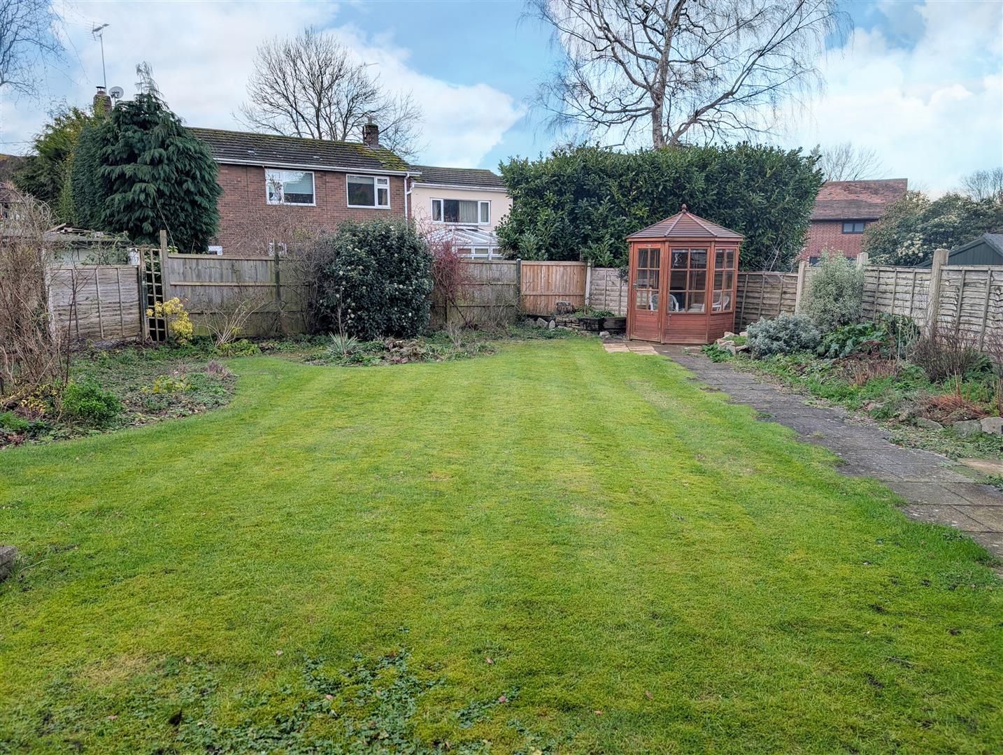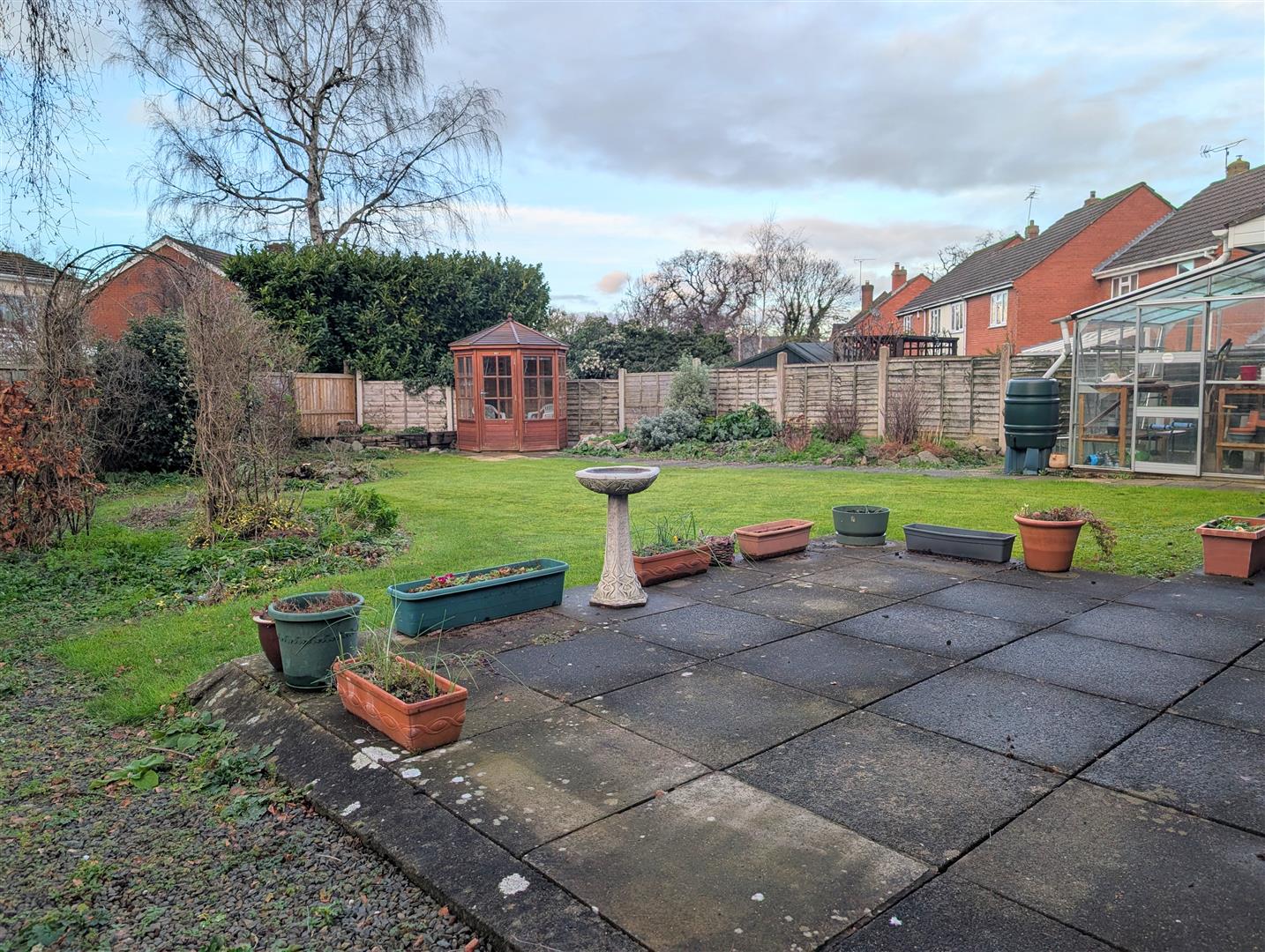 Enclosed REAR GARDEN laid to lawn with large paved patio, flanked by well stocked shrub beds and borders. Greenhouse. Summerhouse. The garden is enclosed by wooden fencing.