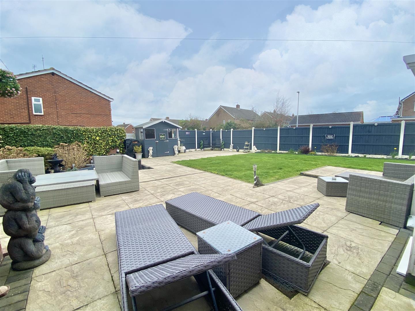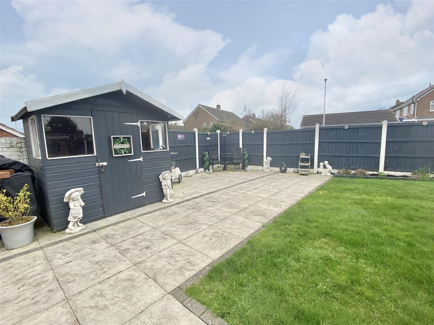 Beautifully landscaped REAR GARDEN laid to lawn with large paved patio providing ideal seating/entertaining area, further paved patio to the rear and ornamental gravelled area, well stocked flower and shrub beds and borders. Garden store shed.