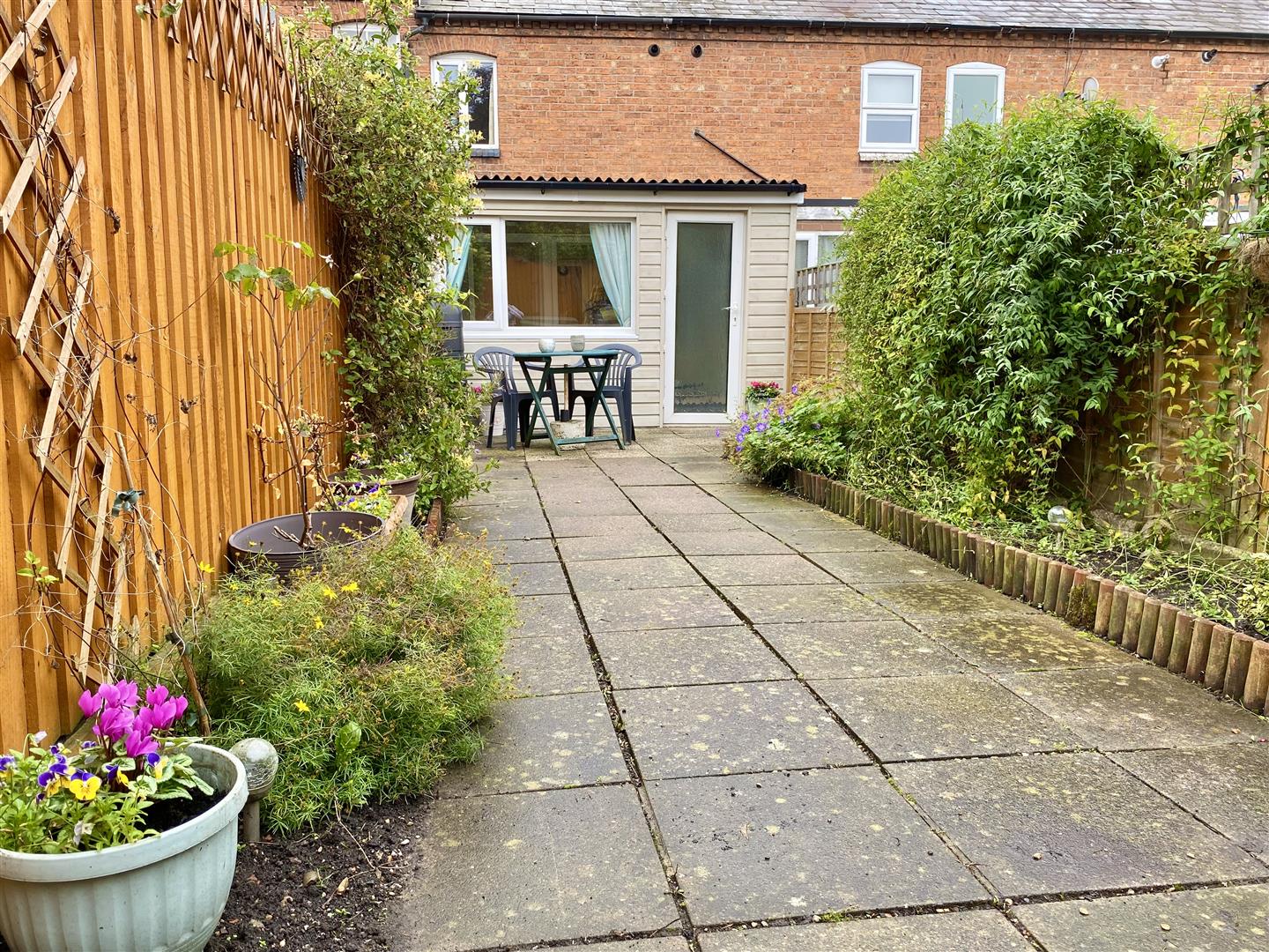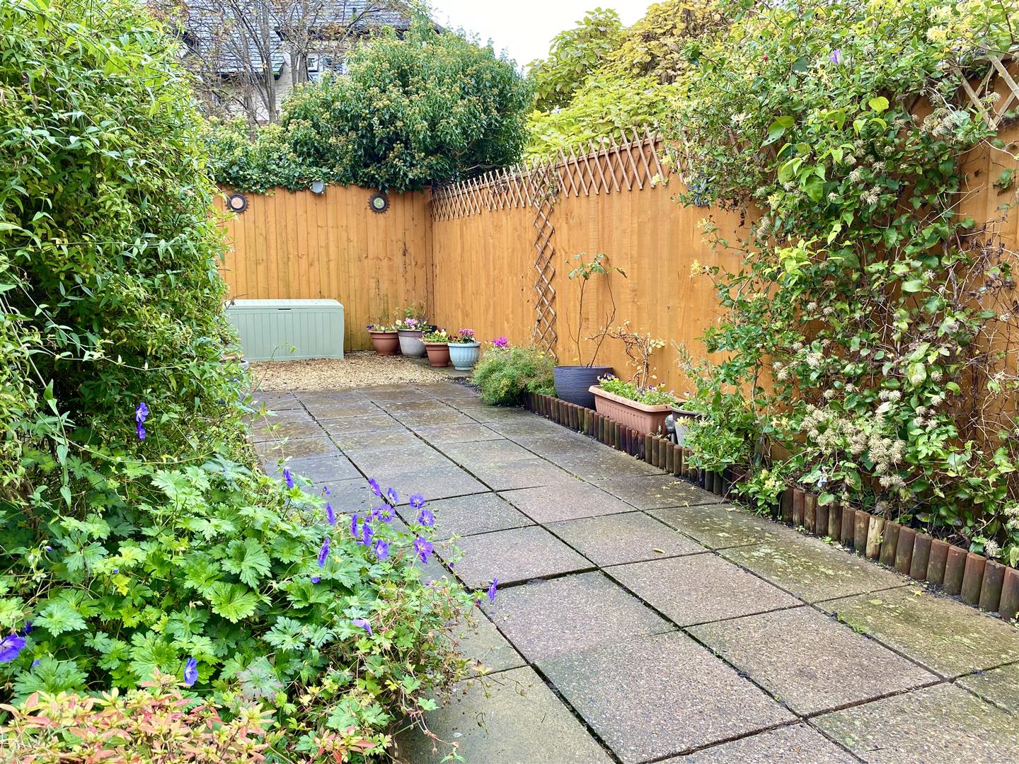 Large enclosed rear garden laid to paved patio for ease of maintenance with floral and shrubbery beds and borders. The garden is enclosed by wooden fencing.