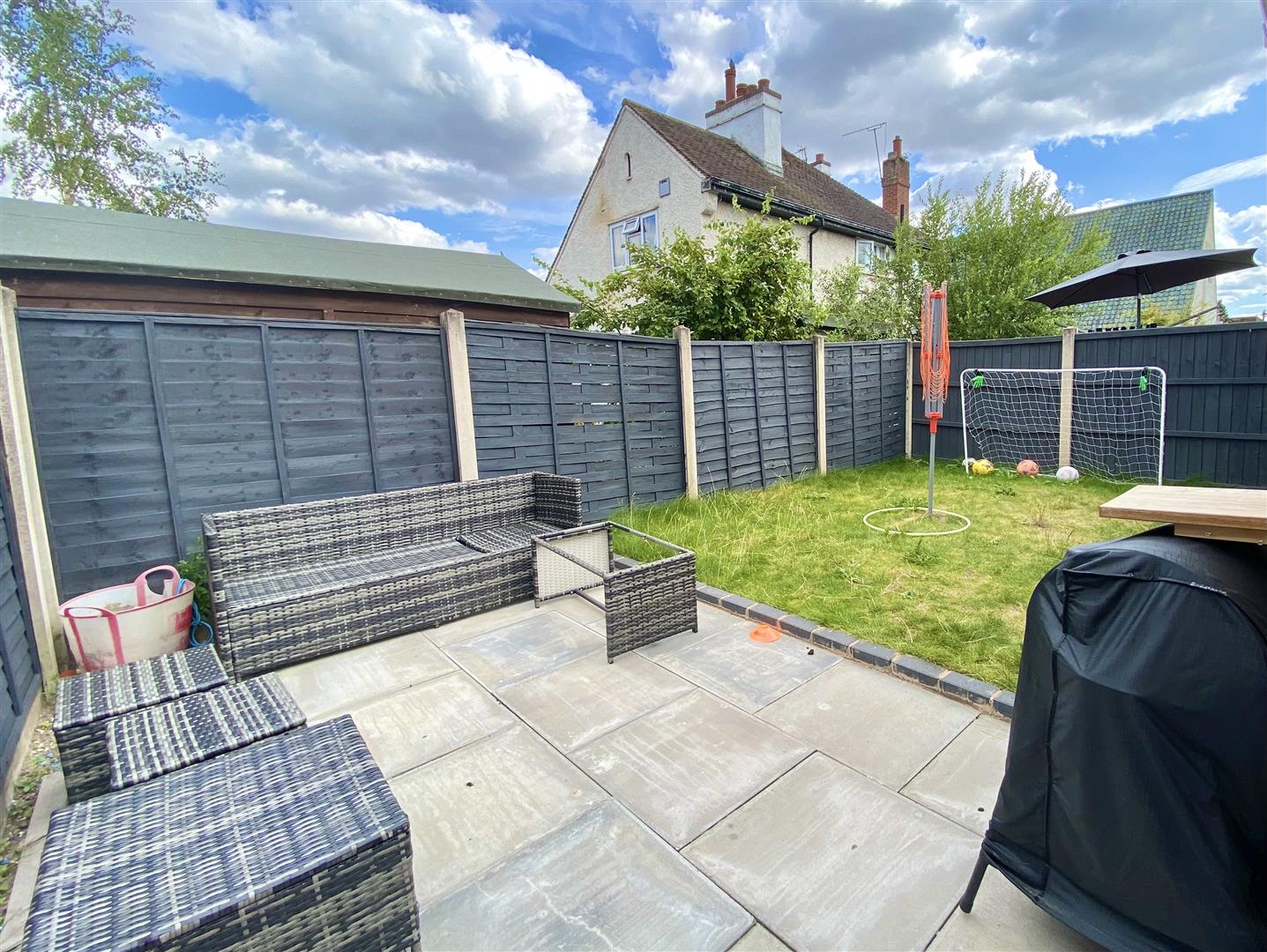 Enclosed REAR GARDEN laid to lawn with large paved patio area providing ideal seating/entertaining space.