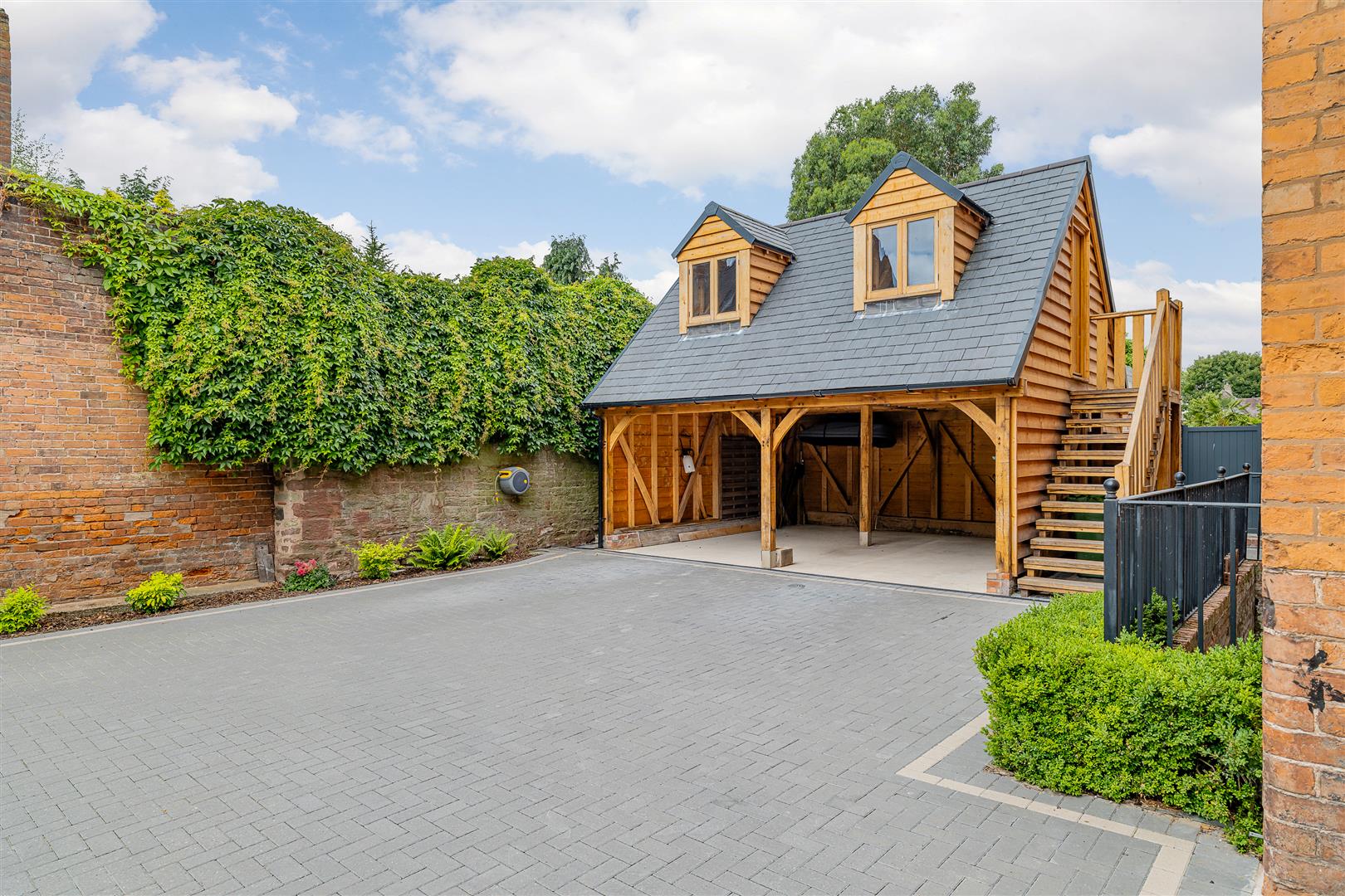 - Timber framed double-bay open garage with room above