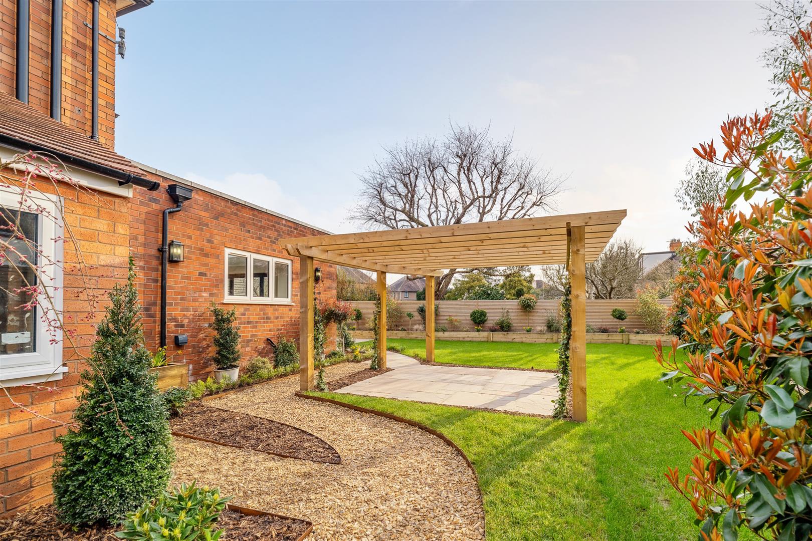 - South facing landscaped garden with potting/storage shed, 2 patios and a pergola, wrapping around to lawned front garden
