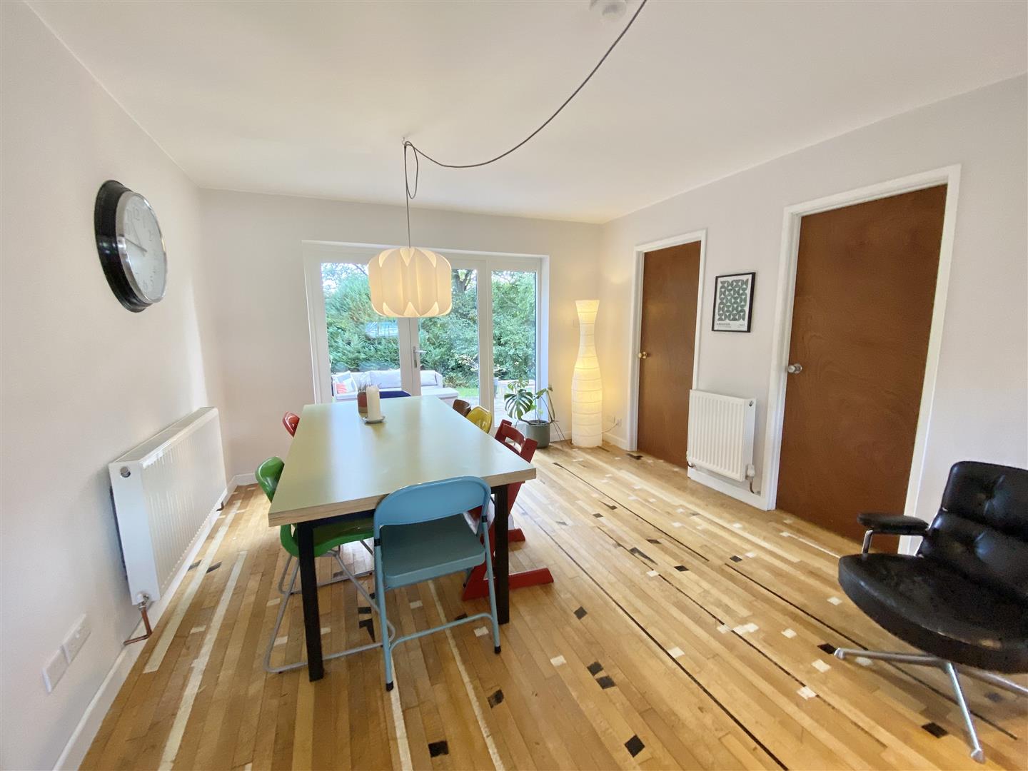 Glazed French doors with side screen opening onto the rear garden