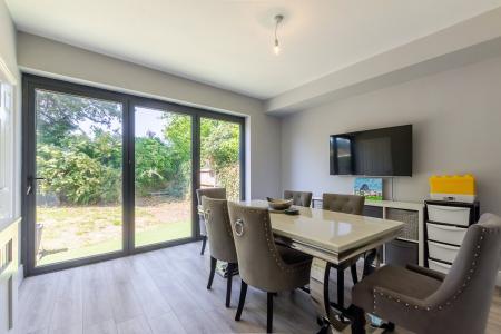 The ground floor comprises a welcoming hallway, a dual-aspect lounge, a separate dining room with bi-fold doors opening onto the rear garden, and a fitted kitchen.