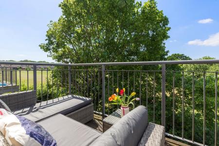 Luxury two double bedroom top floor apartment with own South West facing balcony featuring views of open parkland.