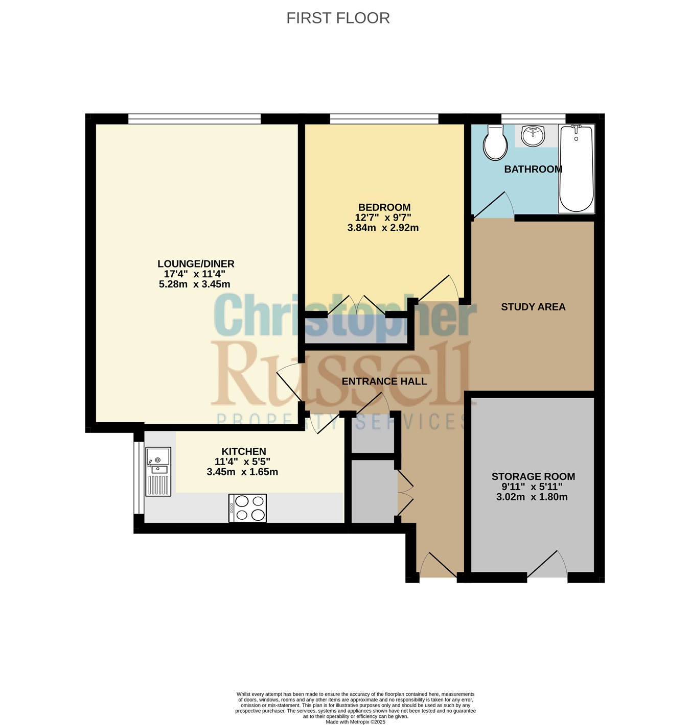 Presented in excellent decorative condition, the accommodation comprises: entrance hall with a unique open-plan study area, lounge/diner, modern fitted kitchen, double bedroom with built-in wardrobe and a contemporary bathroom suite. In addition, there is a large external storage room located next to the flat, complete with power, ideal as a home office, hobby space, or for general storage.