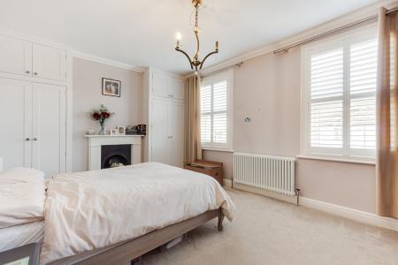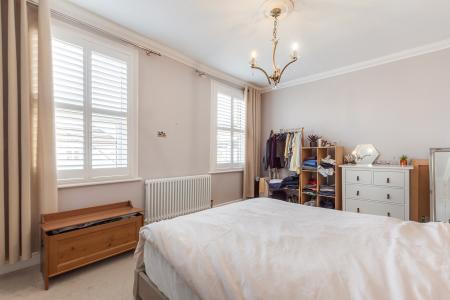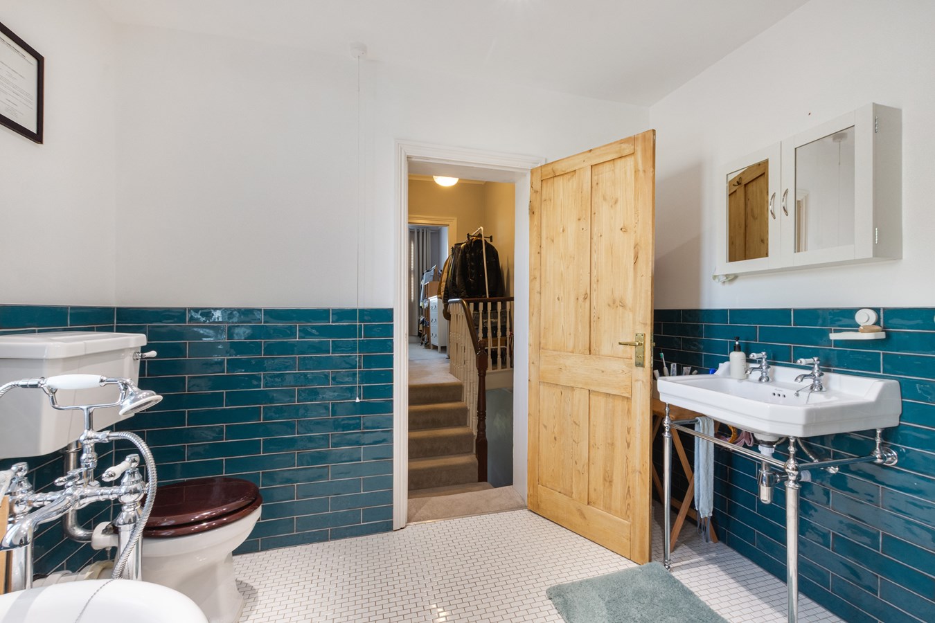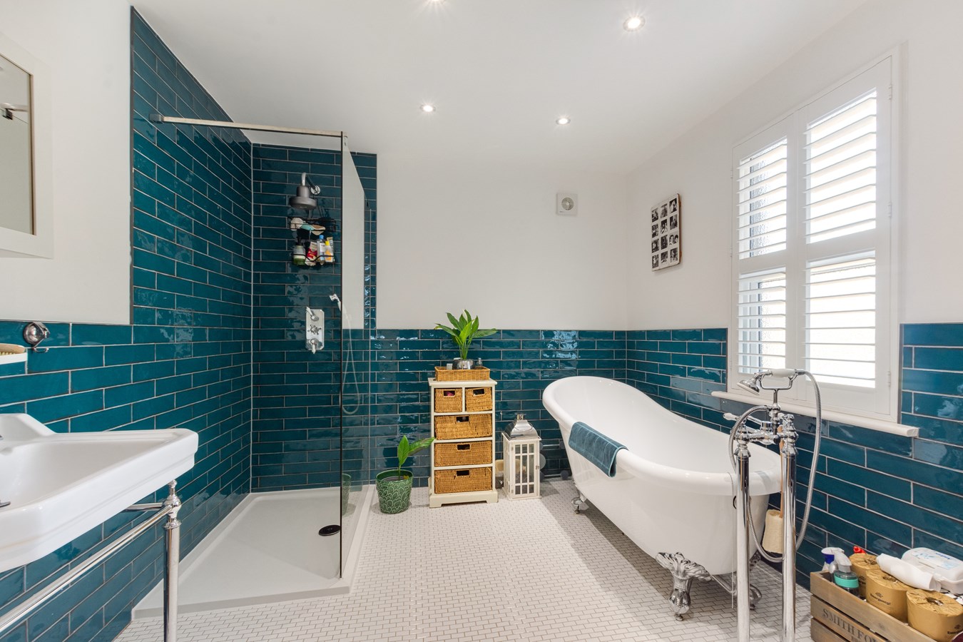 - Traditional four-piece bathroom suite: roll-top claw and ball bath, high flush WC, Victorian-style basin, and walk-in shower