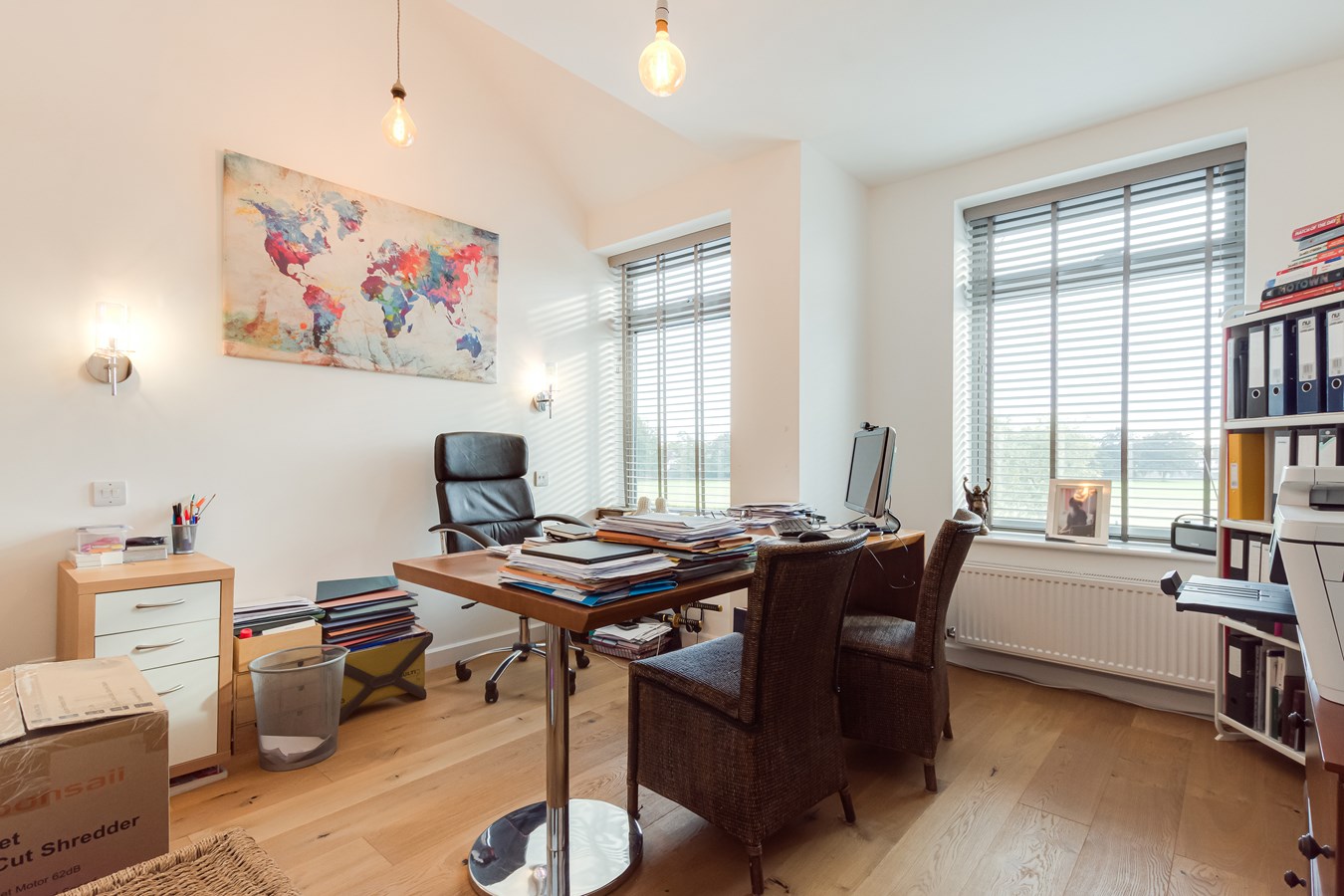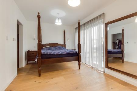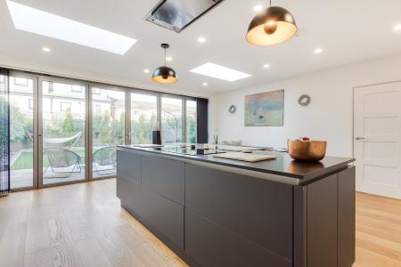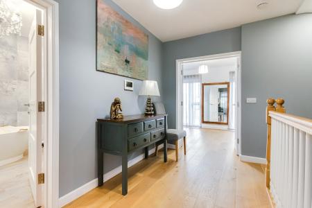 The property boasts a bespoke solid oak staircase and a stunning two-toned luxury fitted kitchen, complete with a central cooking island, integrated appliances, and taps providing instant boiling and filtered water. Bi-fold doors with one way glass seamlessly connect the kitchen/family room to the rear garden, creating a perfect indoor-outdoor living space. The luxury-fitted bathrooms and en suites are finished to a high specification, while the main bedroom benefits from a walk-in wardrobe, twin full-length windows, and double doors opening onto a Juliet balcony with views over the rear garden.