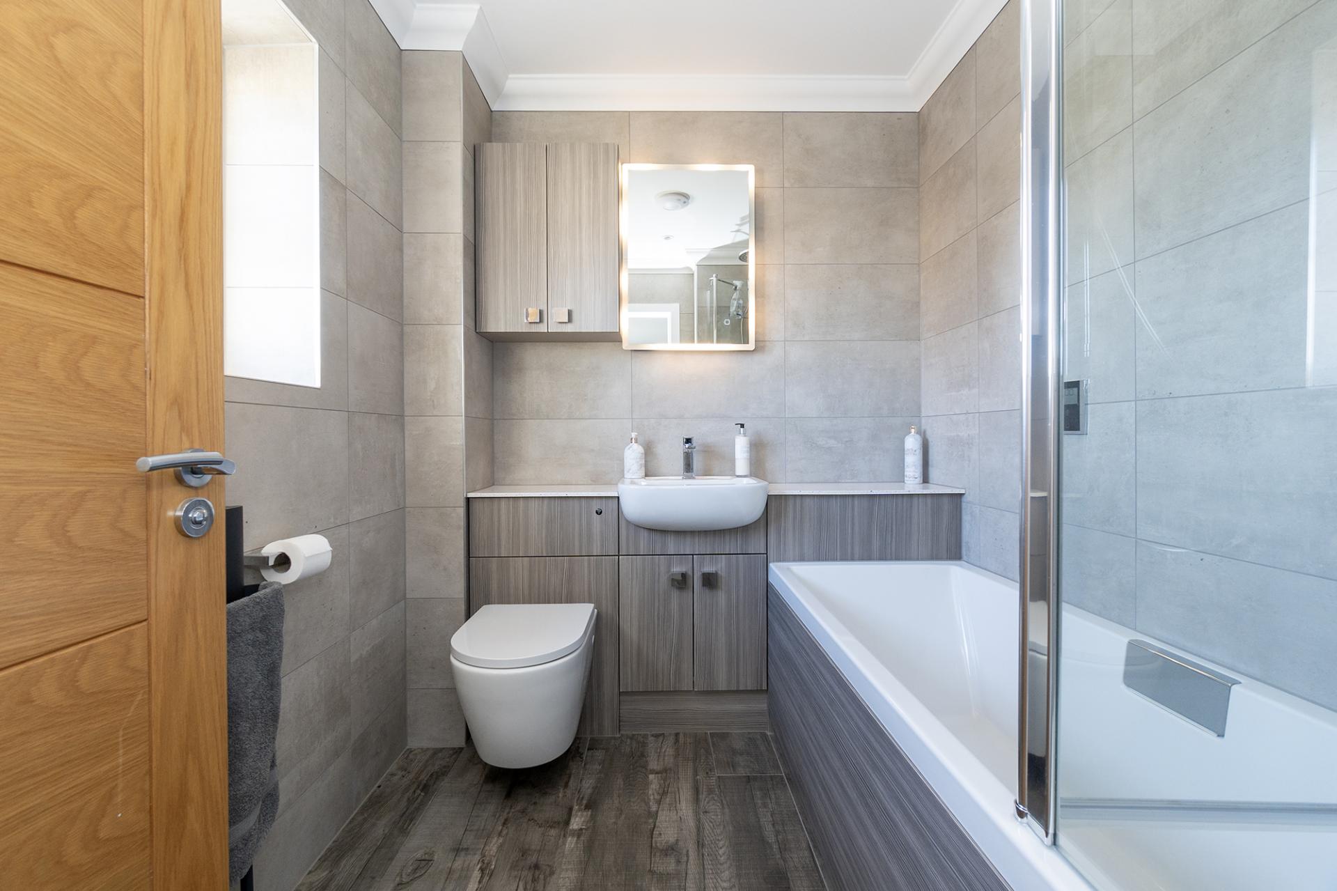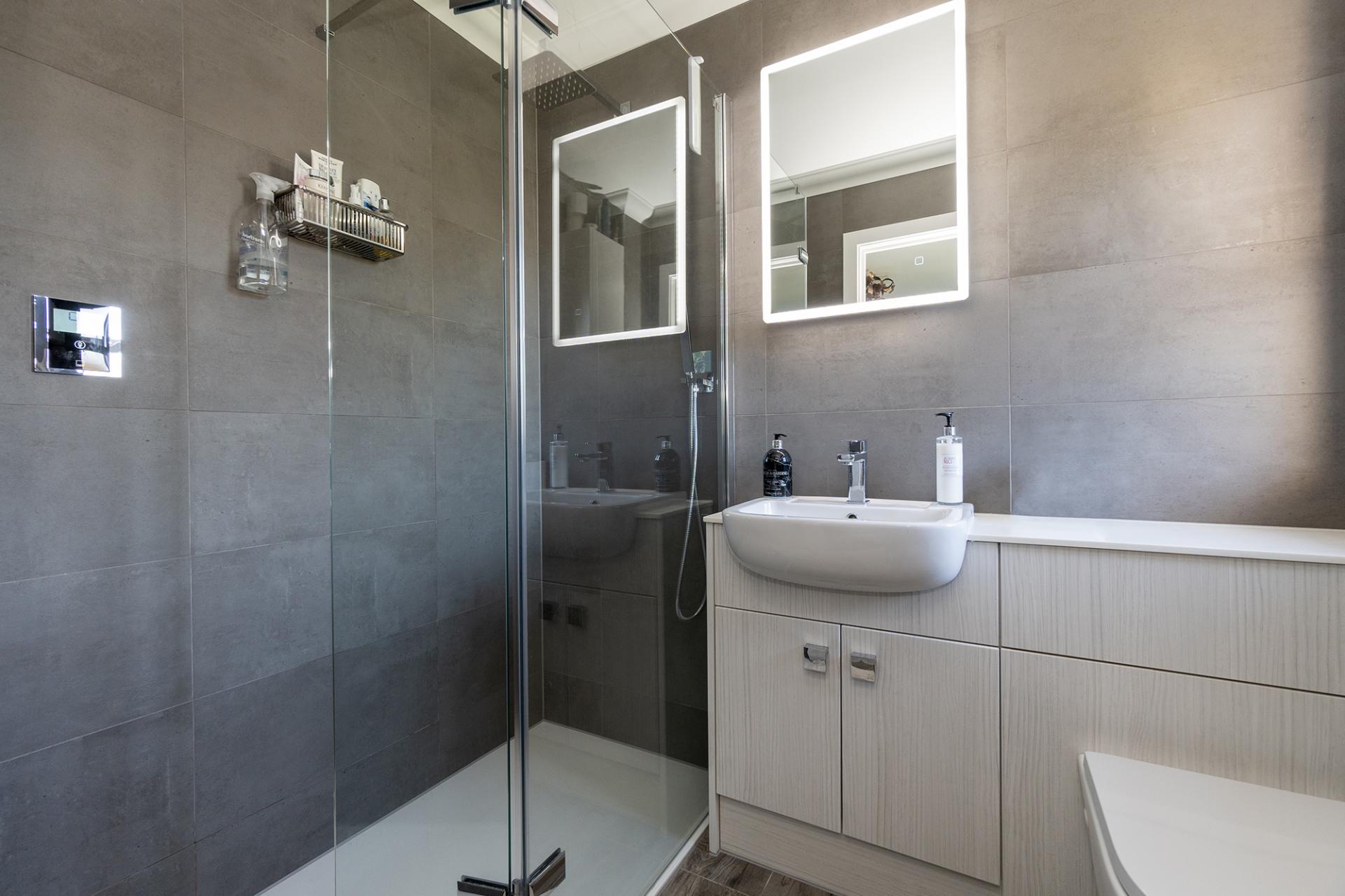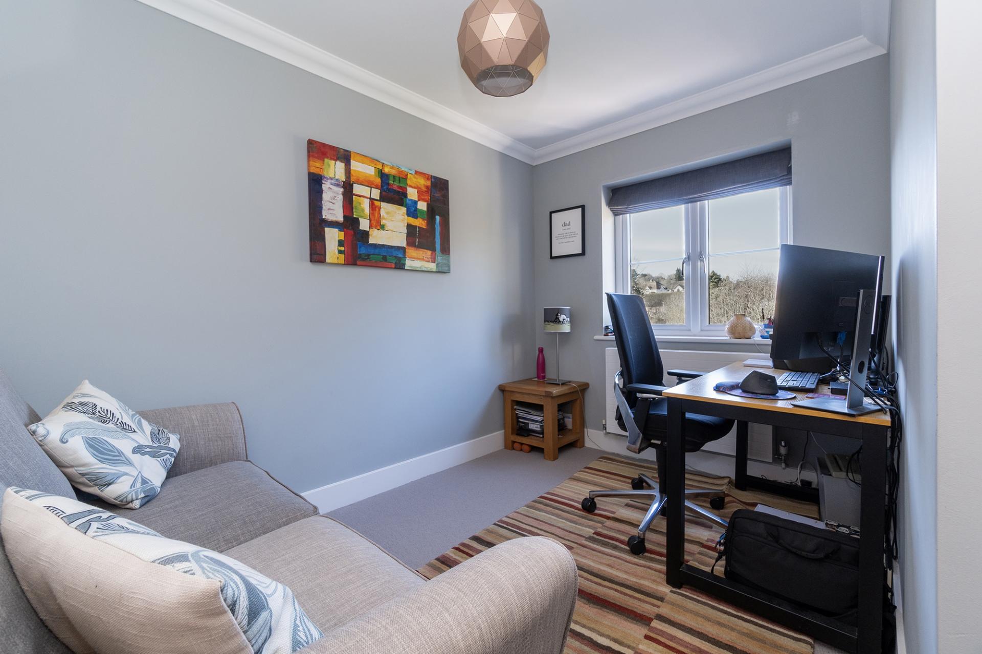 On the first floor the main bedroom has both an en suite shower room and spacious dressing room that is fitted with an excellent range of hanging, drawers, and shelved storage with vanity unit. The room was originally a fourth bedroom and subject to some minor alteration could return to the original configuration if required. Bedroom two is a good size double and bedroom three is currently used as a study/double bedroom. The main bathroom, as with the en suite, is very well appointed with high quality materials to include ceramic floor tiles, electronic, power shower and automatic night lighting.