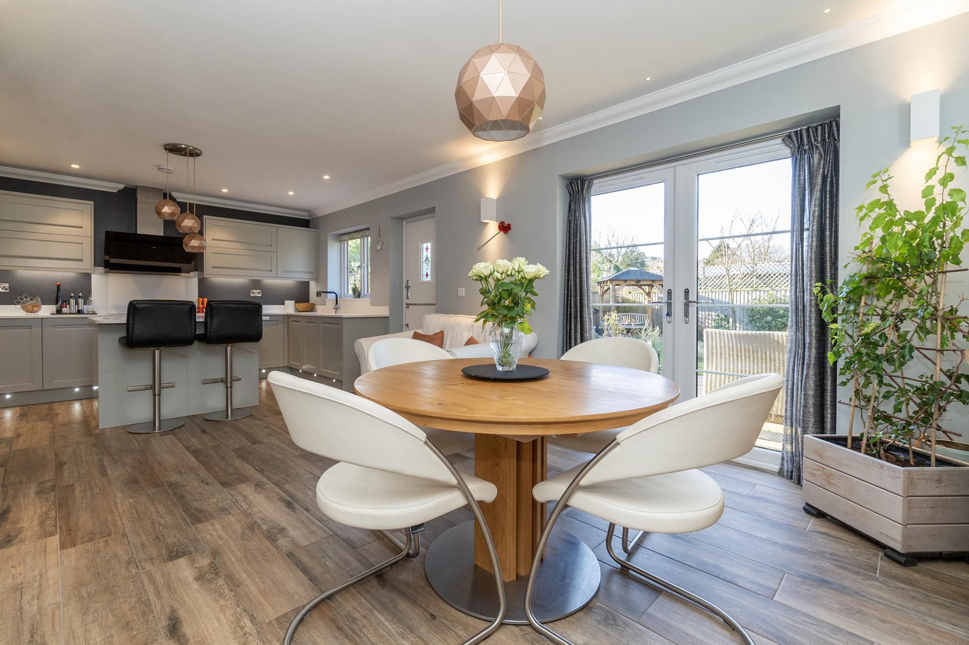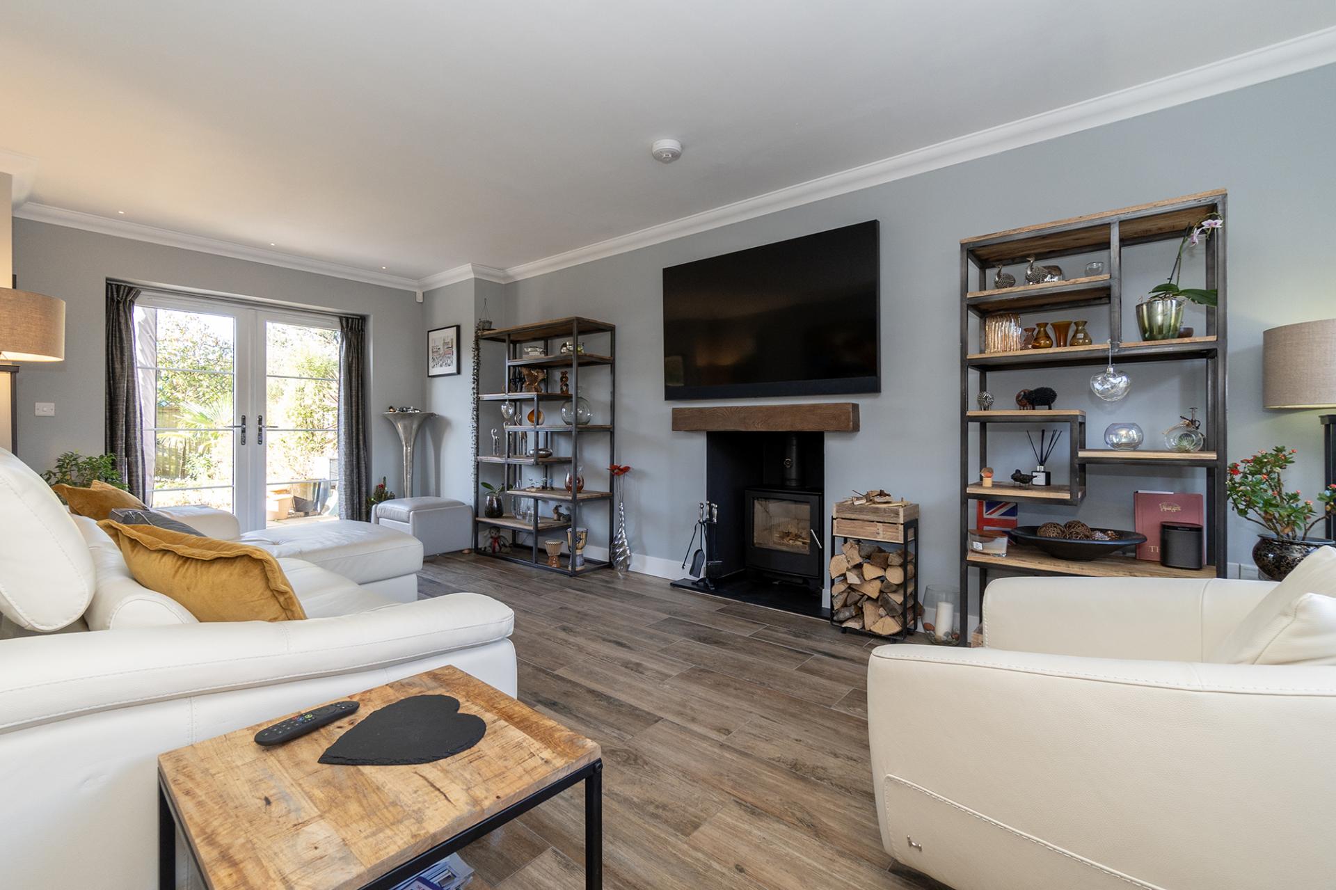 Built less than eight years ago and with an NHBC certificate valid until 4 April 2029, this executive, family home comes with a high quality fit and finish throughout. The house is heated by a combination of gas fired underfloor heating to the ground floor, radiators to the first floor and electric underfloor heating to the bathrooms. An open porch leads into the entrance hallway where there is good storage and a cloakroom/WC. Ceramic tile flooring runs throughout the ground floor to a spacious, double aspect sitting room with log burning stove and patio doors opening into the rear garden. A large kitchen/dining room, in excess of 23’ long, has patio doors and a stable door also to the rear garden.