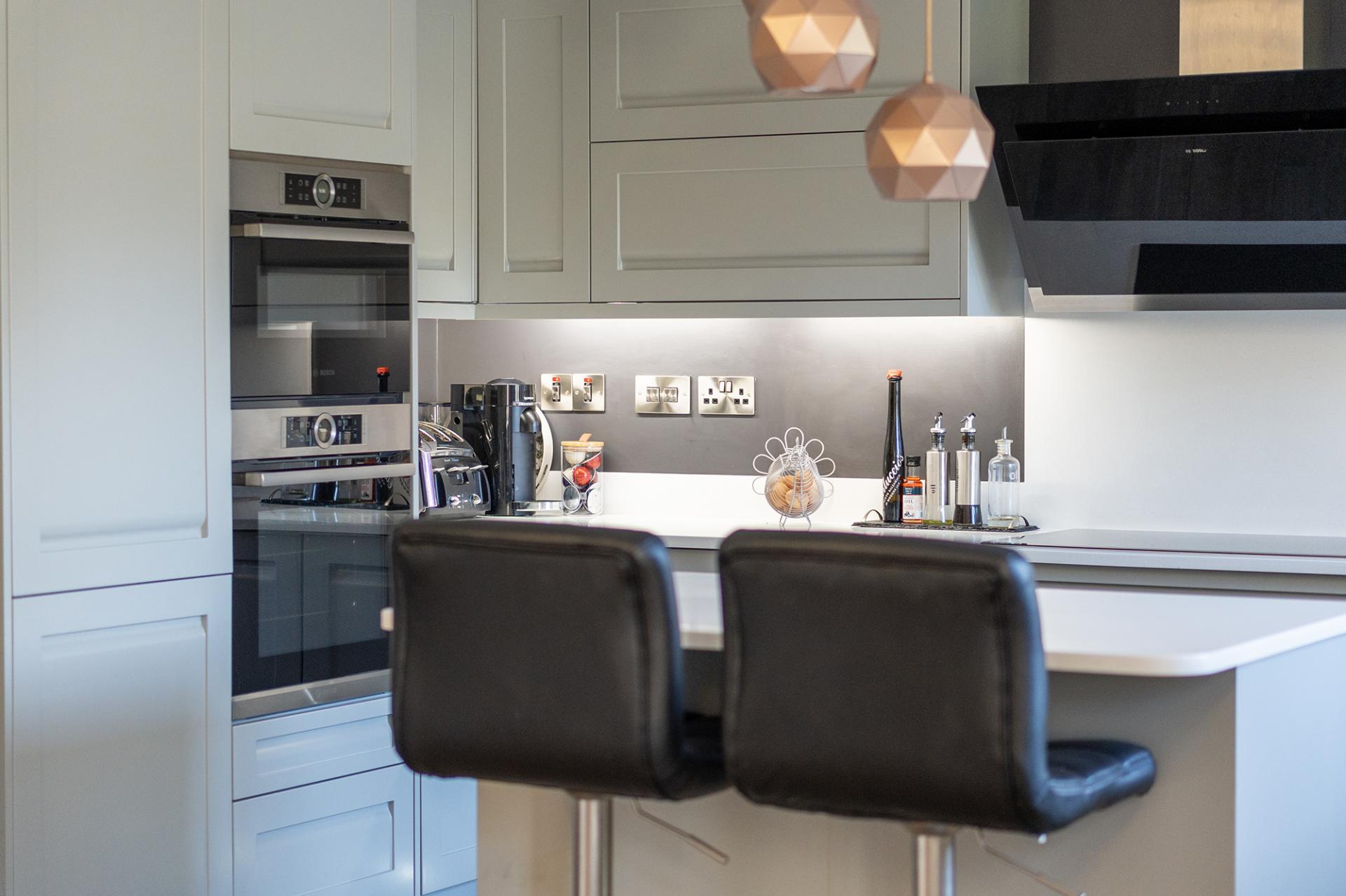 The kitchen is fitted with a range of stylish units with built-in Bosch appliances to include fridge/freezer, twin ovens, microwave, induction hob, extractor, and a dishwasher. Worksurfaces and upstands are Corian, the preparation island having the same along with a wine cooler and breakfast bar with pop-up sockets. The utility room is fitted with a range of storage units with appliance spaces and has a connecting door to the double garage.