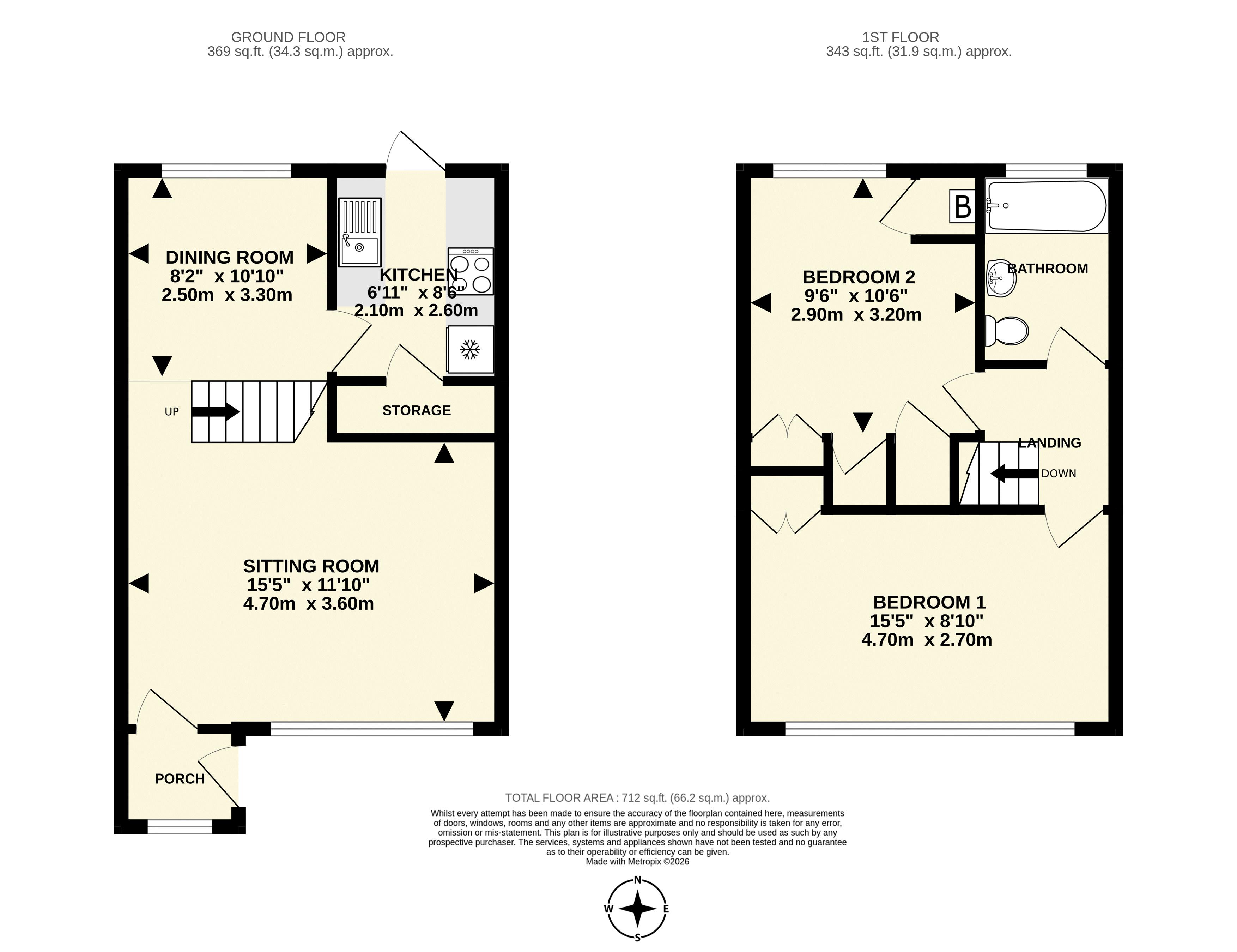 On the first floor, the main bedroom is particularly spacious with numerous windows to the front aspect and a built-in wardrobe. There is a second double bedroom, taking in a fine view across the village to countryside beyond. There is a built-in wardrobe and storage and a cupboard housing the gas combination boiler (serviced in July 2025). The bathroom is fitted with a white suite featuring a mains shower over the bath.