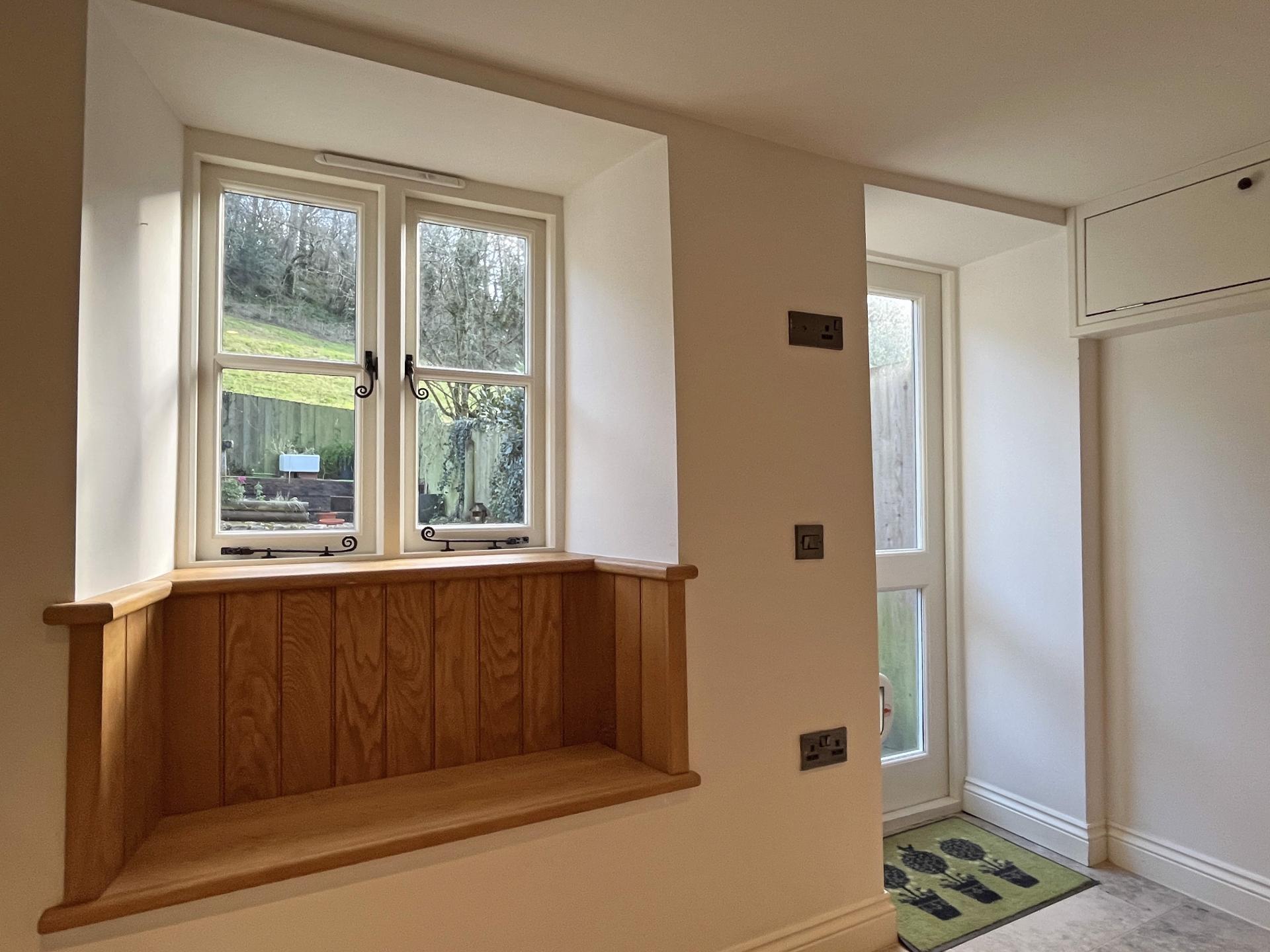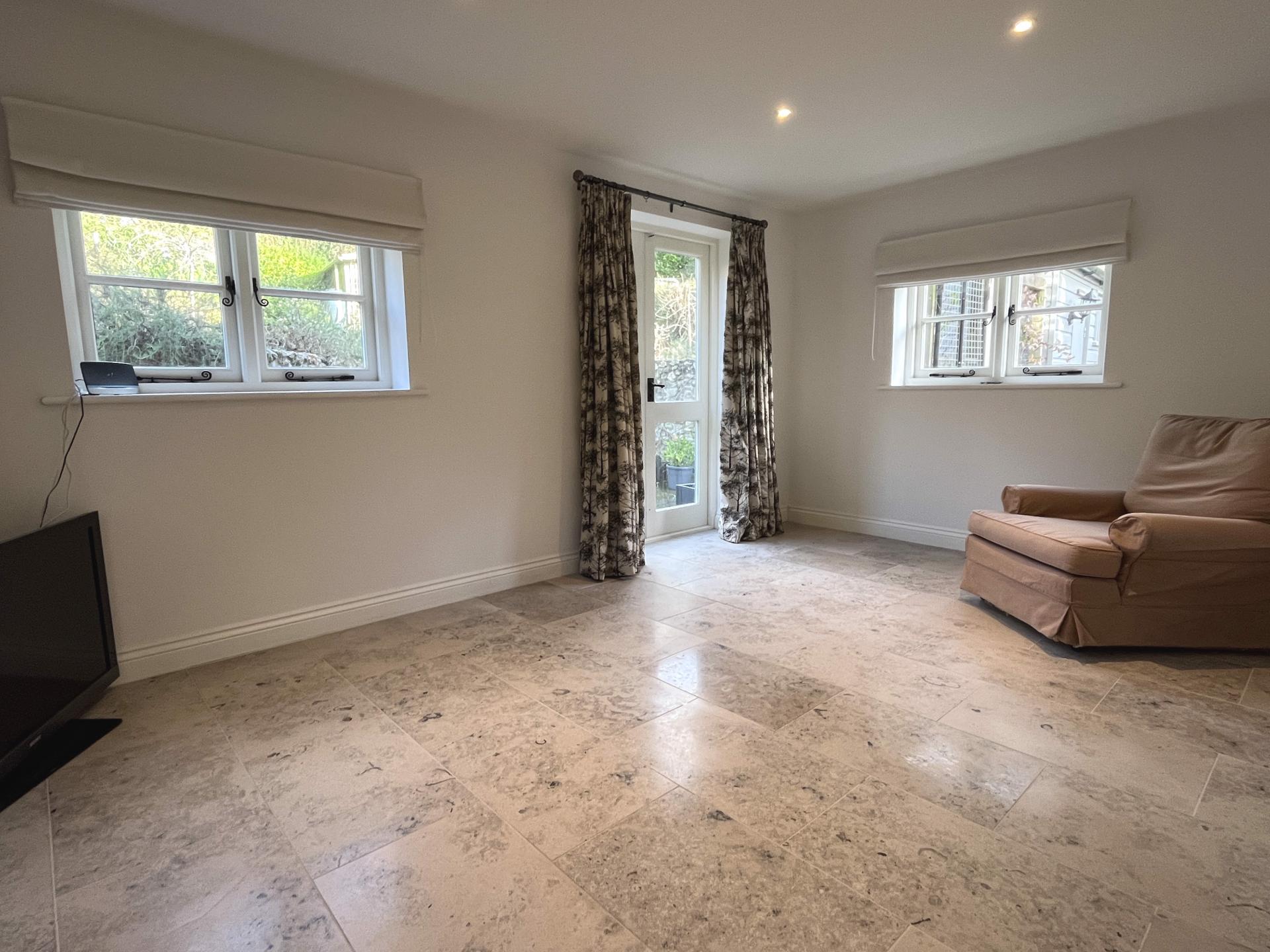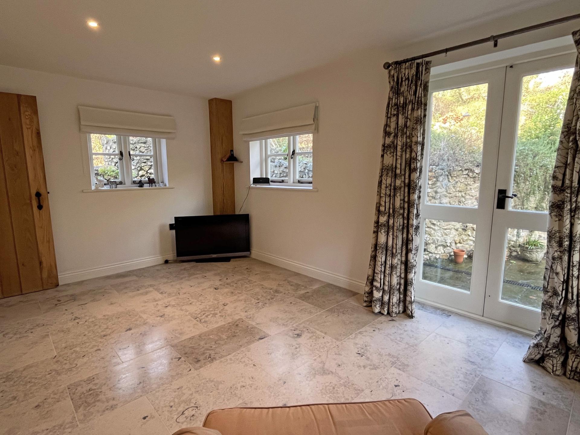 The sitting room which forms part of the new extension enjoys a triple aspect and has French doors leading into the garden.