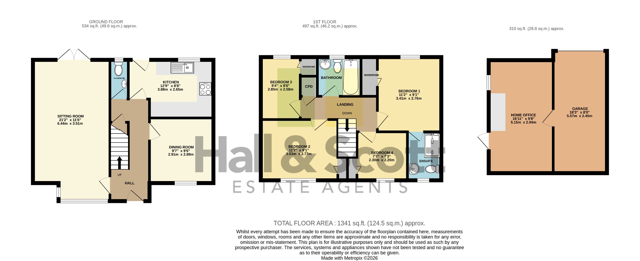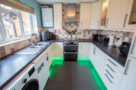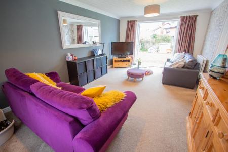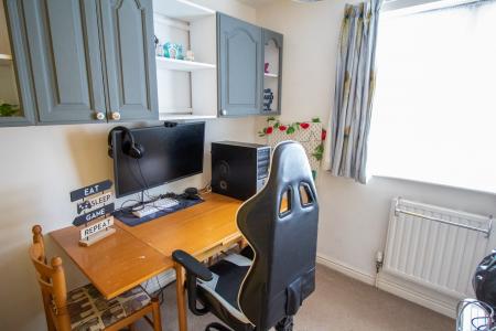 The property has ample parking with a double-wide driveway leading to the double garage. One half of the garage has been converted to create a home office (5.15m x 2.94m) with light and power window and a door to the garden, the other half remains a garage (5.57m x 2.45m) up and over door light and power and a pedestrian door into the office. The rear garden is a good size, laid mainly to lawn, with a paved patio. To the other side of the property is a utility area useful for a freezer, tumble dryer or bike store.