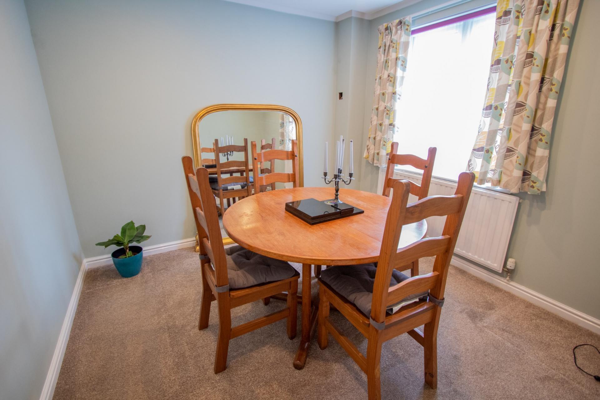 The accommodation comprises: entrance hallway, cloakroom, kitchen fitted with a range of units, worktop surfaces and integrated fridge/freezer. There is a separate dining room and a spacious dual-aspect living room with French doors overlooking the rear garden.