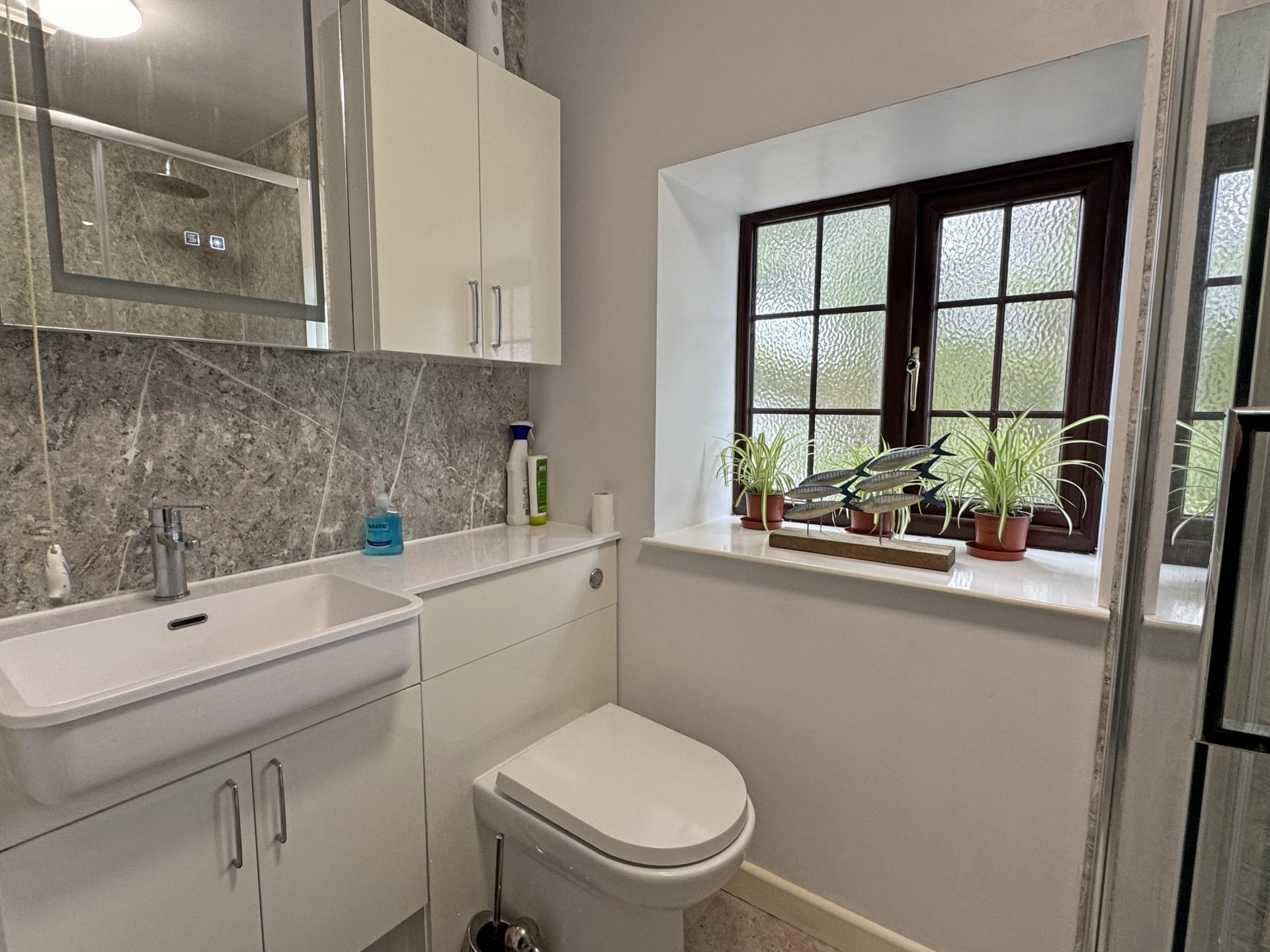 The first floor landing opens to three bedrooms, the main bedroom enjoying a dual aspect and having fitted wardrobes. A separate shower room is attractively fitted with a modern white suite and comprises a shower cubicle, WC and wash basin with vanity storage cupboard.
