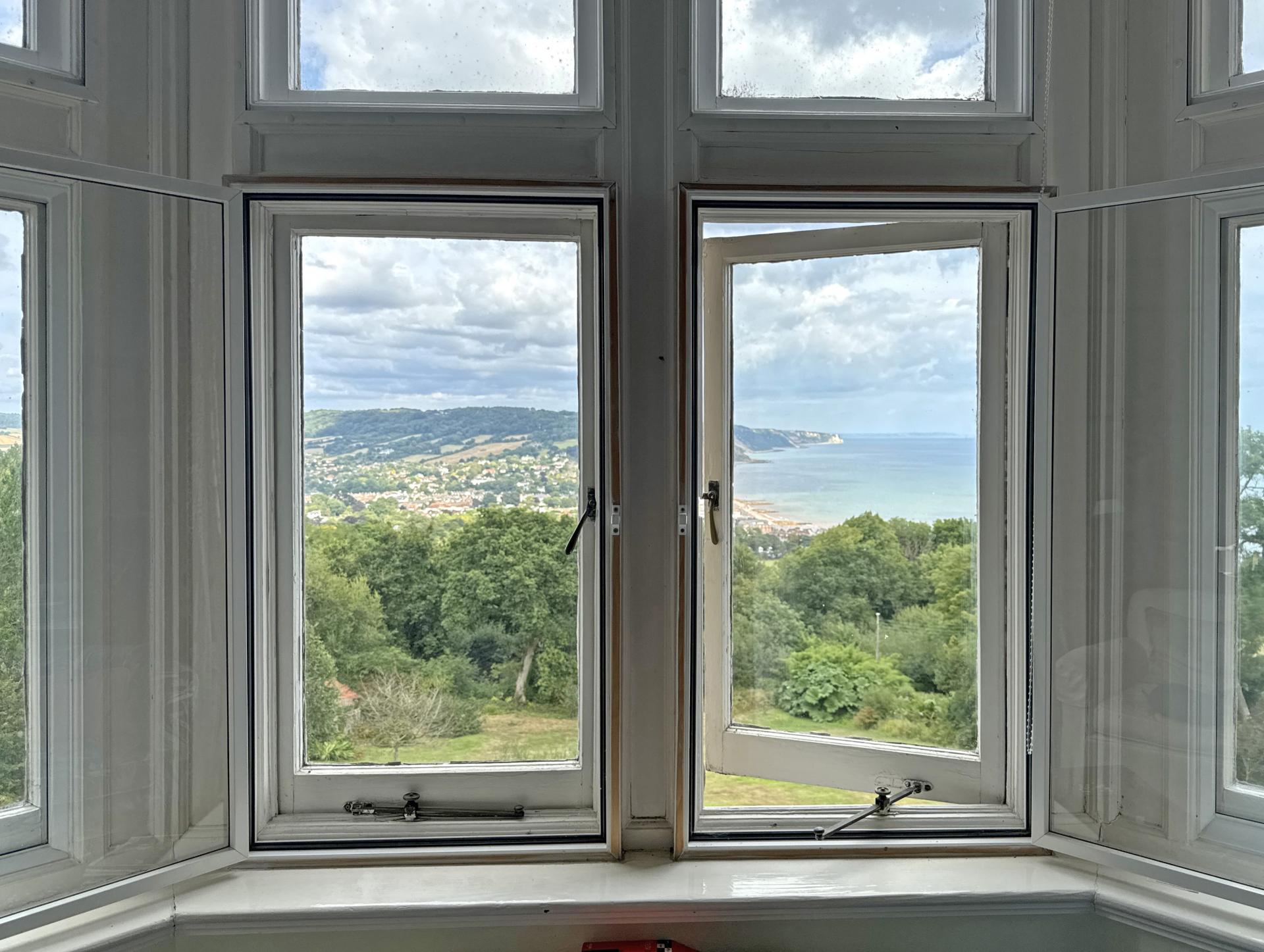 A spacious, first floor apartment providing impressive accommodation of around 1200 sq ft, featuring high ceilings, tall bay windows and a simply breathtaking view over The Sid Valley and out to sea.