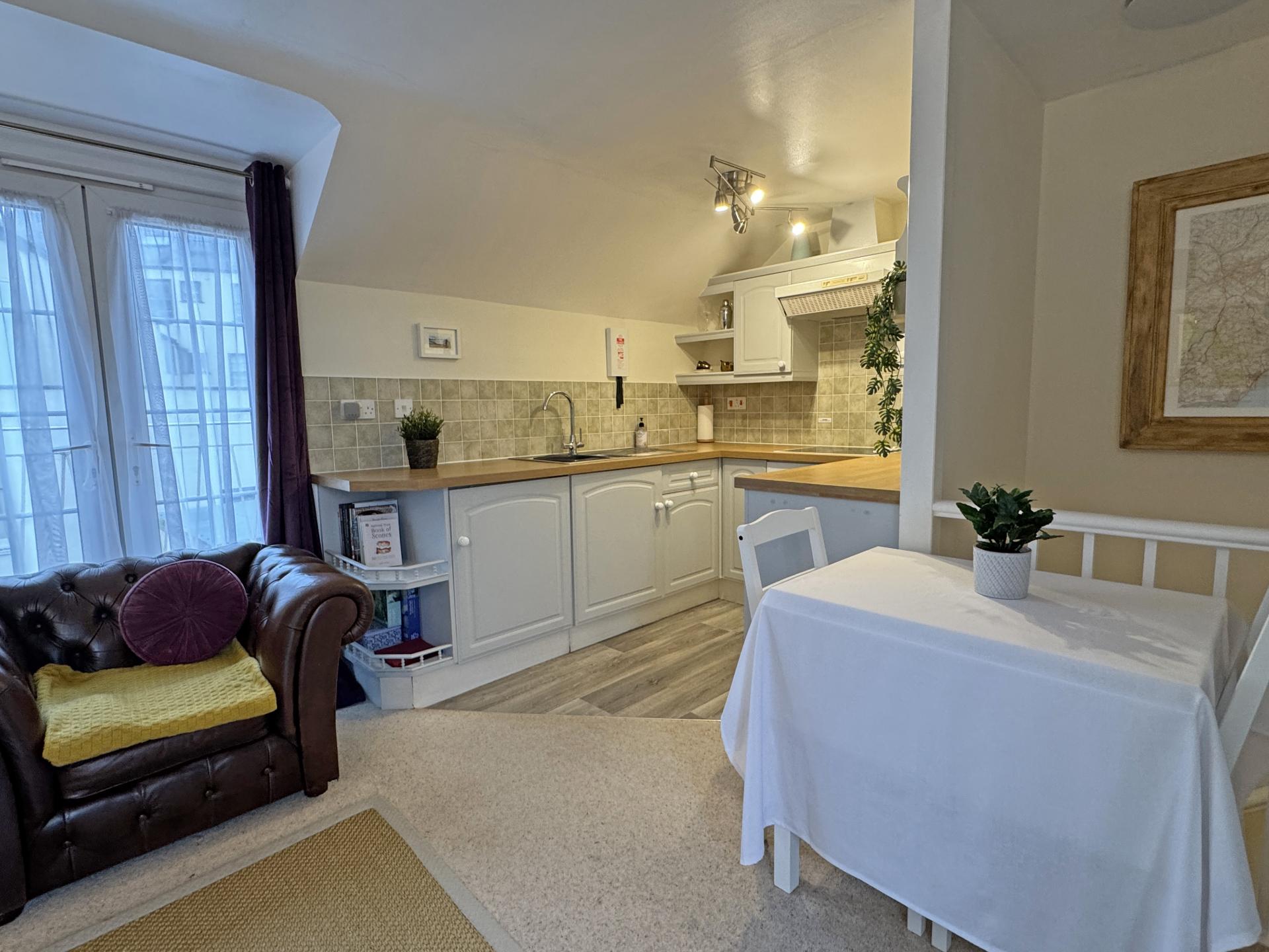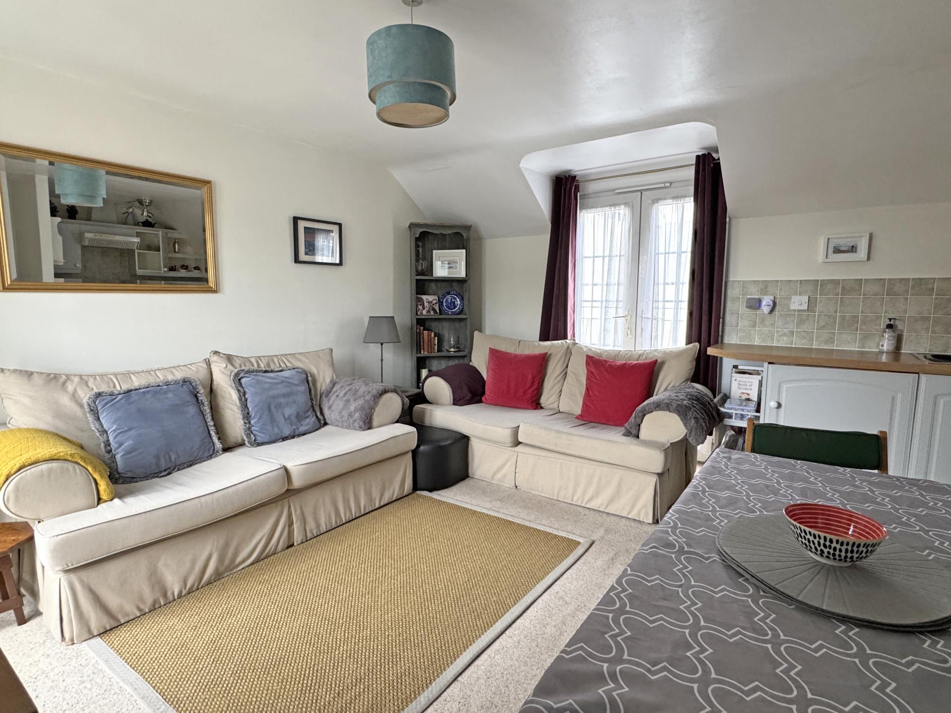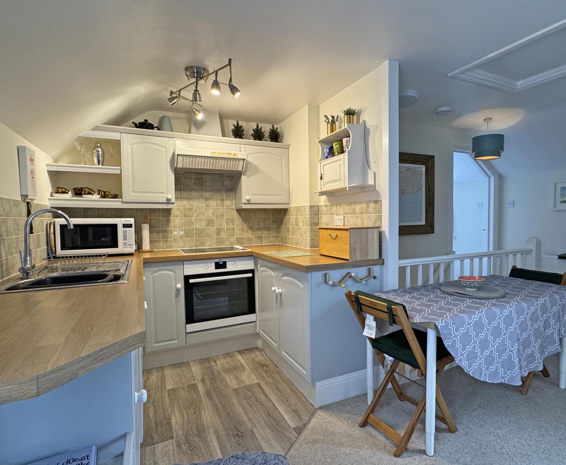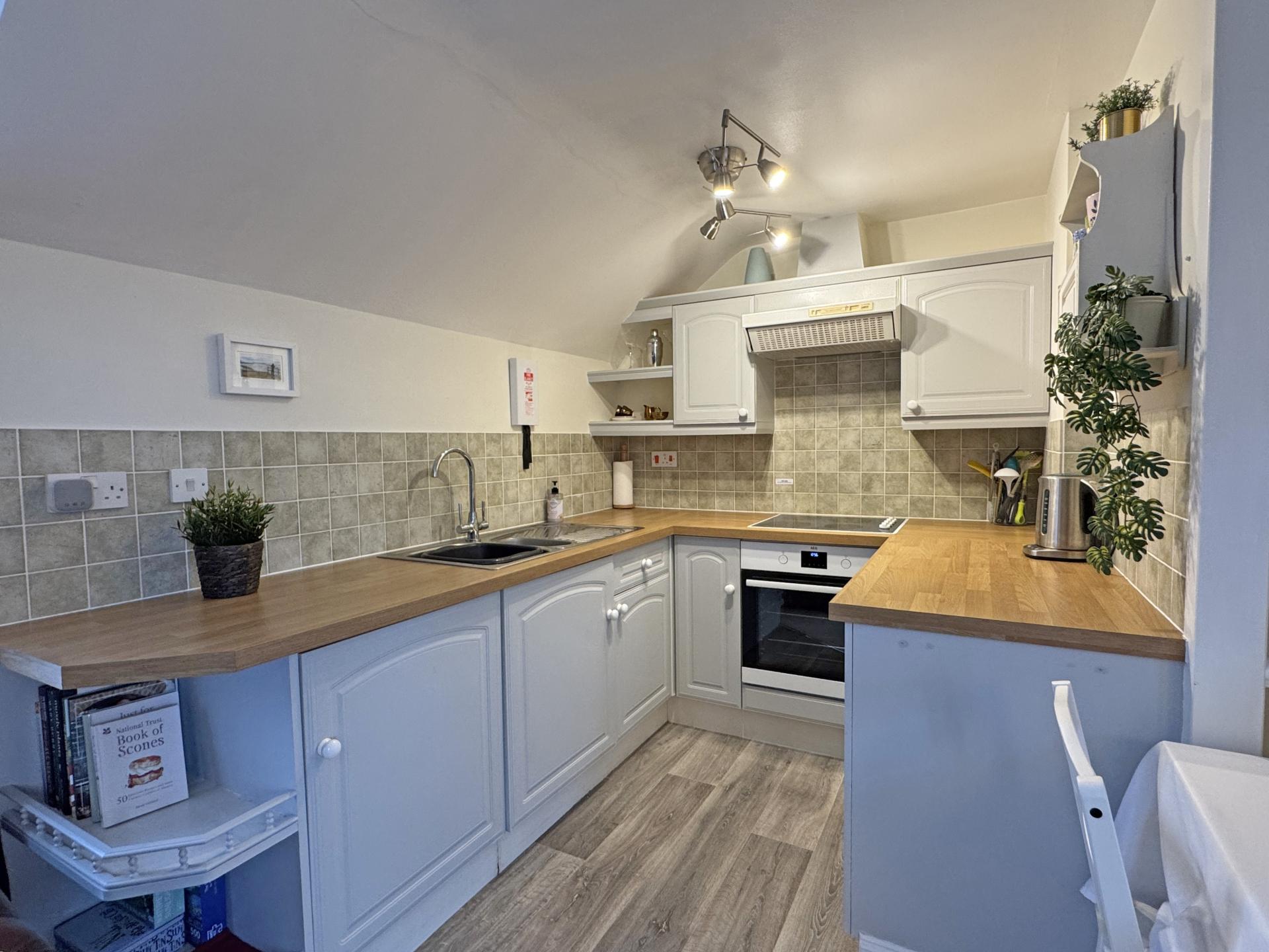 To the first floor, the open plan living space takes full advantage of its dual aspect east and west and the adjoining kitchen offers a range of cupboards and worksurfaces, providing ample storage. Appliances comprise a built-in electric oven, hob, cooker hood and integrated fridge.