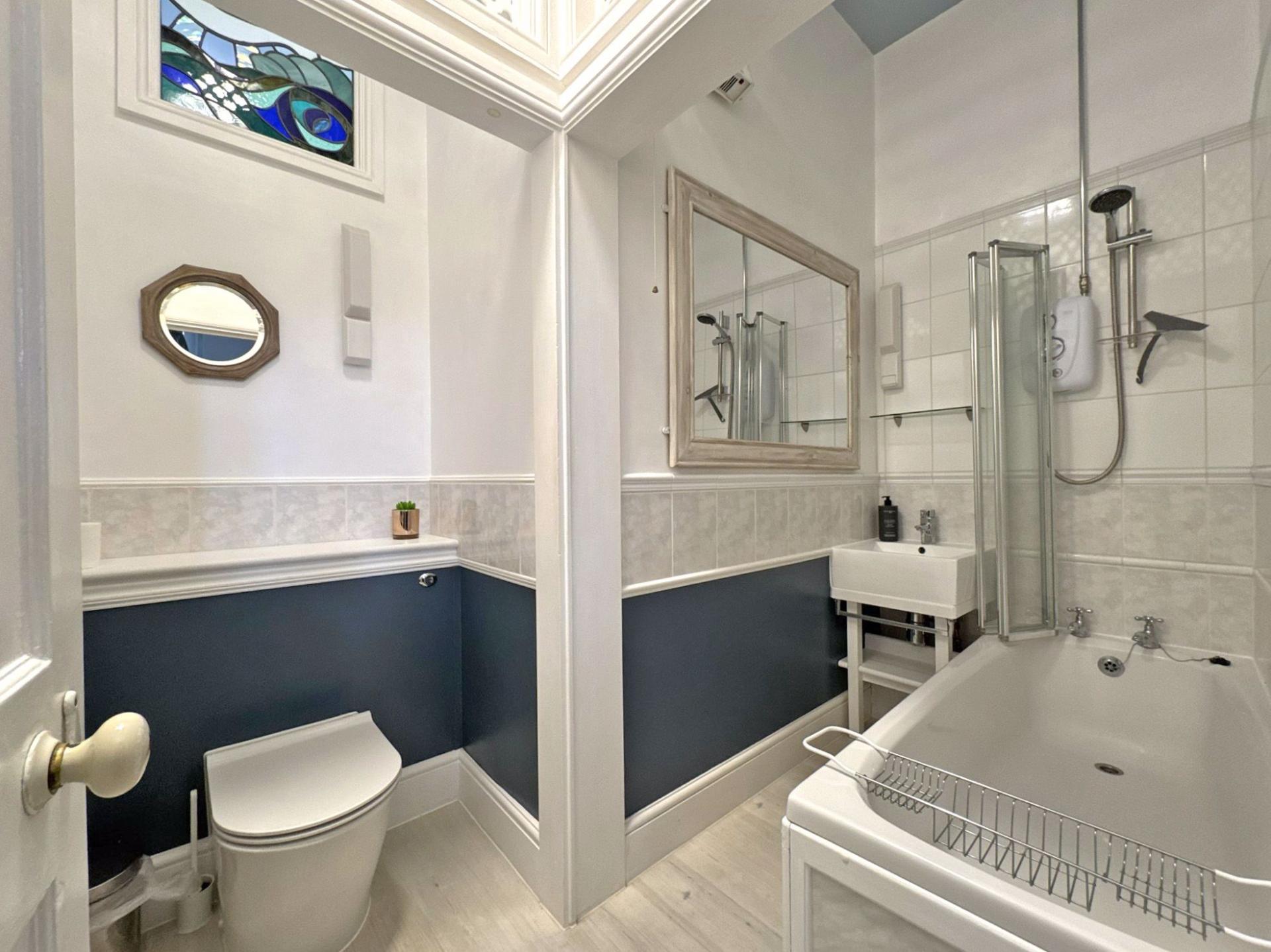 Today the property has modern comforts such a gas central heating and modern kitchen and bathroom fittings. The apartment is accessed at the rear via a secure entrance to stairs rising to the first floor. A front door then gives access to a further flight of stairs leading to the kitchen/dining room. The kitchen is fitted with a range of modern units to include a built-in oven, grill and electric hob and with space for a fridge/freezer and dishwasher. A utility room off has space and plumbing for a washing machine and tumble dryer and a cupboard housing the gas boiler. A long inner hallway leads to a spacious second bedroom with rear facing window and en suite shower room. The main bathroom is also off the hallway.