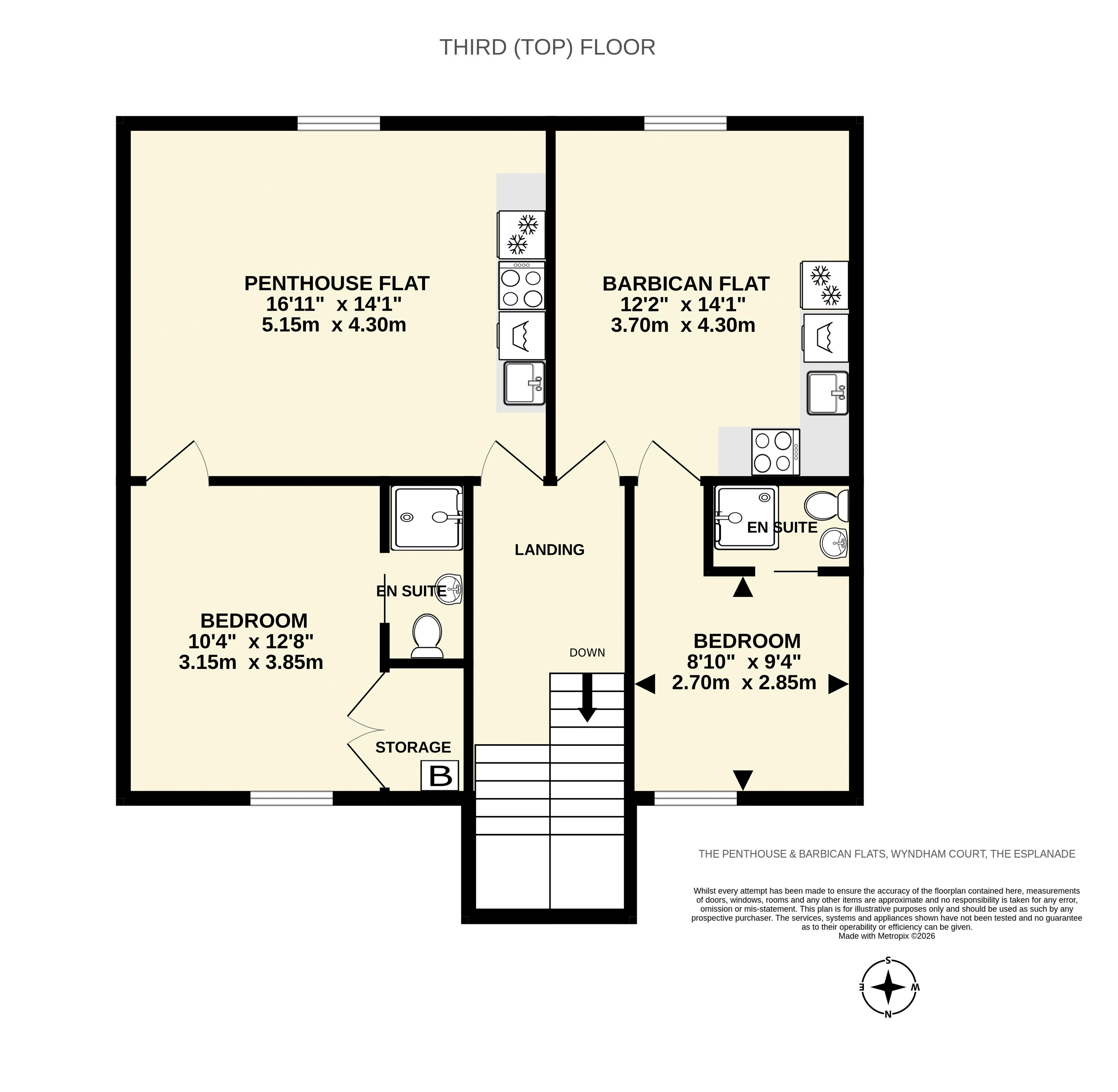 The Penthouse flat is the larger of the two comprising open-plan sitting/dining/kitchen with a south facing window taking in a stunning view over The Esplanade and out to sea. The kitchen area is fitted with an electric hob, storage and includes a washing machine and fridge/freezer. To the rear is a double bedroom with built-in storage, en suite shower room and a fine view over the town and up The Sid Valley. A combination boiler installed in January 2025 provides central heating and hot water to both flats.