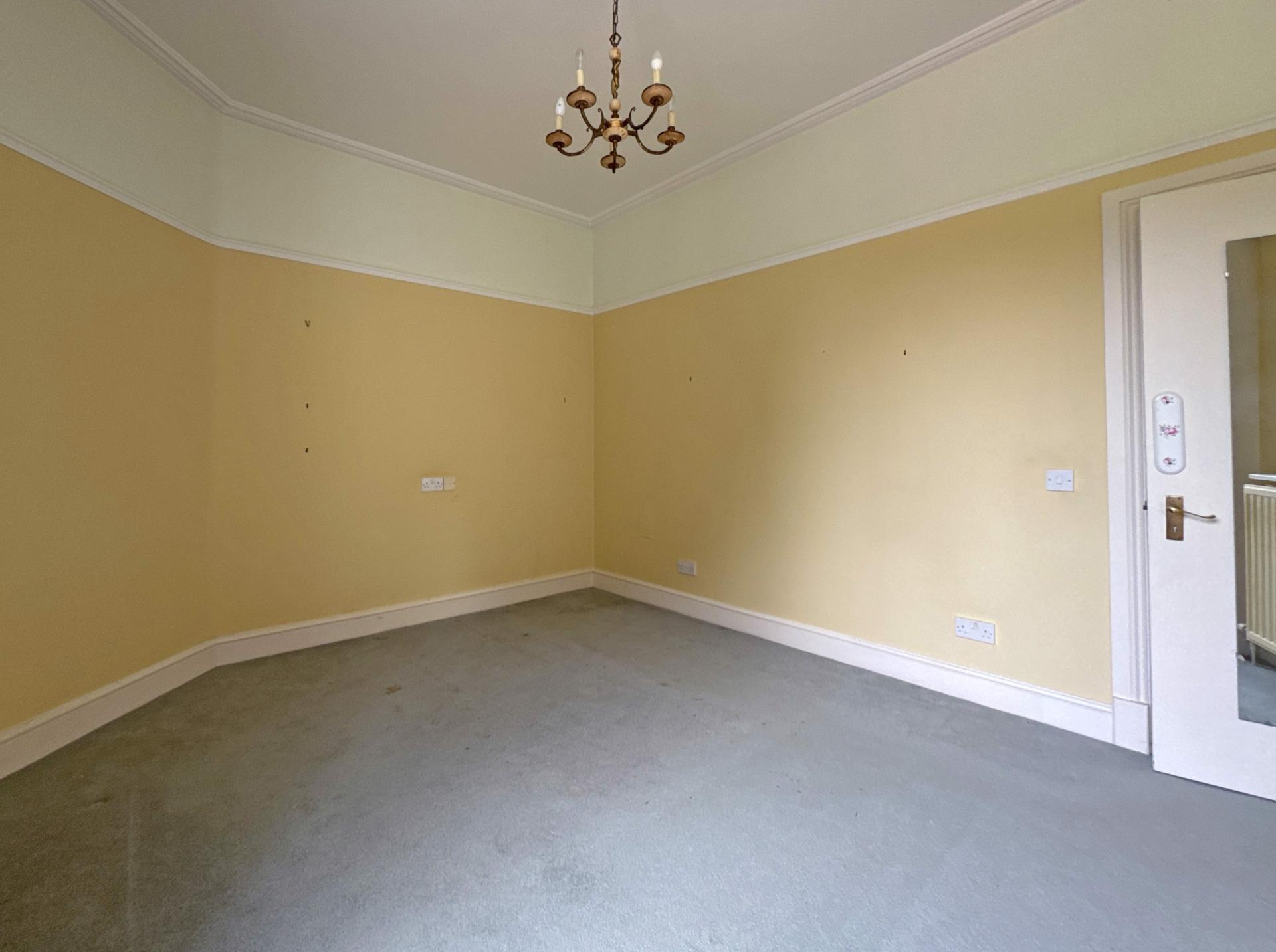 Offered for sale with no on going chain is this first floor converted apartment with features including high ceilings with period coving, ceiling roses, tall sash windows and gas central heating. The communal entrance is via period timber doors with a telecom entry system opening into an entrance hall with cloakroom. An inner hallway passes the laundry and owners lounge which has glazed doors opening onto a south facing veranda. An original, wide staircase with stair chair rises to the first floor. Once inside the property the hallway has a high ceiling and two storage cupboards. The sitting/dining room is double aspect with tall sash windows, one having a view to the west overlooking the mature grounds. A period marble fireplace has a large mirror over. The kitchen has a range of fitted units with a freestanding electric cooker, fridge and freezer. There is also a breakfast bar, over head cupboards and a wall mounted gas boiler.