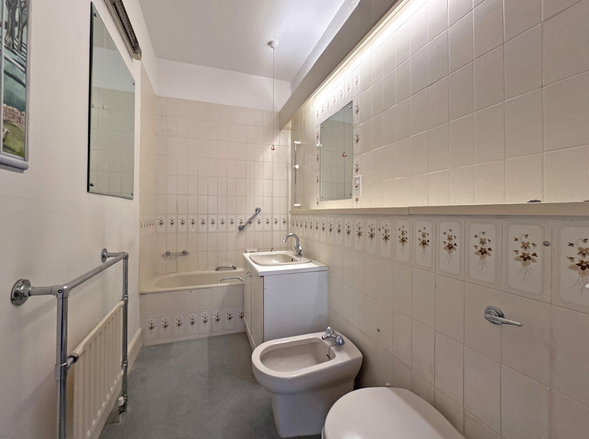 The bedroom is of a good size with a tall sash window and built in wardrobes. The adjacent bathroom is fitted with a suite comprising bath, wash basin, bidet and WC.