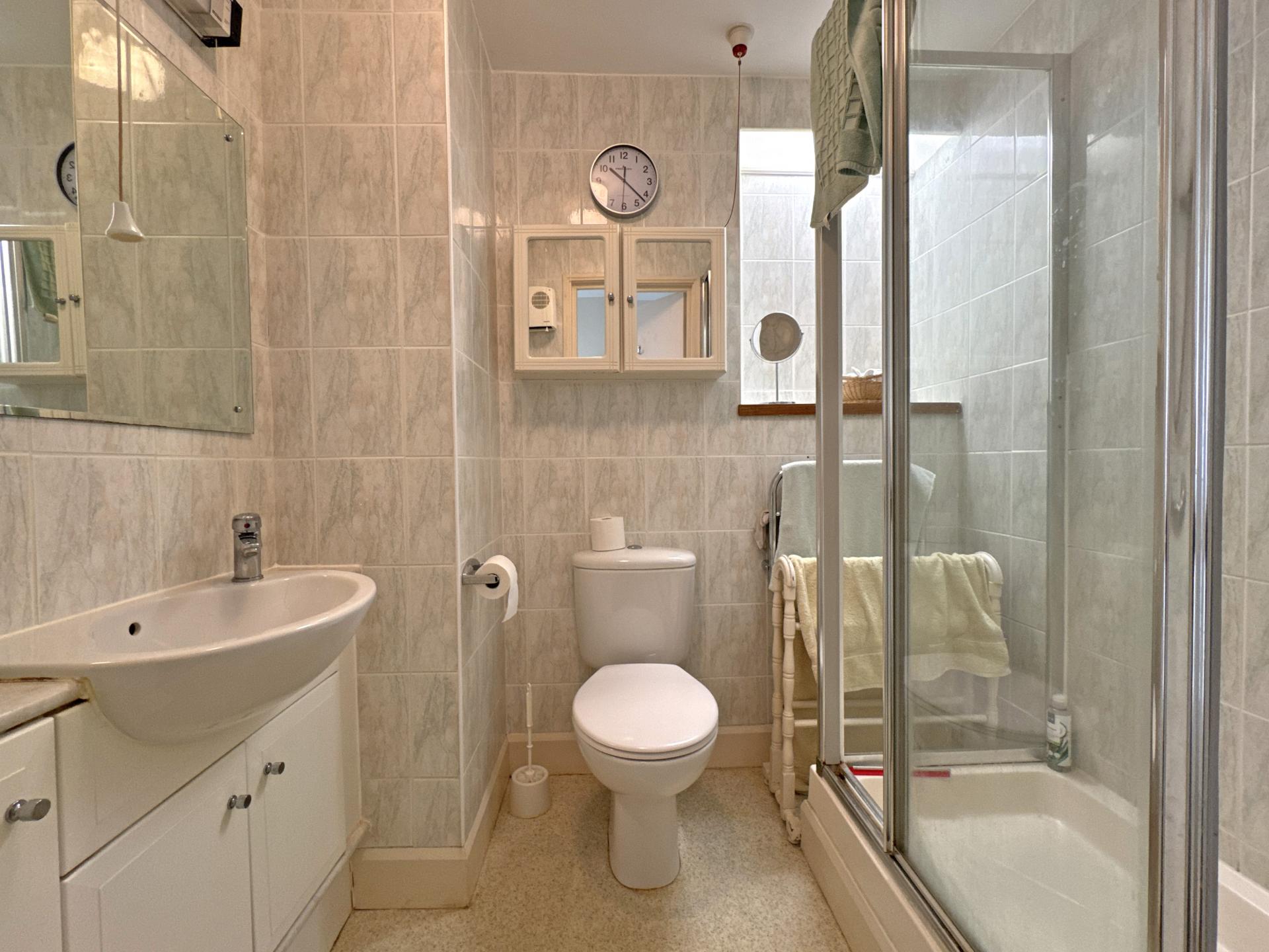 The main bedroom is a large double and there is a second double bedroom, both rooms having south facing sea views. The shower room has an electric shower, WC and basin and there is also a separate WC.