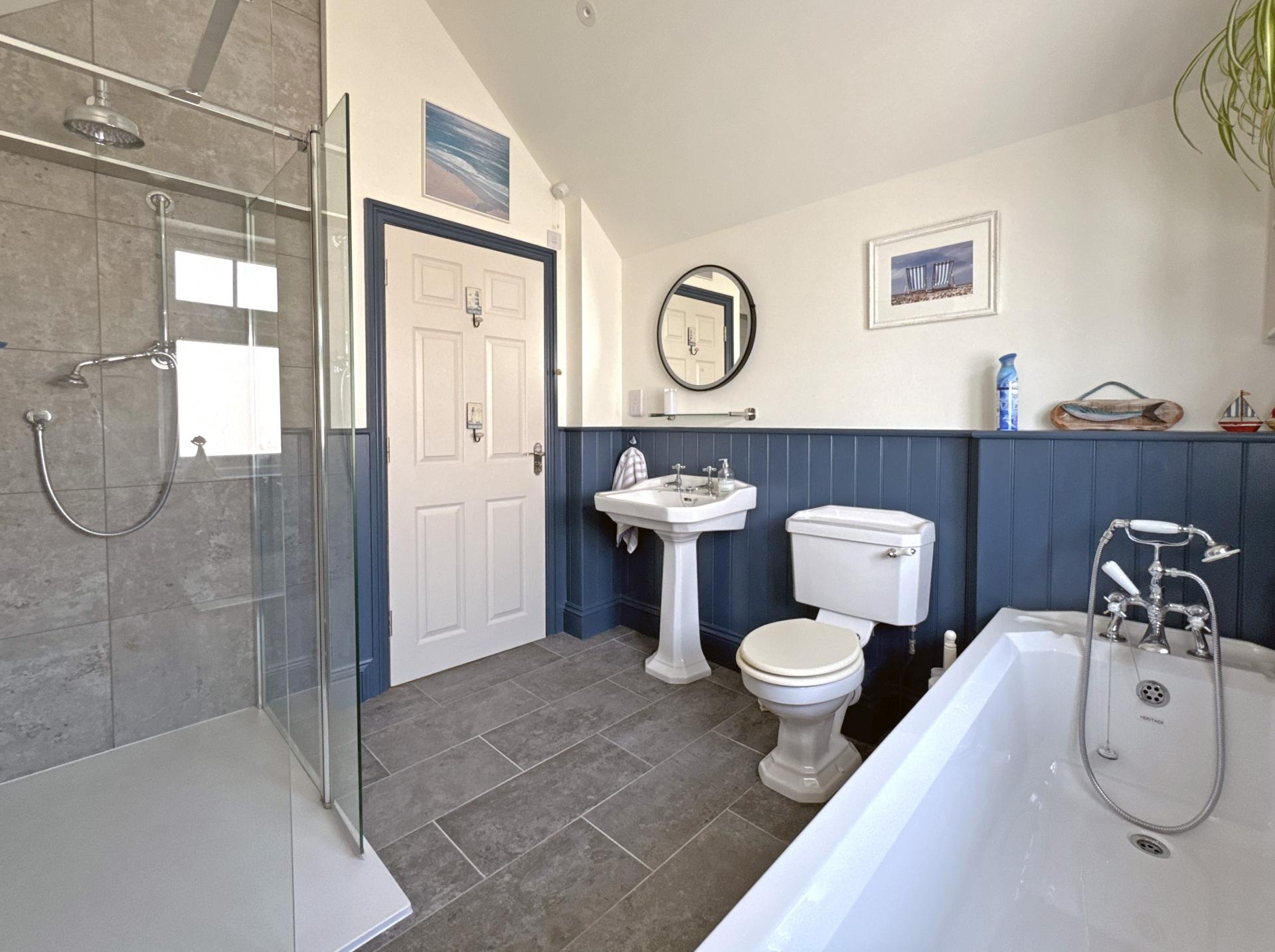 On the first floor, the large main bedroom has a bay window overlooking the river and a second double bedroom has fitted wardrobes and storage. There is a beautifully presented bathroom with separate shower cubicle, all fitted and finished to a particularly high standard. On the second floor, a generous third bedroom takes in an impressive west facing view over the river and ford and across the valley to Muttersmoor. The fourth bedroom is a spacious single room and lastly there is an impressive shower room.