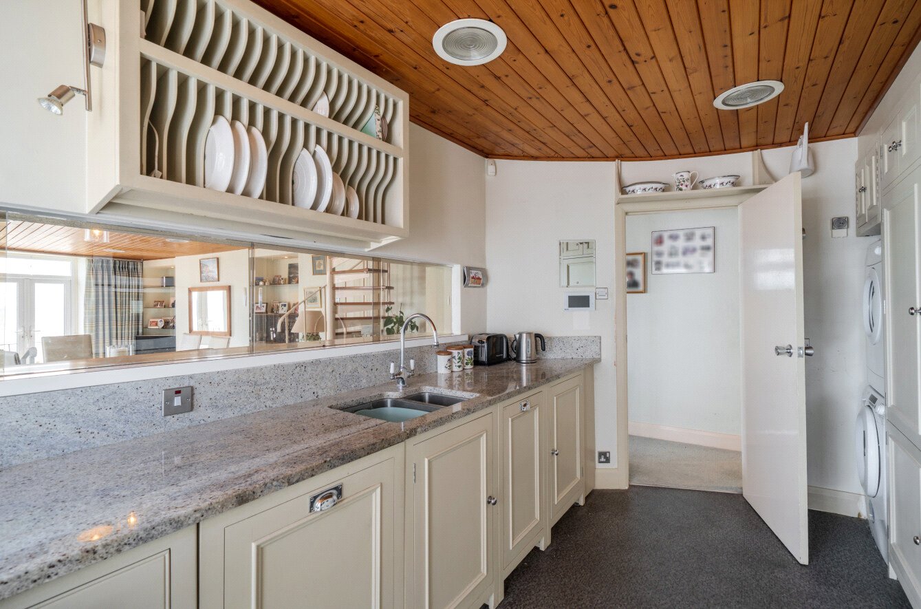 The generous kitchen is designed to make the most of its stunning setting, with a wide double-glazed bay window framing sweeping sea views and filling the room with natural light. Fitted units with granite worktops are complemented by a breakfast bar positioned to enjoy the outlook. Integrated appliances include an electric hob with extractor, double oven, microwave recess with warming drawer, and space for a fridge freezer and stacked laundry appliances.