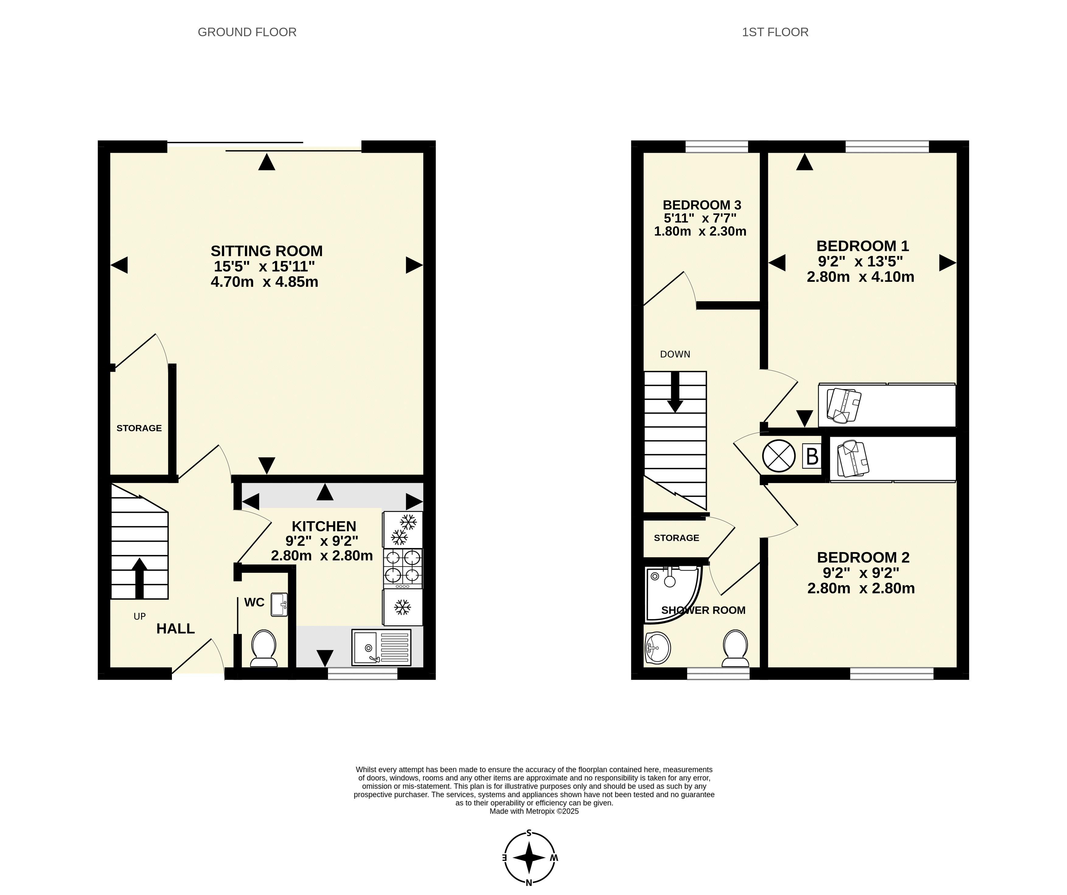 There is an airing cupboard housing the gas boiler and hot water cylinder on the first floor landing, further storage and access to the loft space via a pull-down ladder. Bedroom one has fitted wardrobes and a south facing aspect to the rear, there is a second double bedroom, again with fitted wardrobes. A third single bedroom enjoys the south facing aspect and lastly, a shower room is fitted with a white suite and an electric shower.
