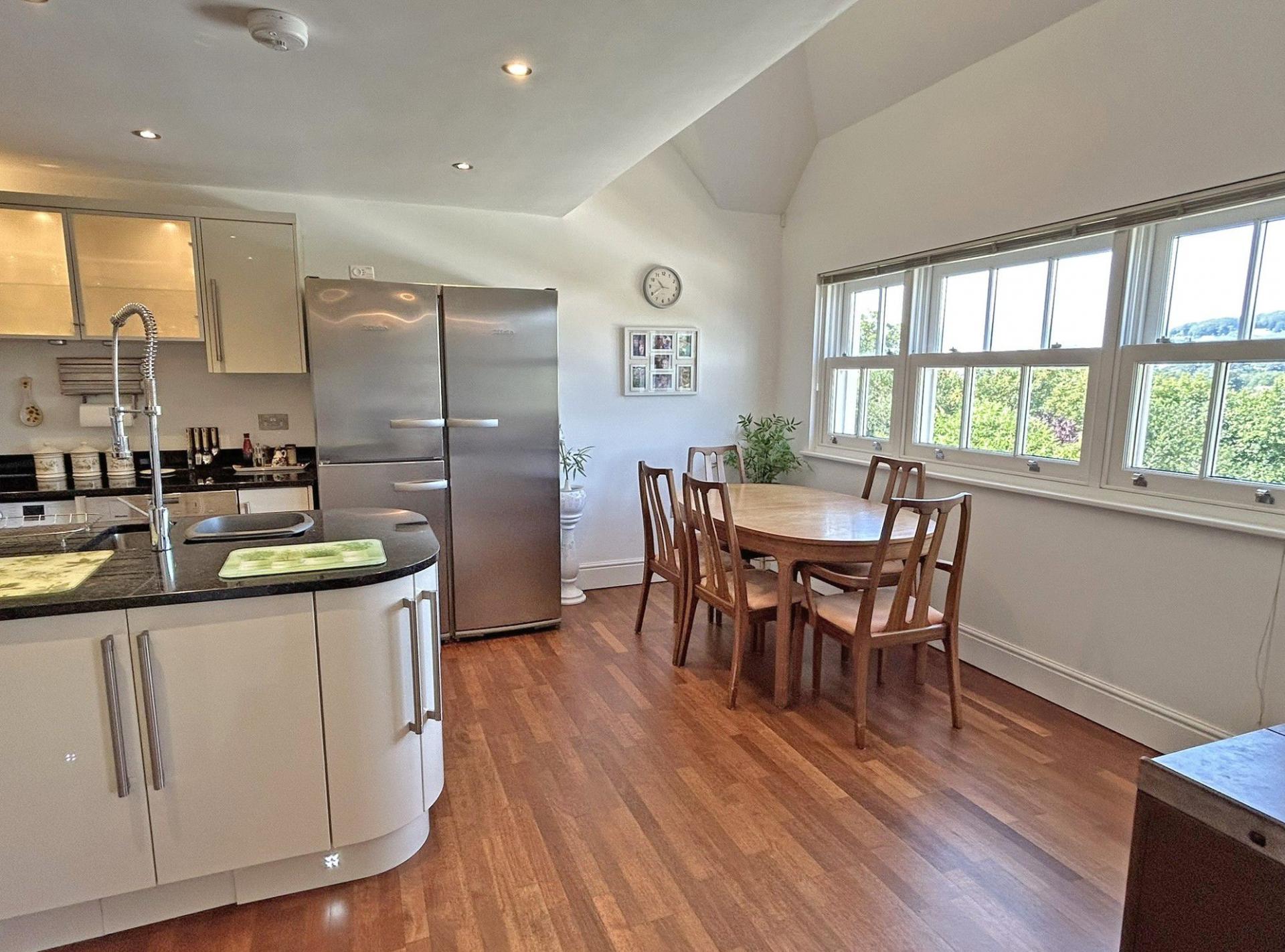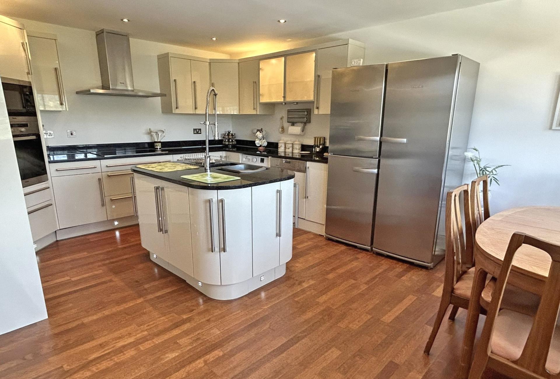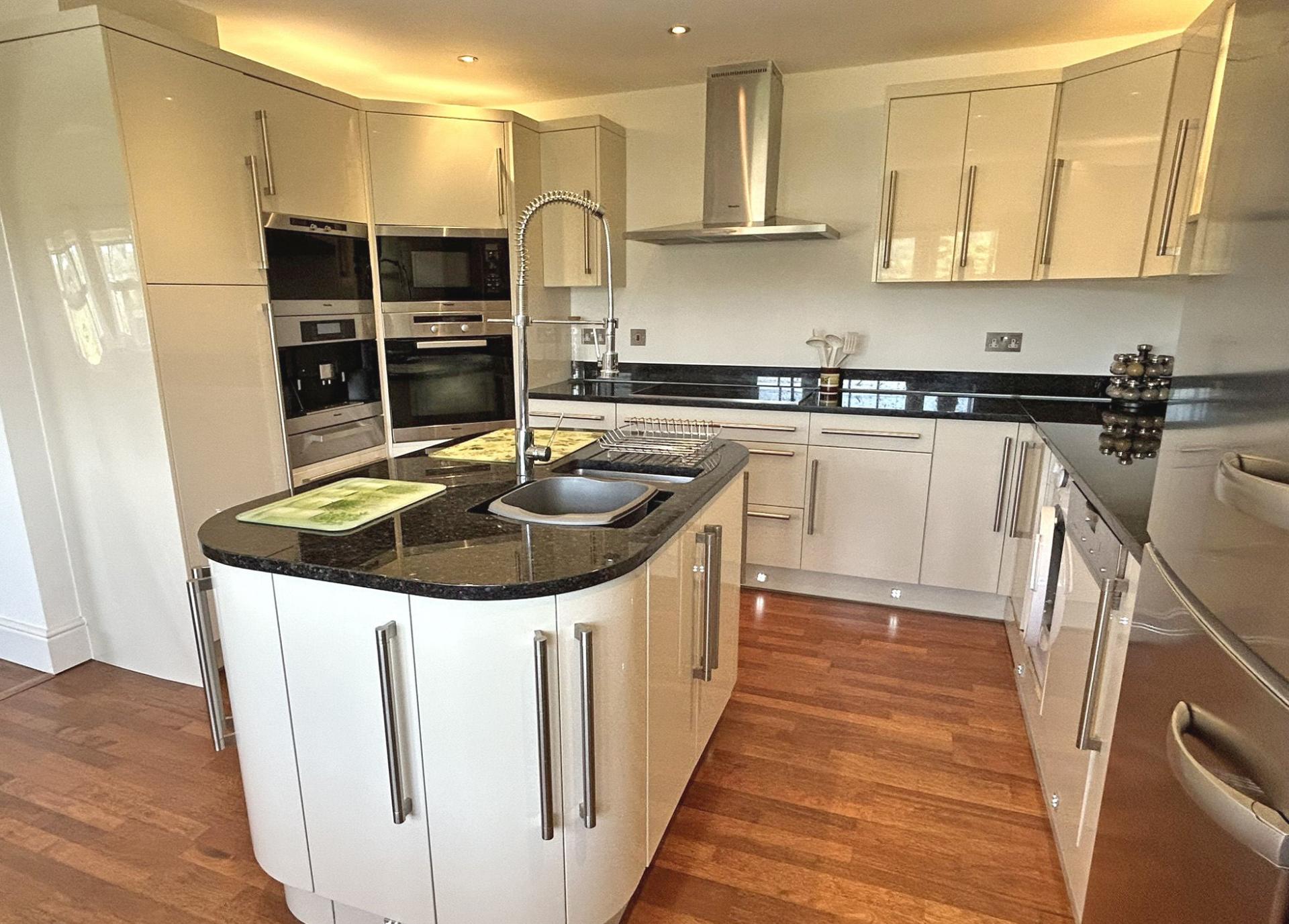 On entering the apartment, an entrance hall has a useful cloaks/storage cupboard off, the sitting room has a picture window and part vaulted ceiling and adjoining this is a spacious kitchen/dining room. The kitchen is extensively fitted with a range of matching cupboards drawers and polished granite work surfaces incorporating a central island all providing excellent storage. Appliances comprise a built-in oven, microwave, induction hob, cooker hood, steam oven, coffee machine, dishwasher and a free standing washing machine and American style fridge/freezer.