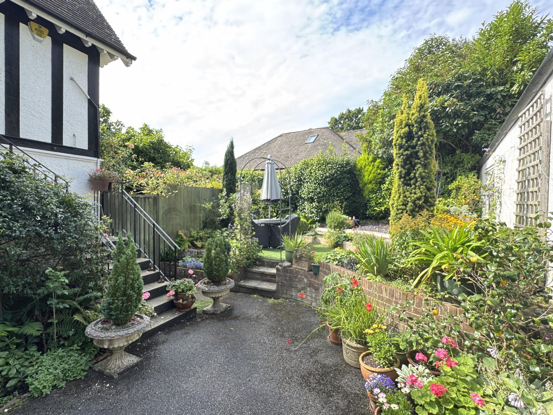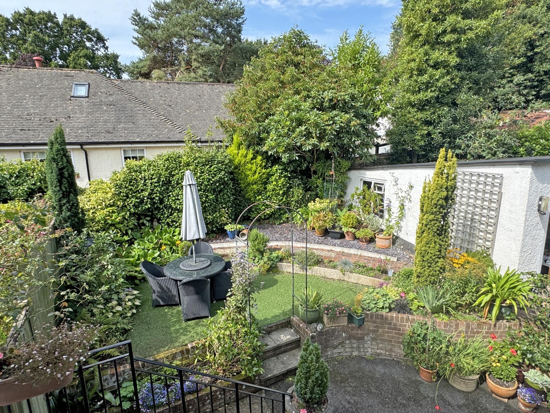 The apartment shares its access driveway with the ground floor apartment, the driveway leads around to the rear of the building and gives access to a small garage block. The left-hand garage is conveyed with this apartment which has an up and over door and measures 2.85m x 5.1m. Adjoining this is the garden which is mainly paved and has adjoining well stocked shrub borders and has lots of space for pots and troughs. The paved area has Astro Turf grass and makes a perfect area for a table and chairs.