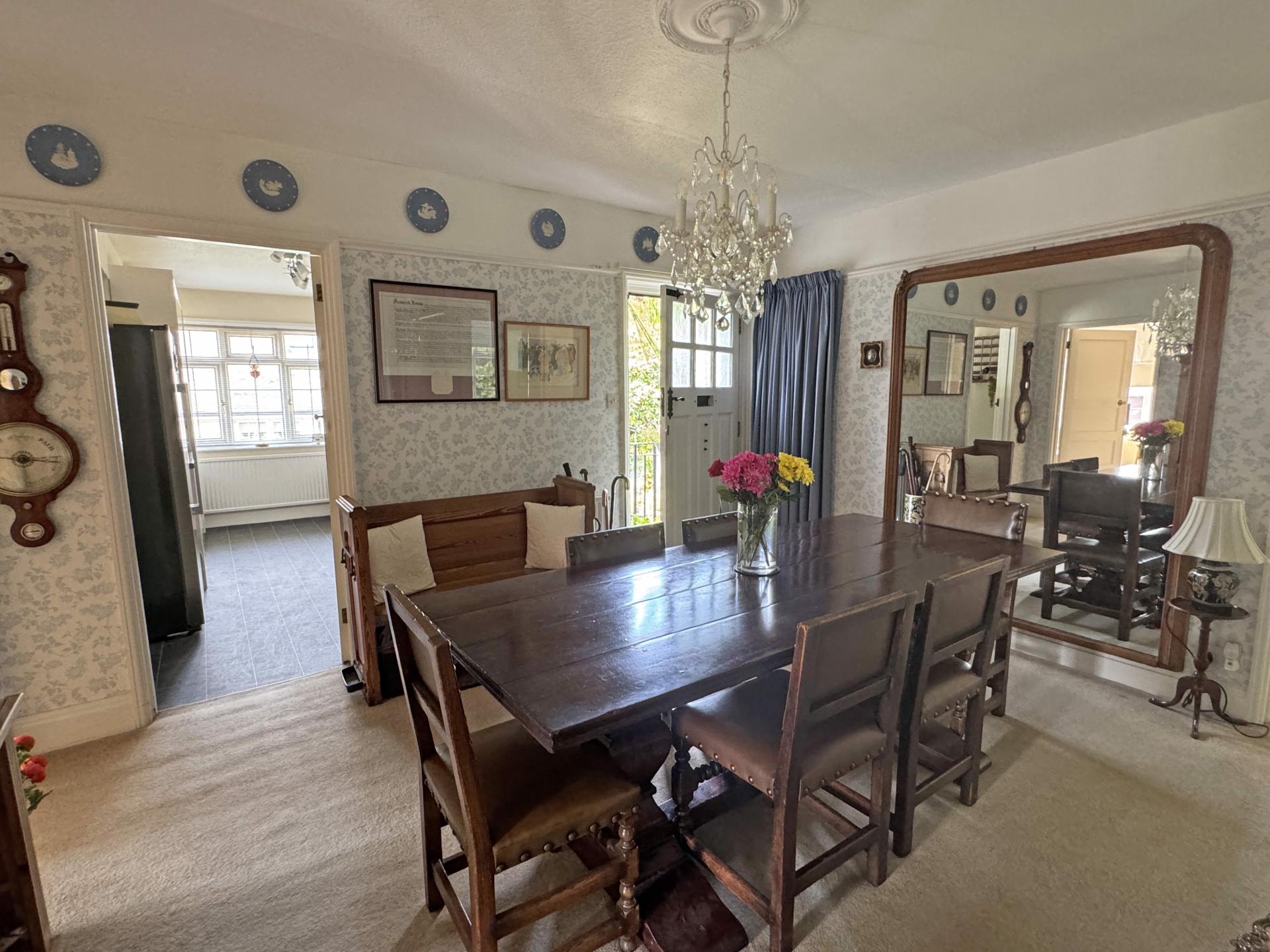 Approached via a wide external staircase, the front door opens into a large reception/dining hall which has a large airing/storage cupboard off along with access to the roof space via a sliding ladder. The roof space is of a good size, has an electric light and is part boarded.