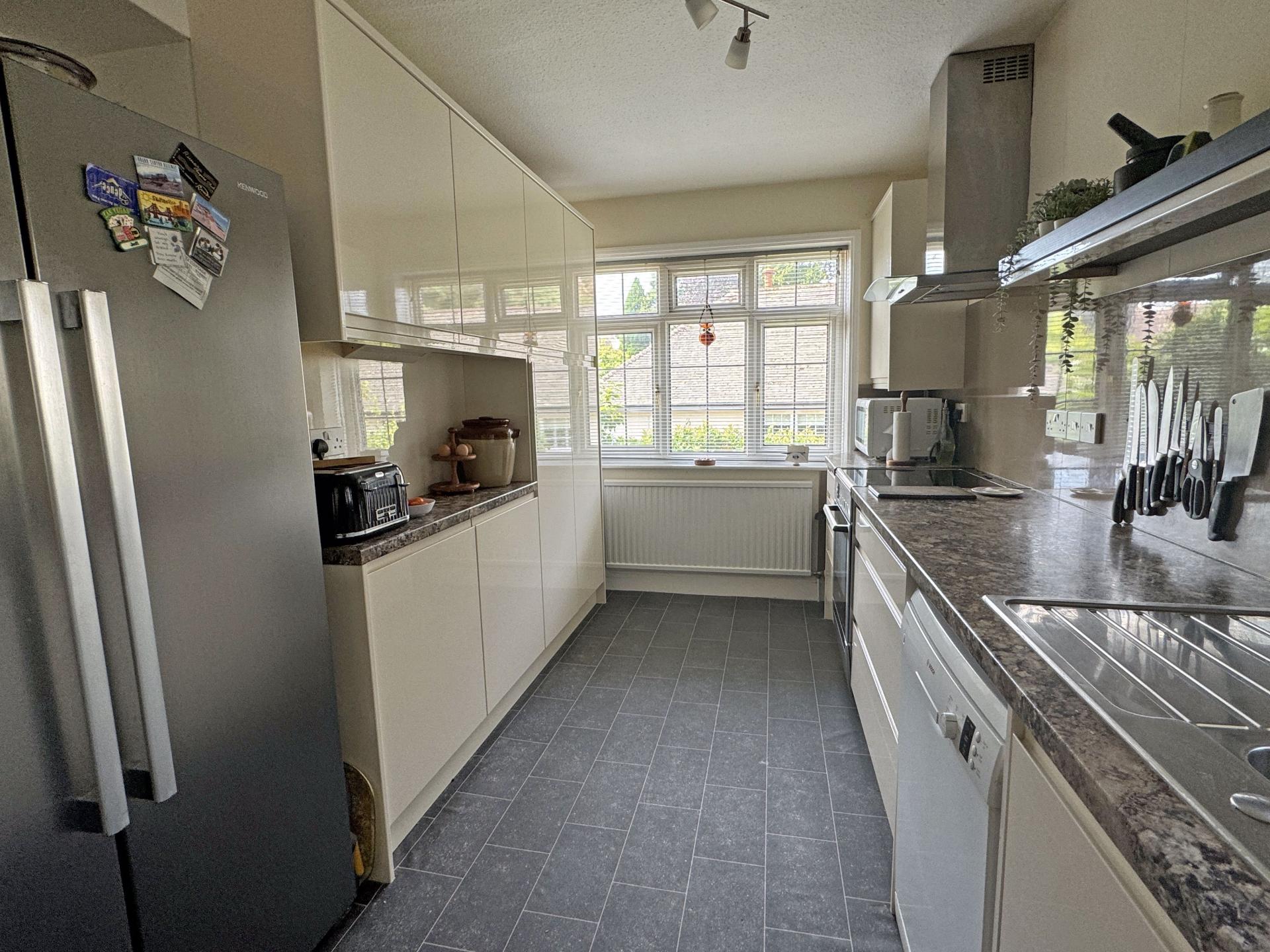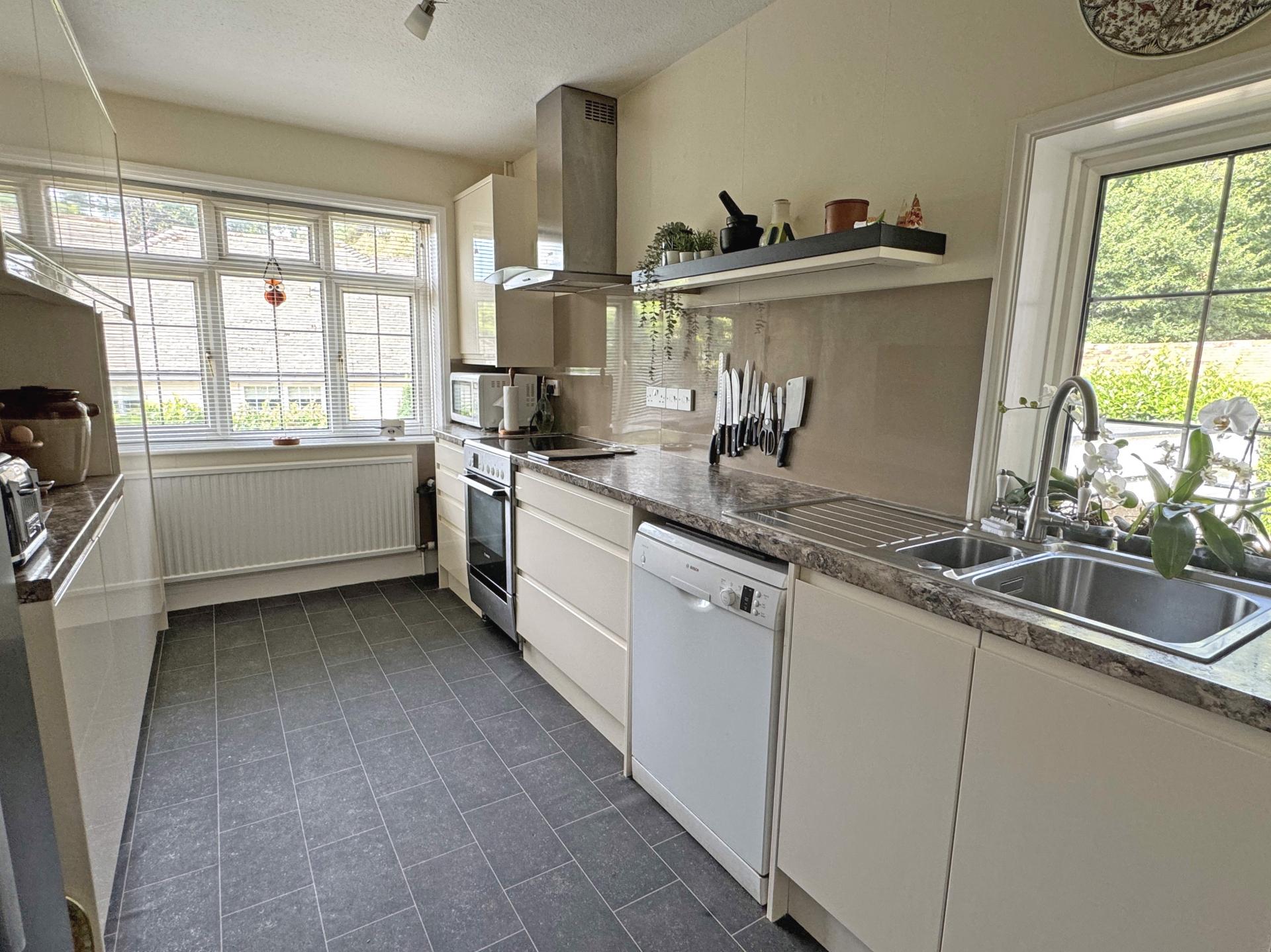The spacious sitting room is dual aspect, being south and east and has a stone fireplace with space for an electric fire. The kitchen enjoys a westerly aspect and comprises a range of matching storage units and worksurfaces and there is a freestanding electric cooker with ceramic hob and cooker hood over.