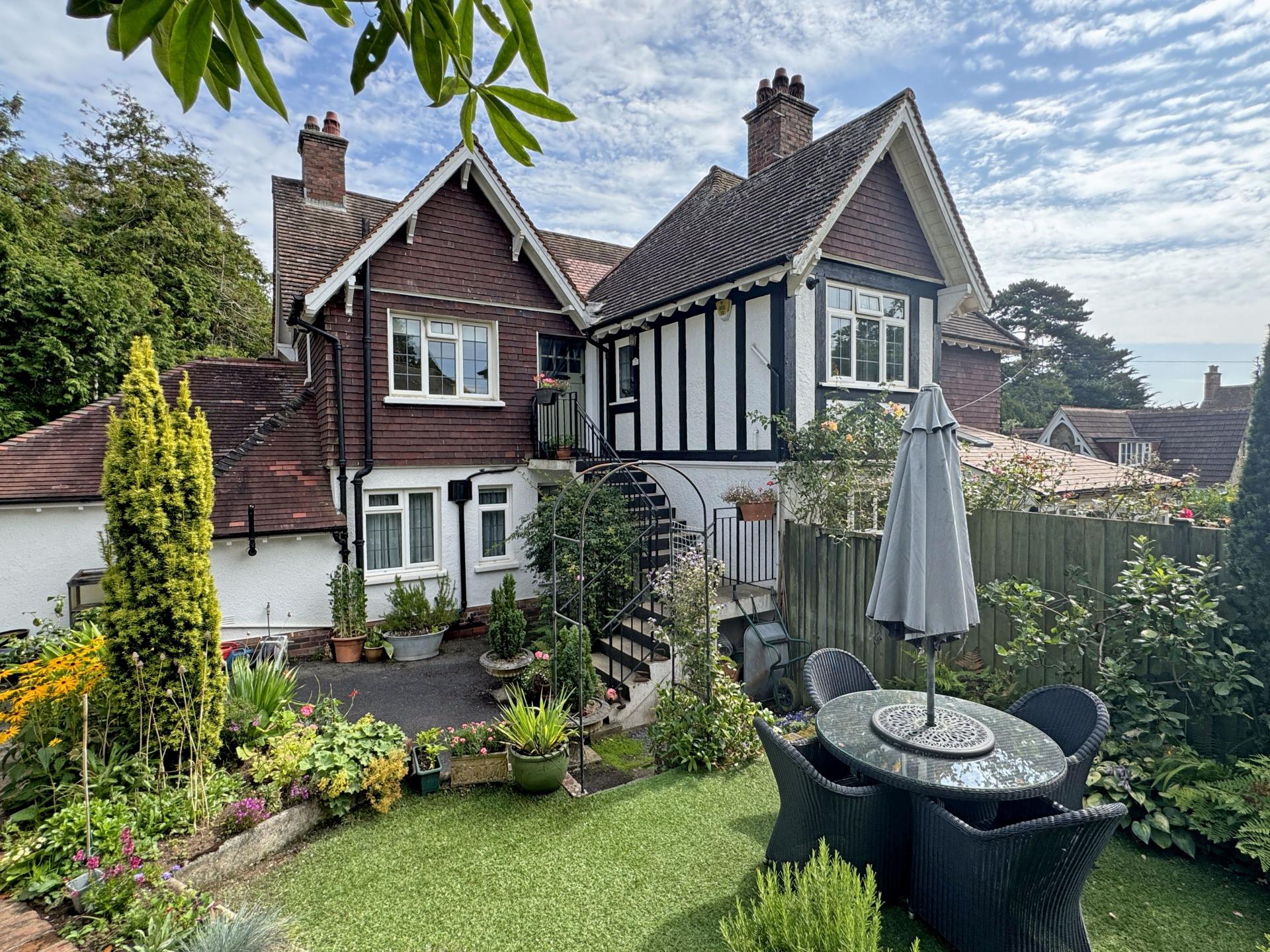 Merrion is a detached property which was converted some years ago into two self contained garden apartments with Flat 2 being on the first floor and having a small easy to manage area of garden that enjoys a south westerly aspect. Along side the area of garden is a single garage conveyed with this apartment.
