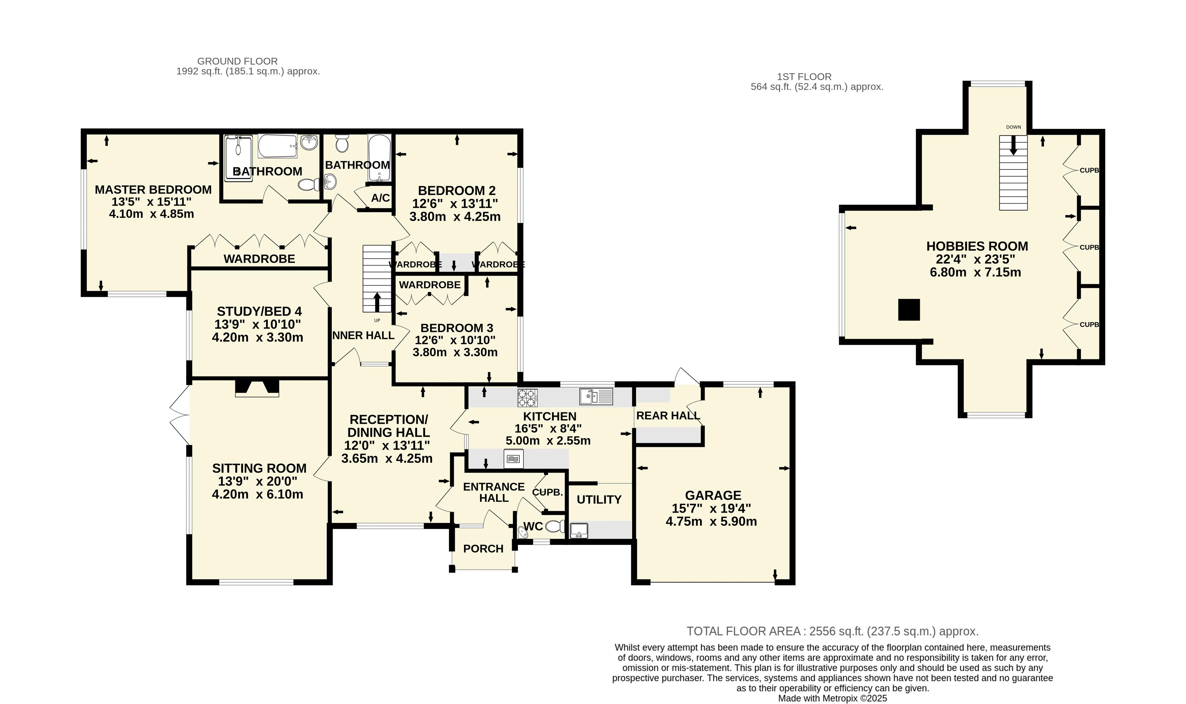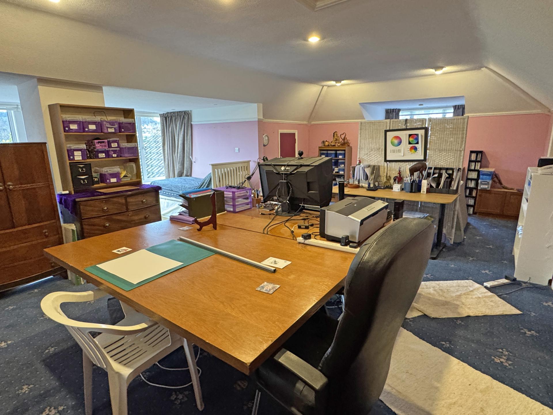 To the first floor there is a large hobbies room which offers excellent flexibility to the accommodation and enjoys a dual aspect with wonderful views in a westerly direction over the town towards Bulverton Hill. Extensive built in cupboards provide excellent storage and give access into several eaves storage areas and there is also access to the roof space.
