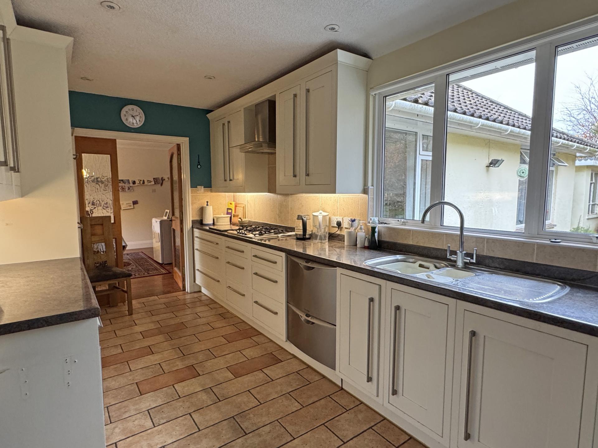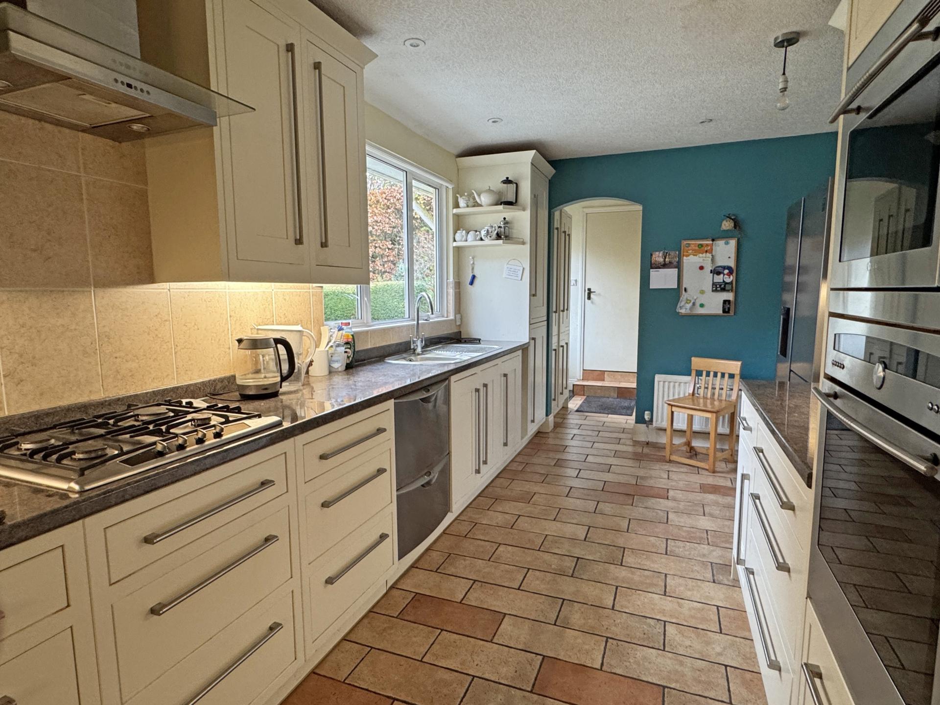 A useful adjoining utility area offers further storage along with a Belfast sink and a freestanding washing machine and tumble dryer. The utility area also houses the gas fired boiler. A rear hall offers a further range of storage cupboards along with doors to both the garden and directly into the garage.
