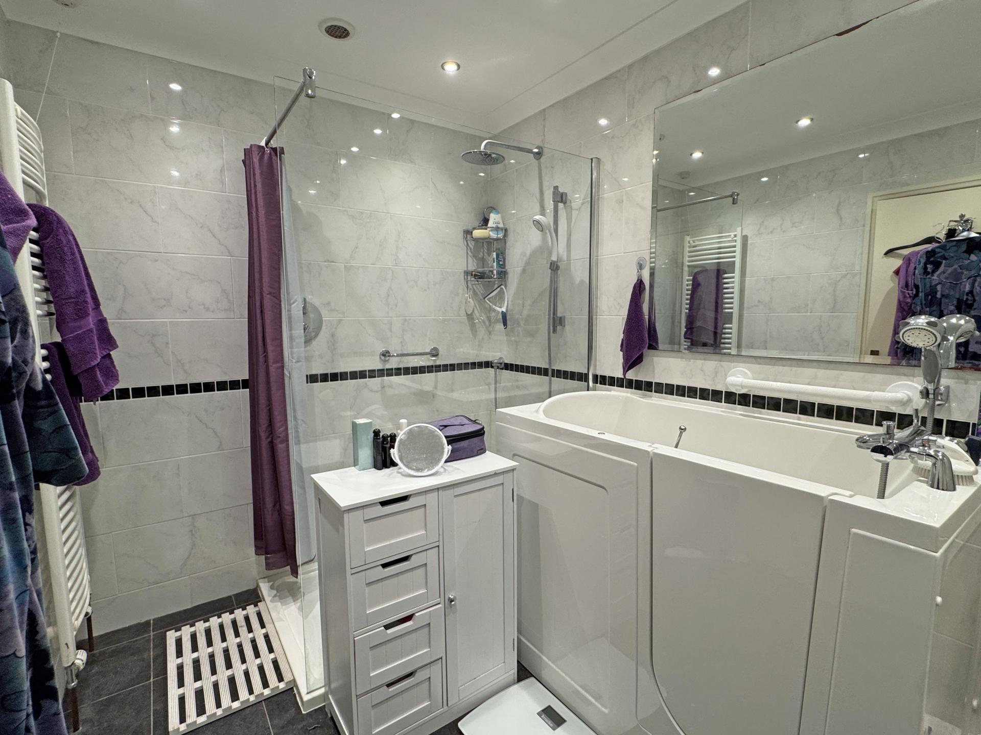 The main bedroom suite enjoys a south and west aspect overlooking the garden and beyond, towards Muttersmoor. A good range of wardrobes provide lots of storage and there is a fitted dressing table and drawer units. The adjoining en-suite shower room is fully tiled and has a white suite comprising a large walk-in shower cubicle, walk-in bath, WC and wash basin.