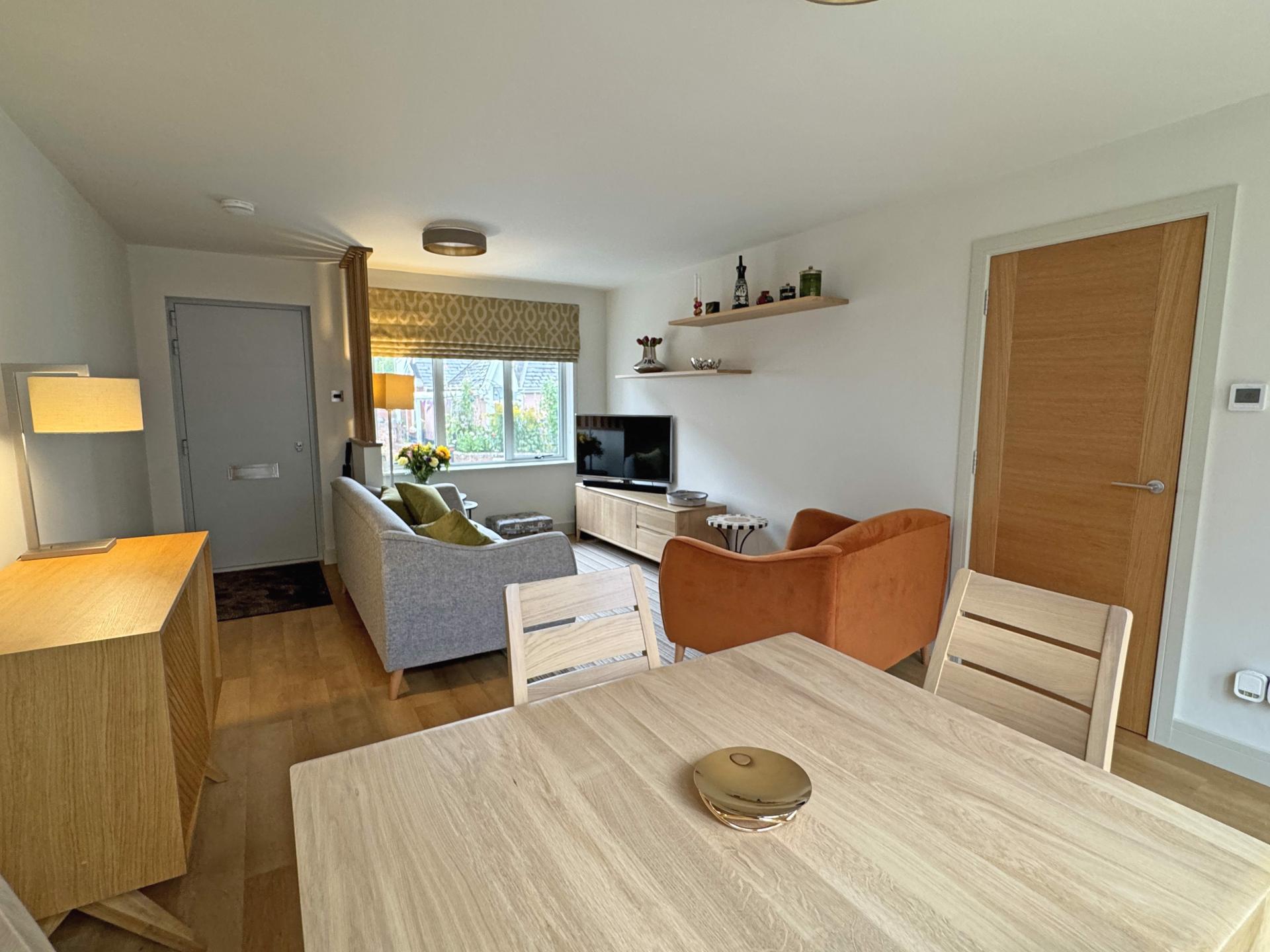 On entering the property there is a good size sitting/dining room leading into a superbly fitted kitchen which has a range of matching storage units, along with quartz worktops incorporating a small breakfast bar. Integrated appliances comprise a Quooker tap, dishwasher, fridge, freezer, split level double oven, warming drawer, five ring induction hob and cooker hood. A feature glass pocket door separates the kitchen and living area.