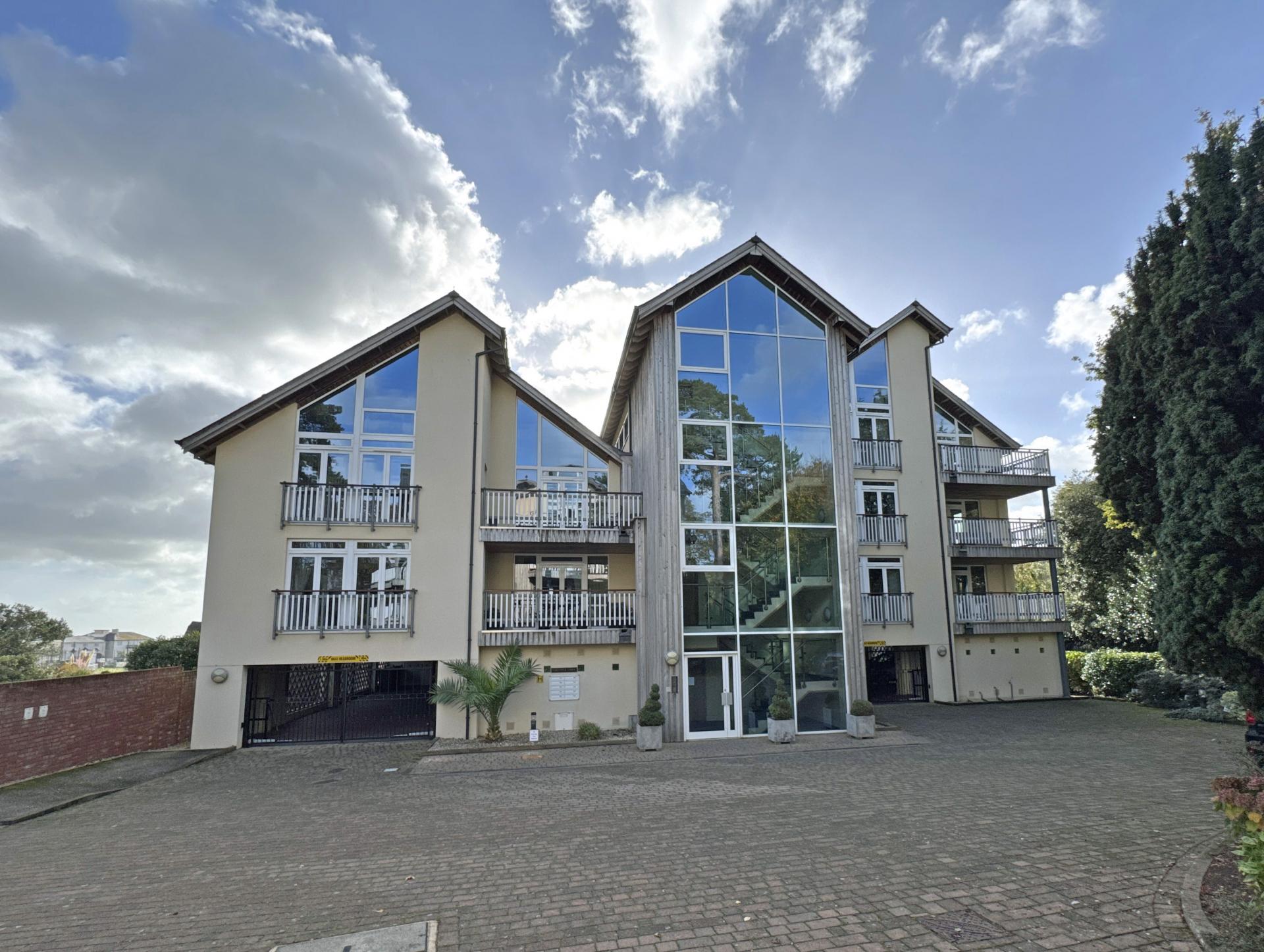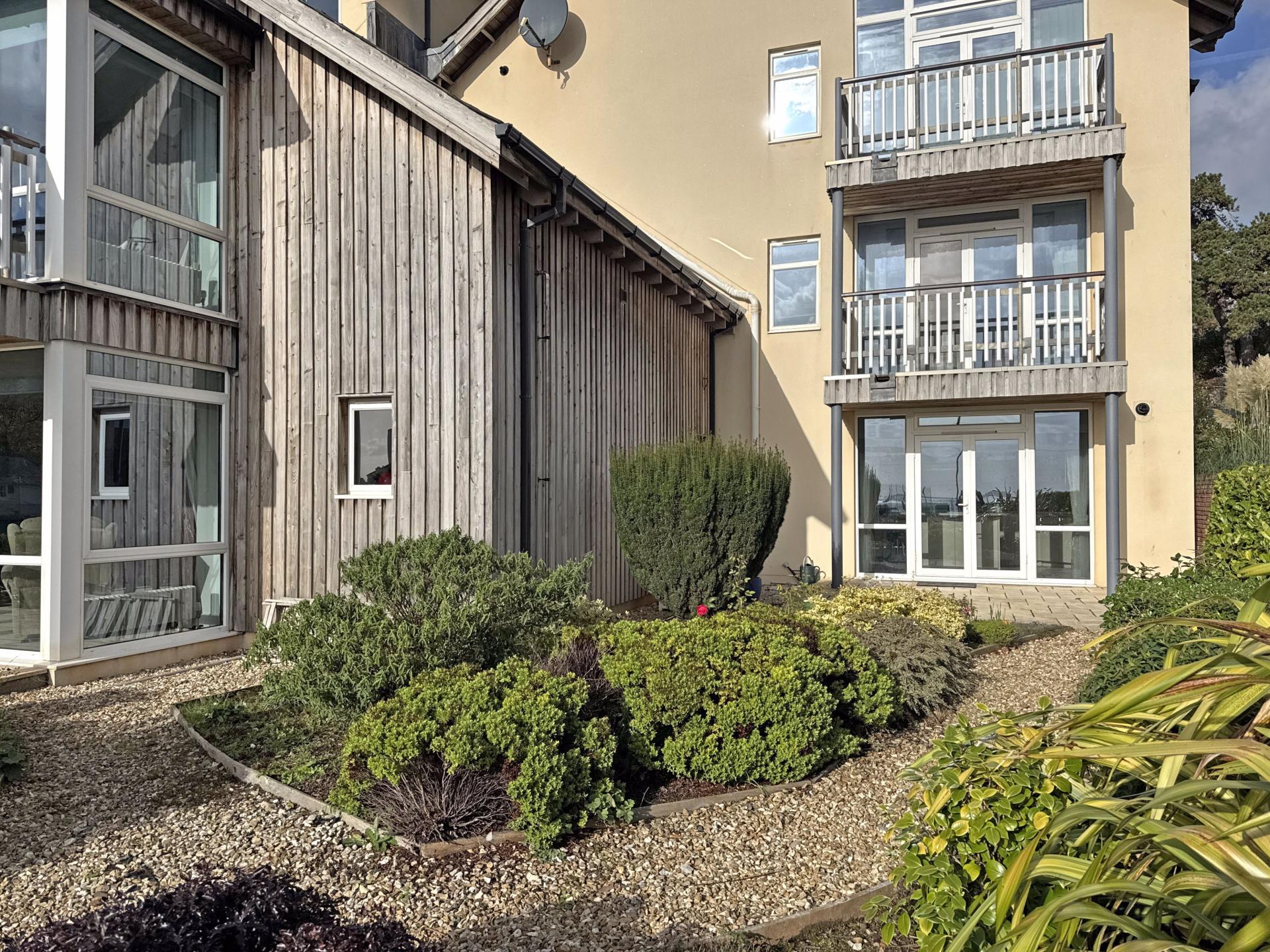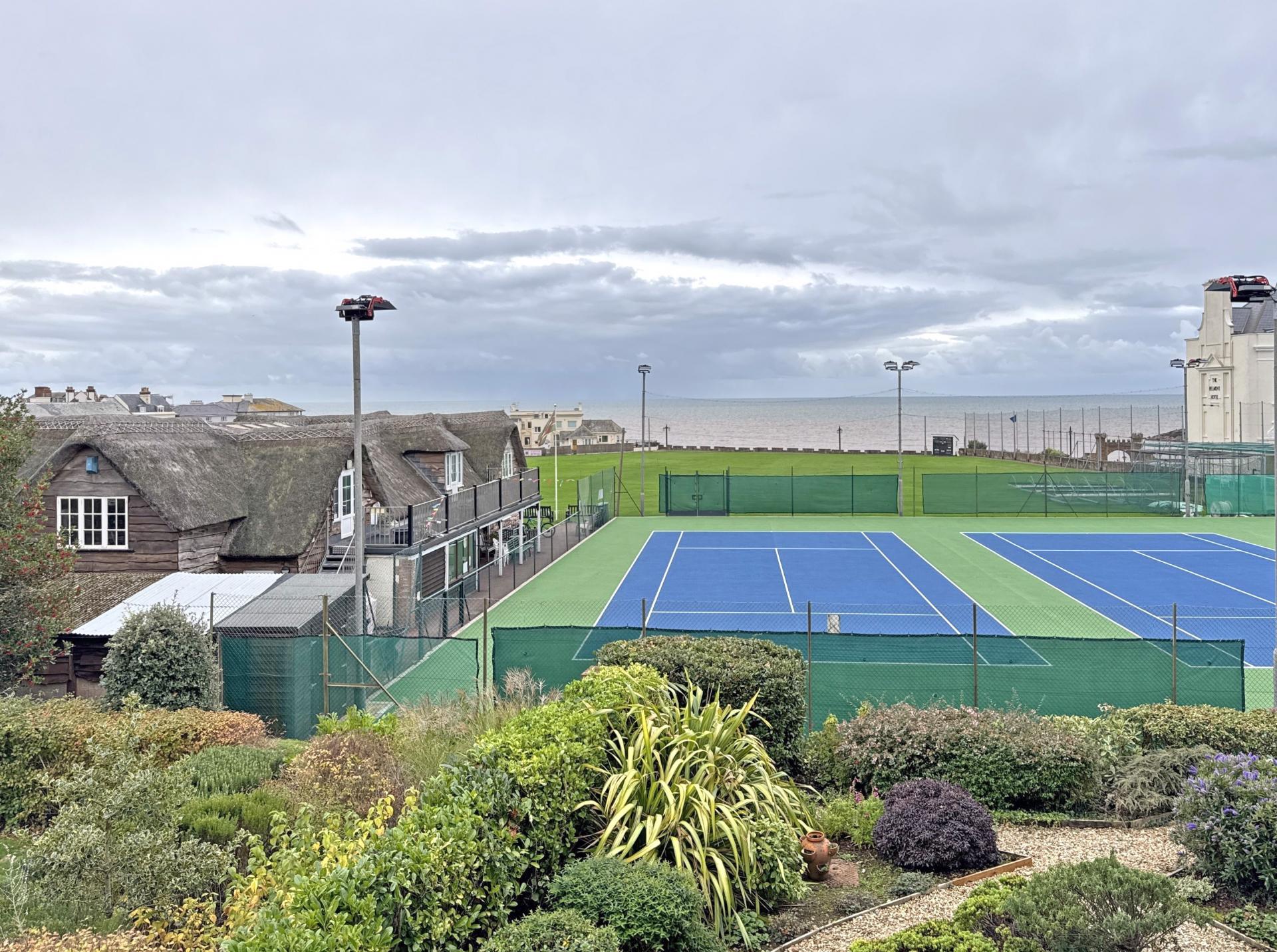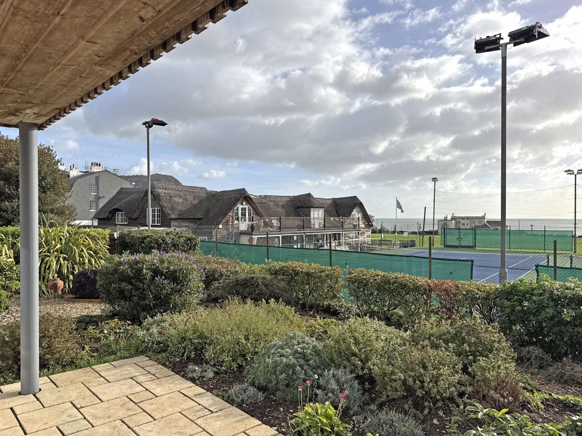 Beyond the private patios are well kept, low maintenance communal gardens, looking south and with the stunning backdrop of the Cricket Club’s thatched pavilion to the sea beyond. There is visitor parking to the front of the building and electric gates opening into under-building parking where the property owns two spaces. Within this area there is also a secure store room.