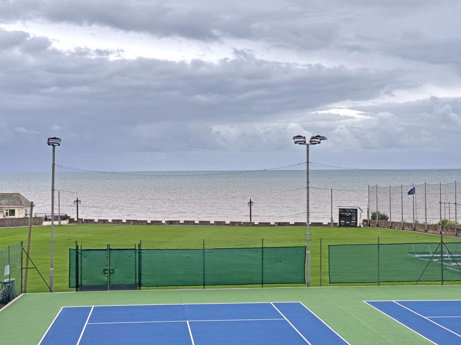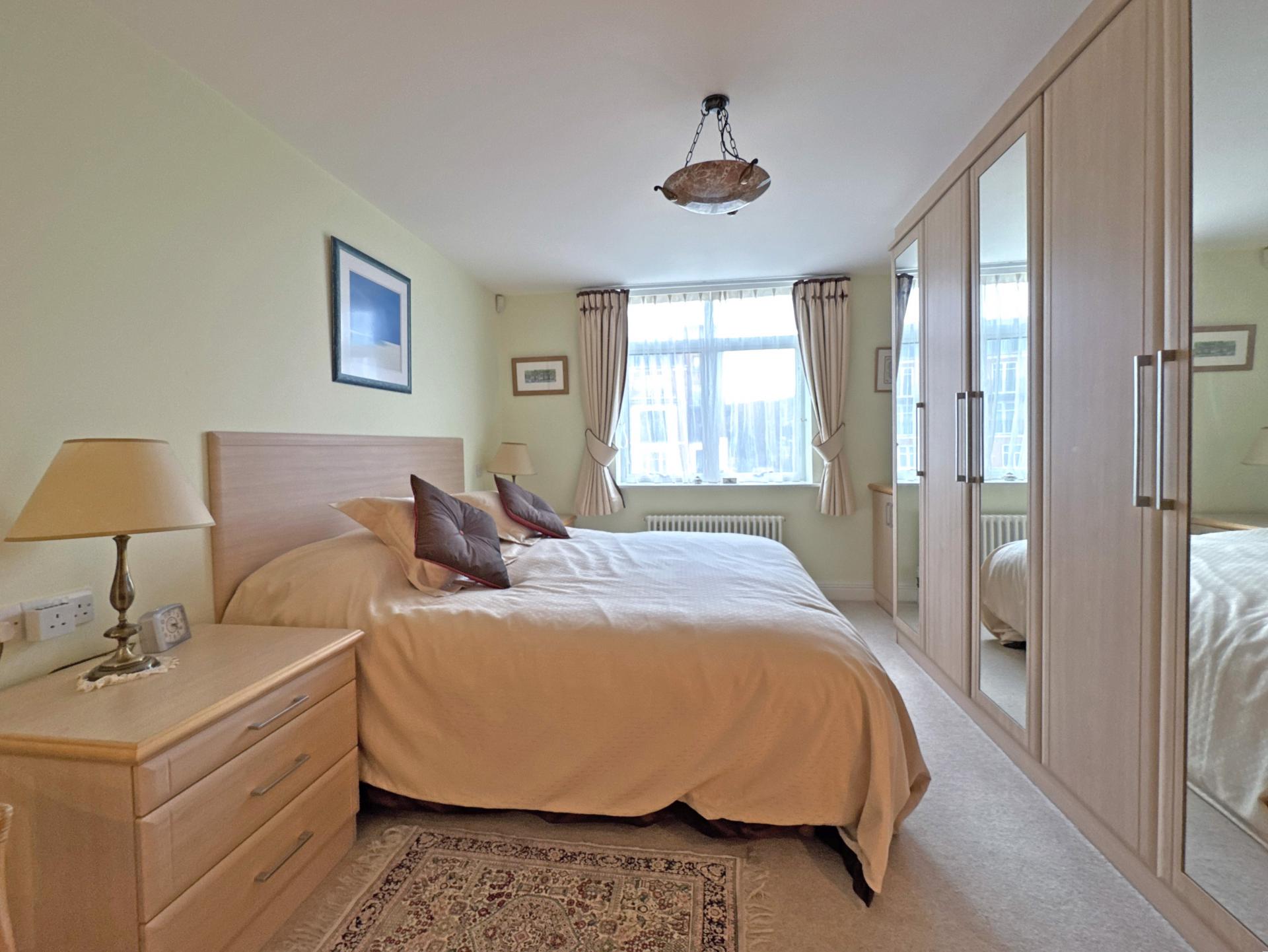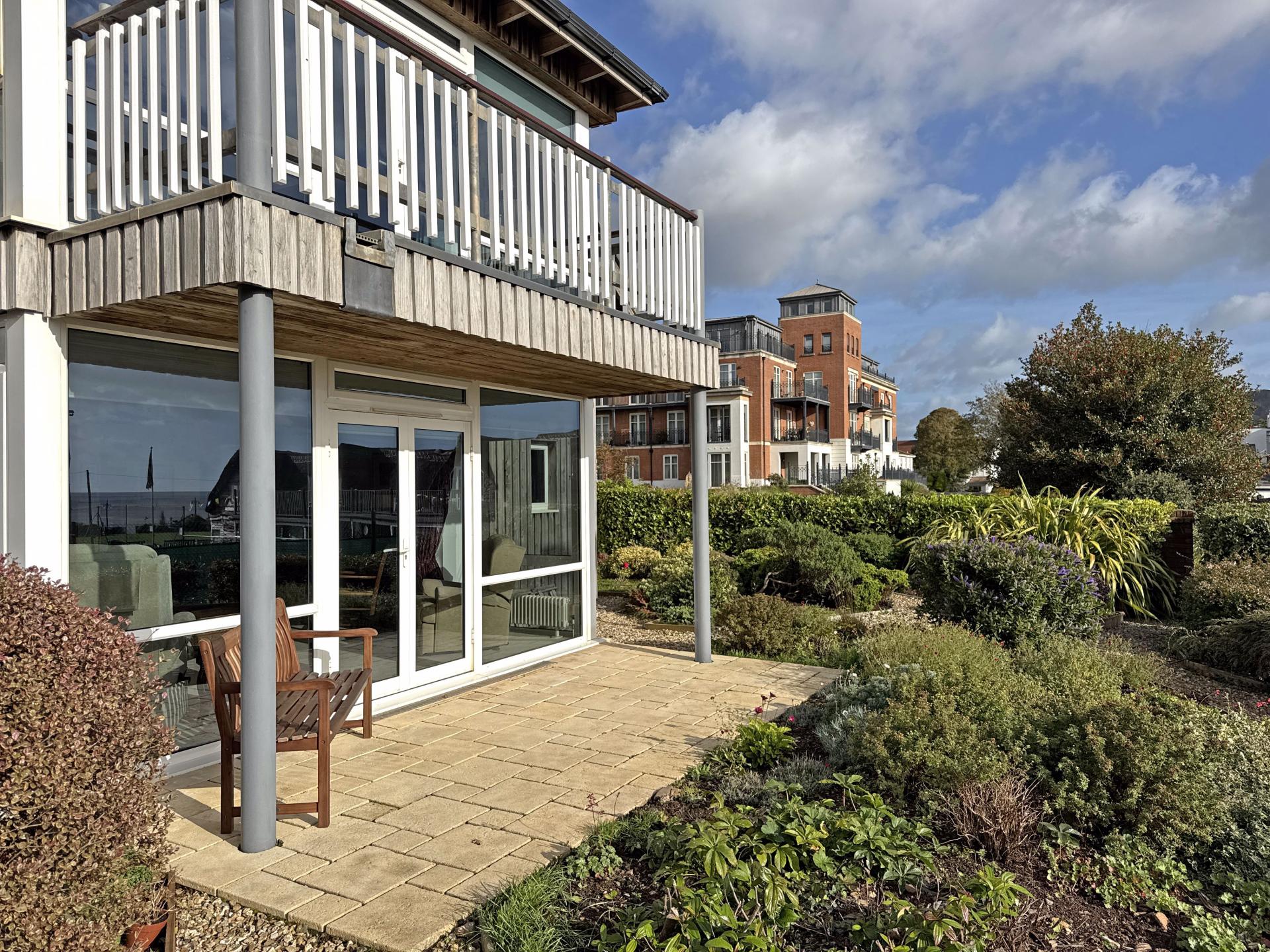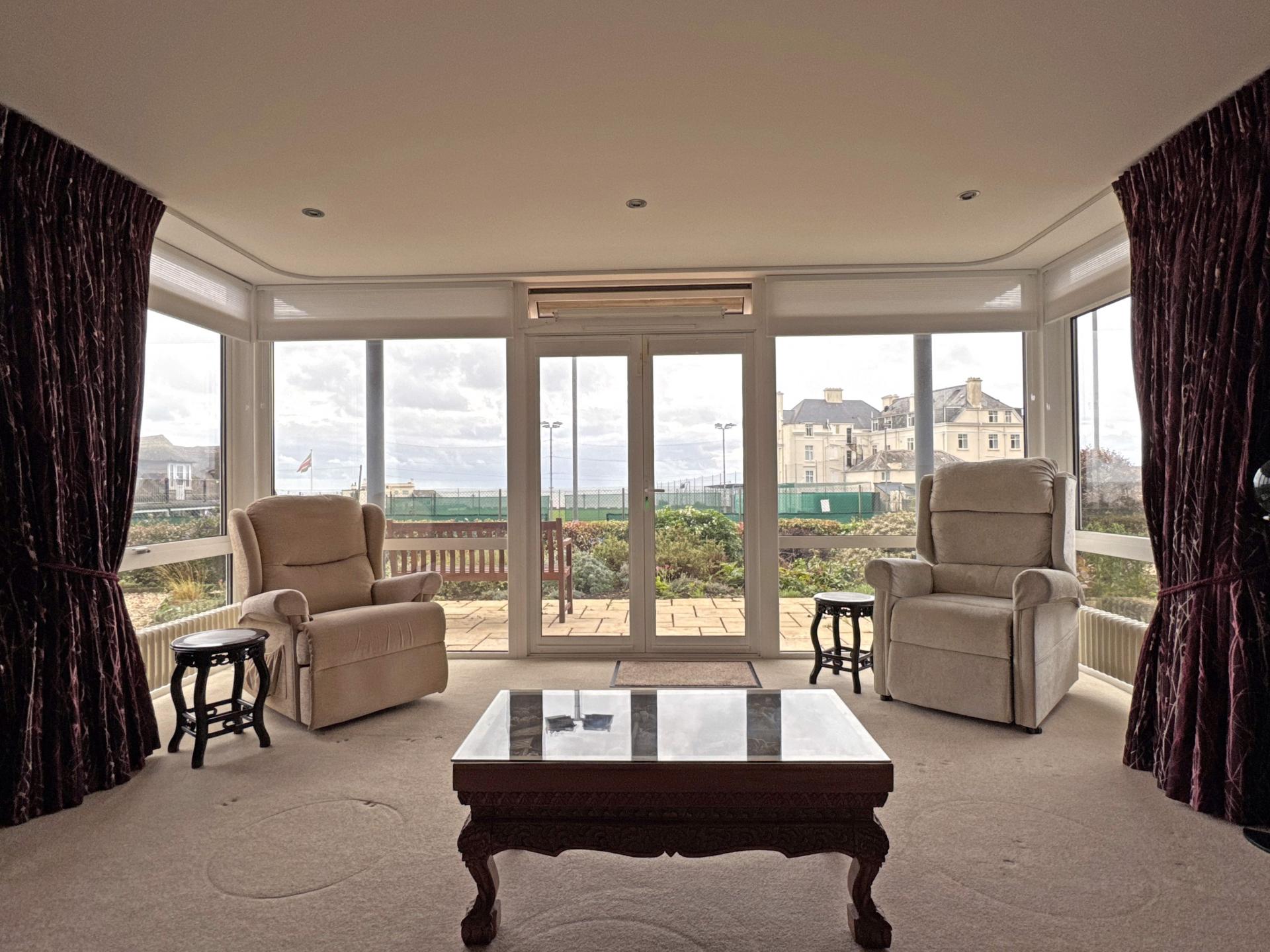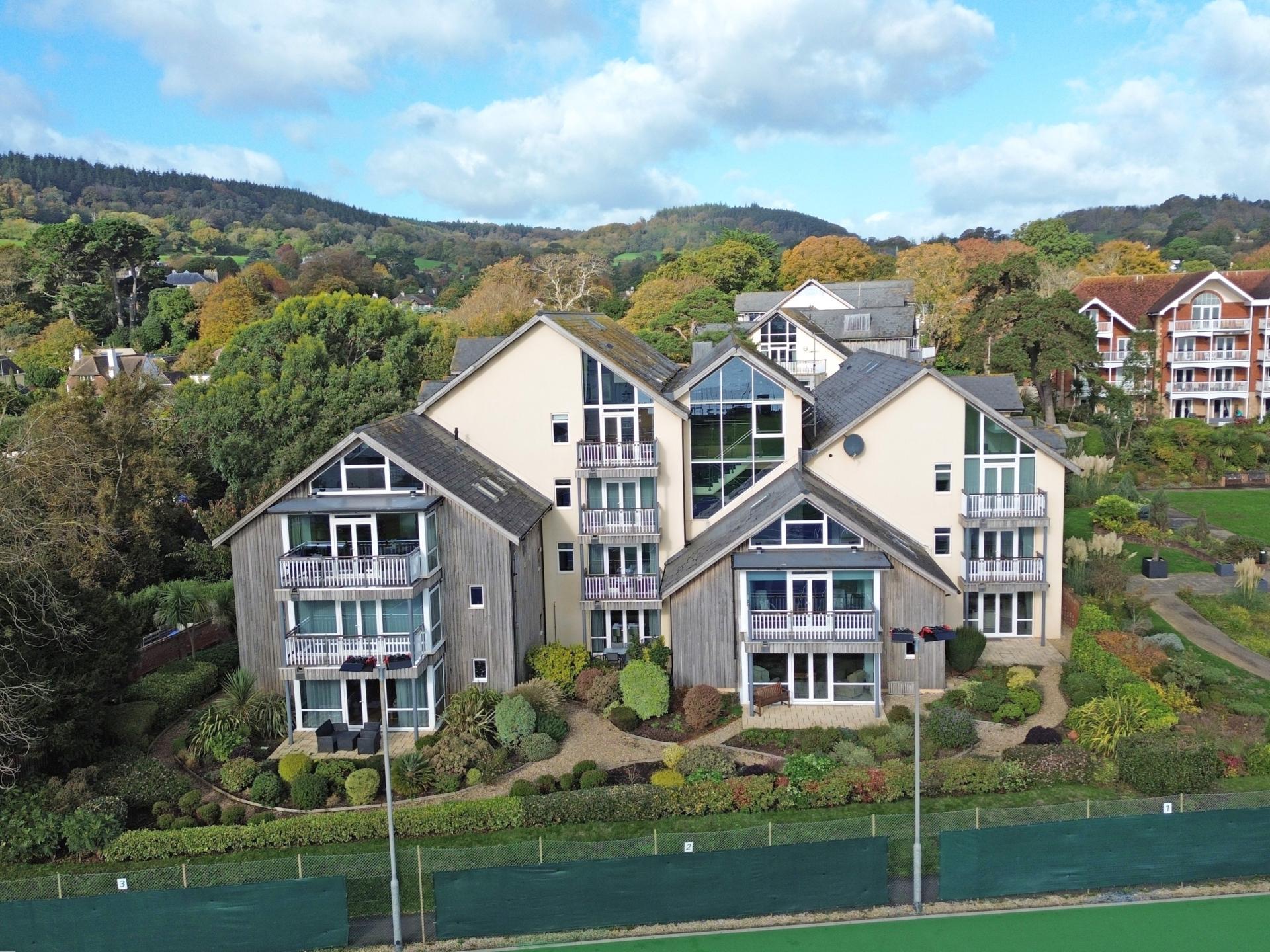 Beyond the private patios are well kept, low maintenance communal gardens, looking south and with the stunning backdrop of the Cricket Club’s thatched pavilion to the sea beyond. There is visitor parking to the front of the building and electric gates opening into under-building parking where the property owns two spaces. Within this area there is also a secure store room.