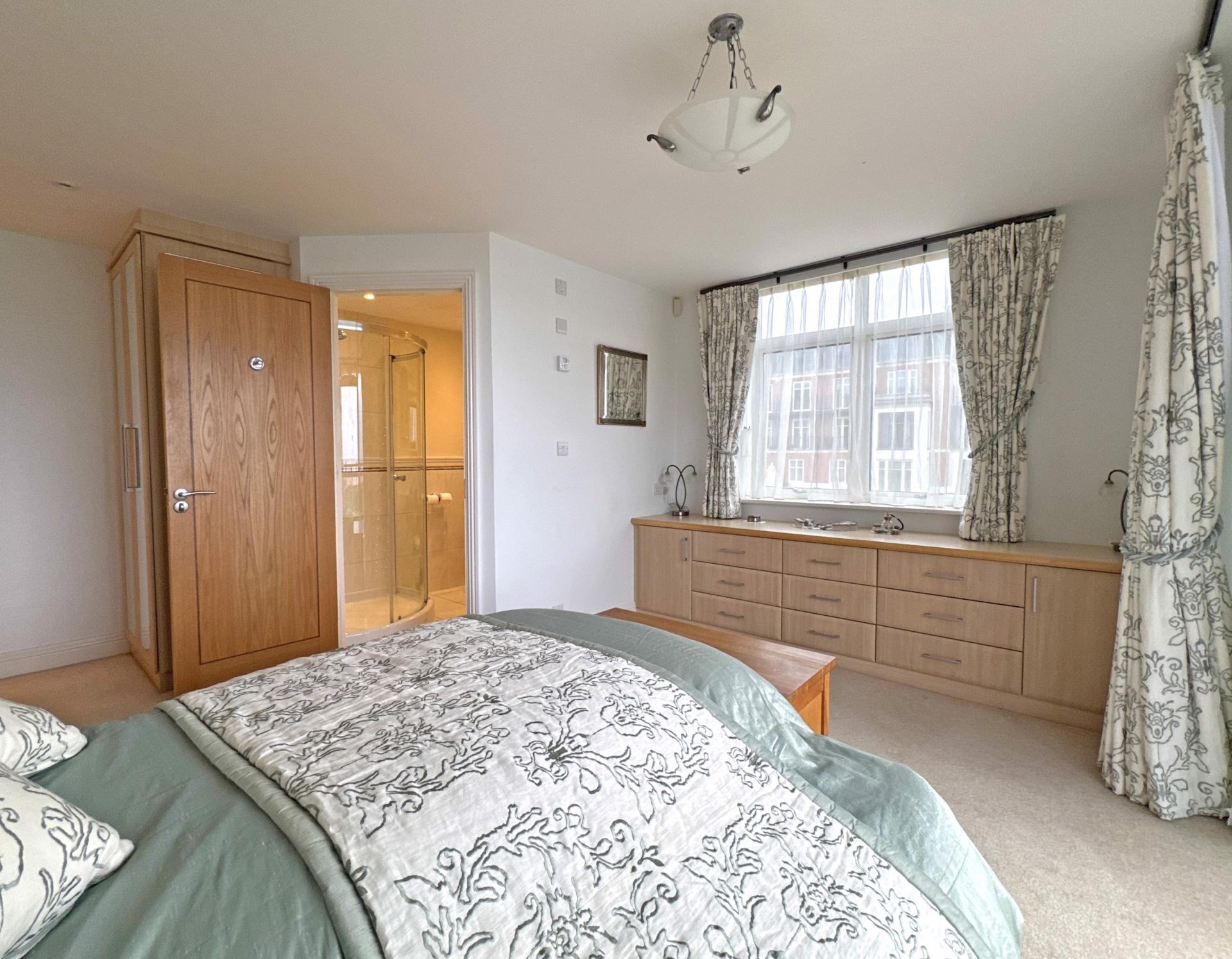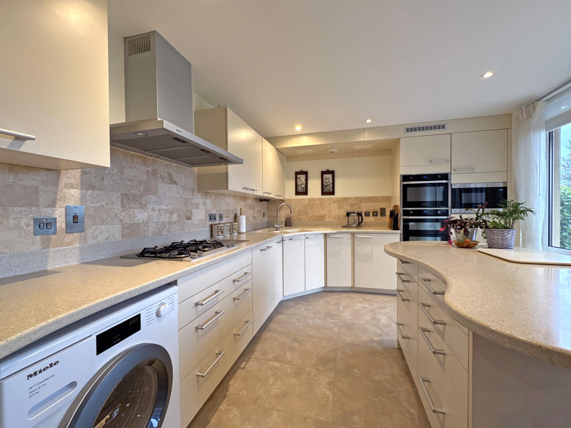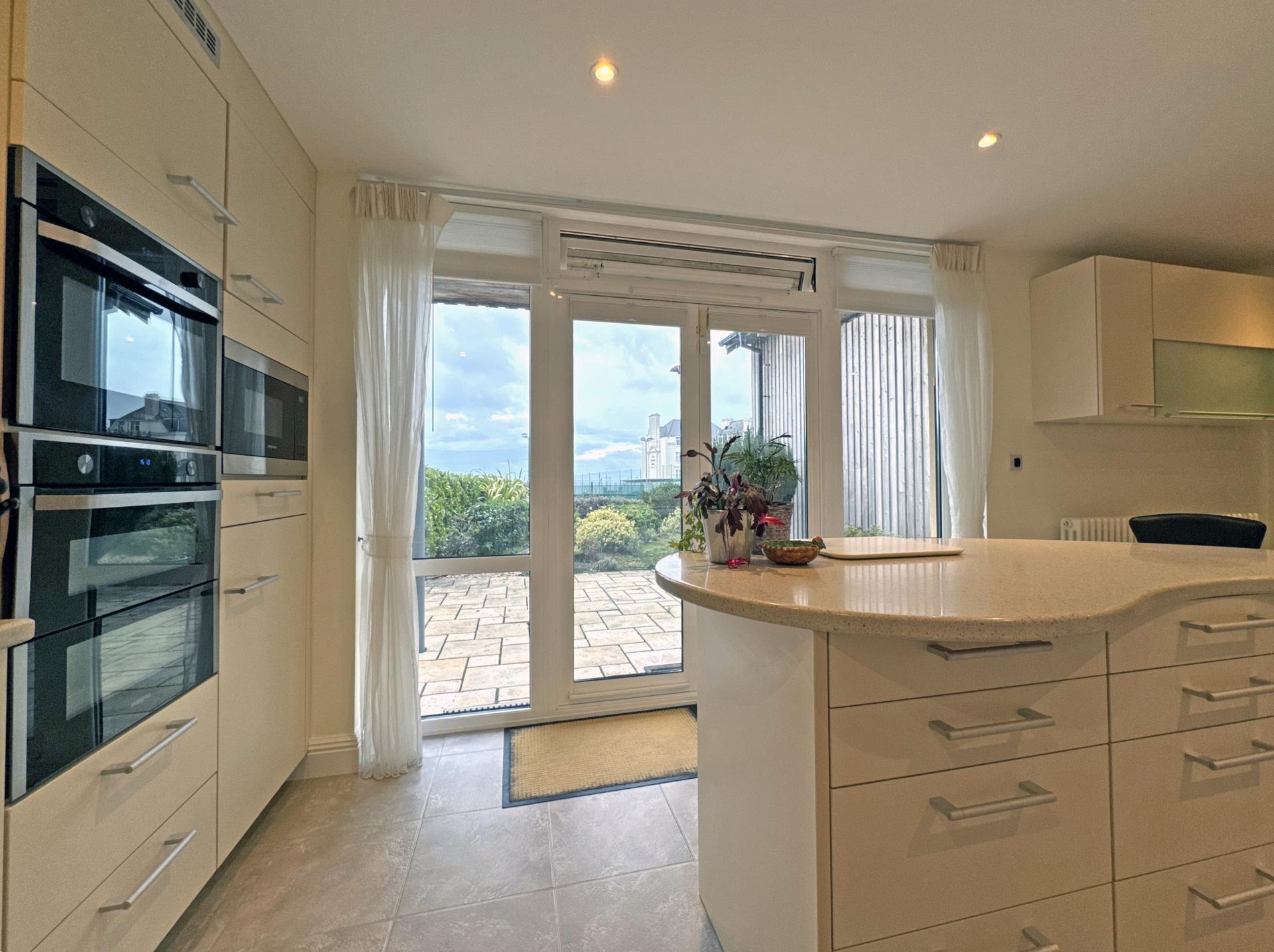 A particularly spacious sitting/dining room is triple aspect and features a broad bay window with doors opening onto a private patio, taking in the south facing sea view. The room is open plan through to a kitchen/breakfast room that is fitted with a Poggenpohl kitchen and preparation island, an excellent range of units and built-in appliances to include ovens, microwave, gas hob, dishwasher, fridge and freezer.