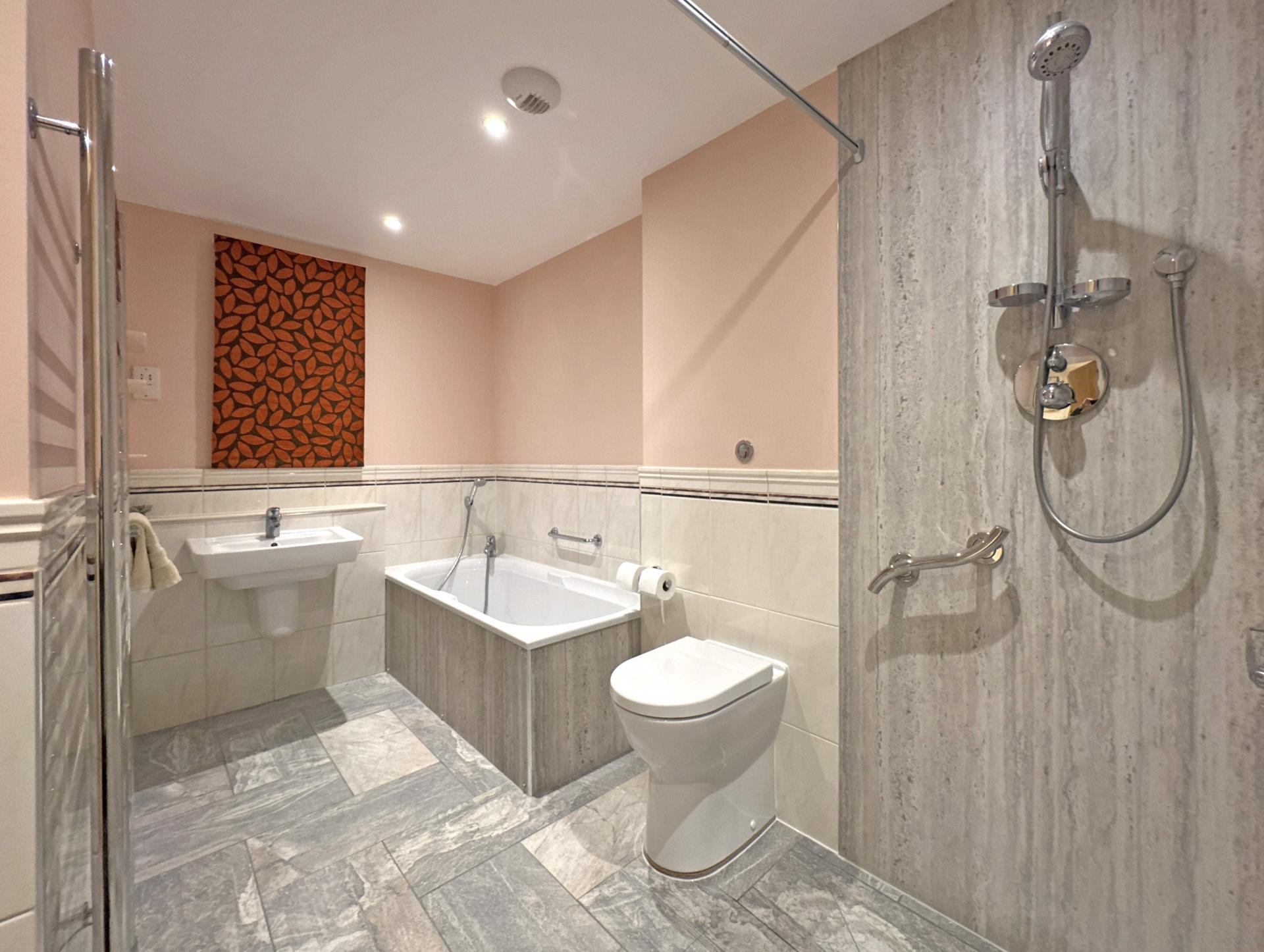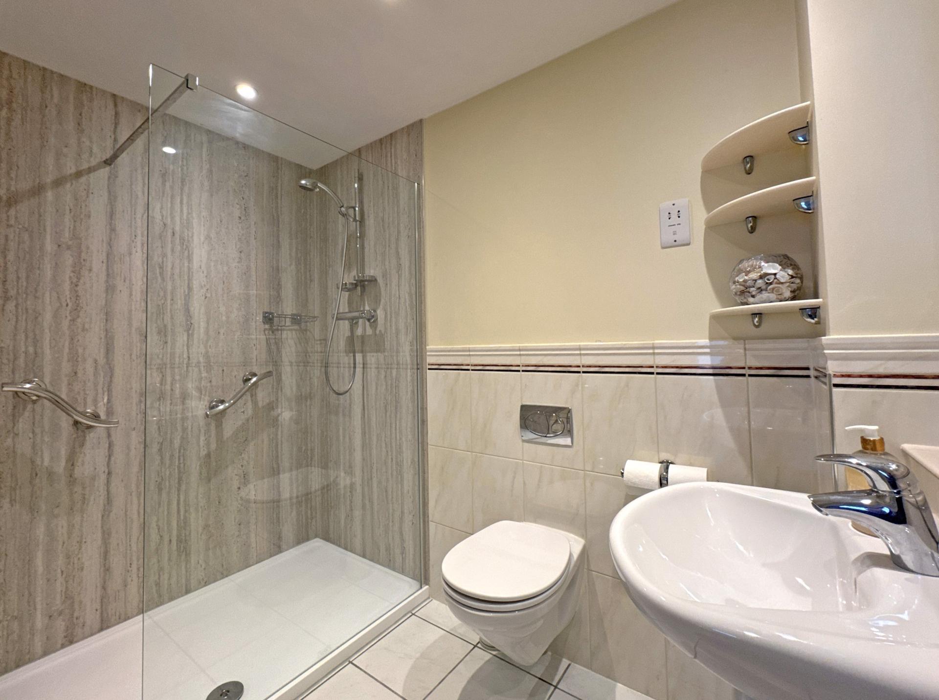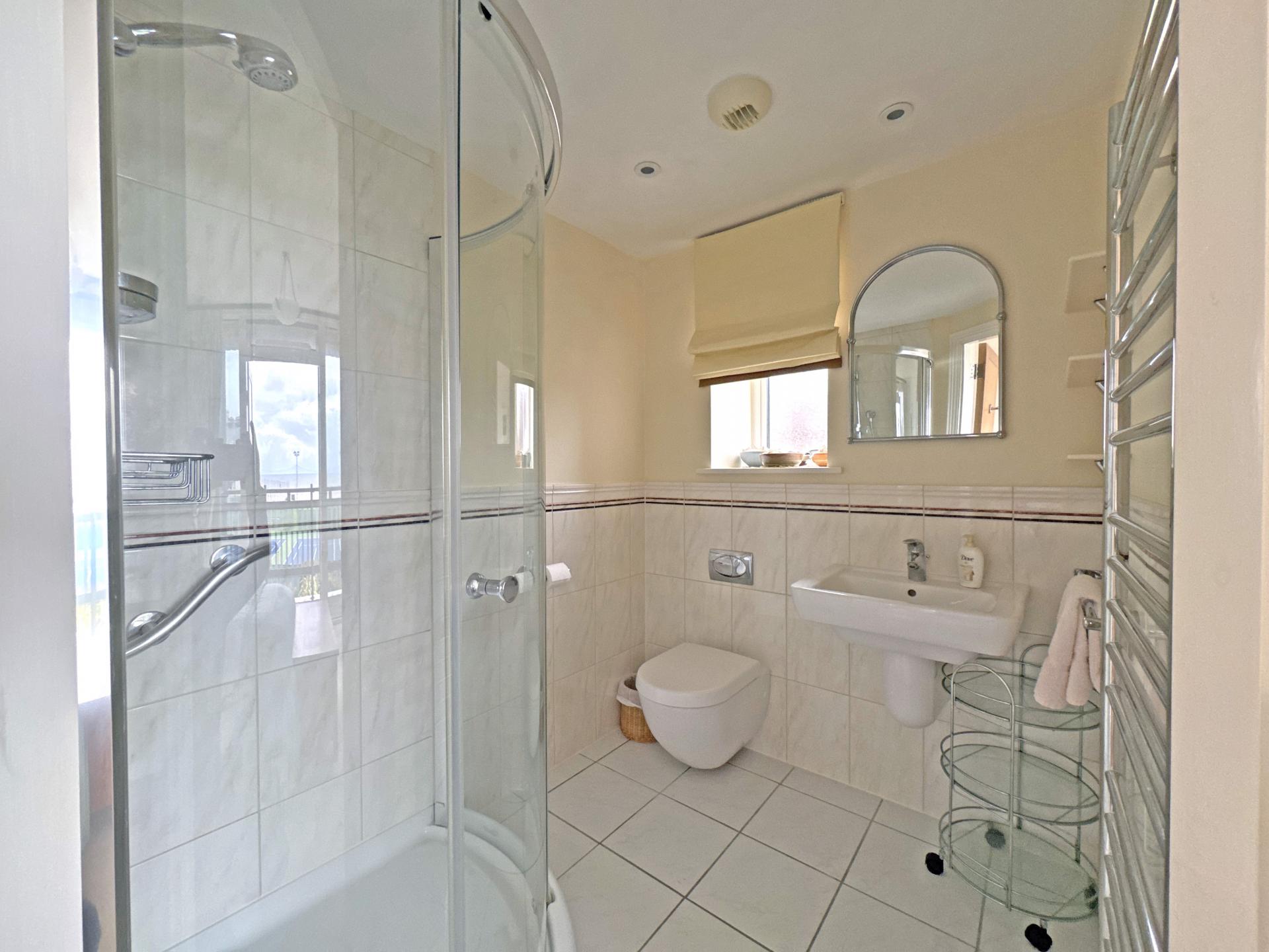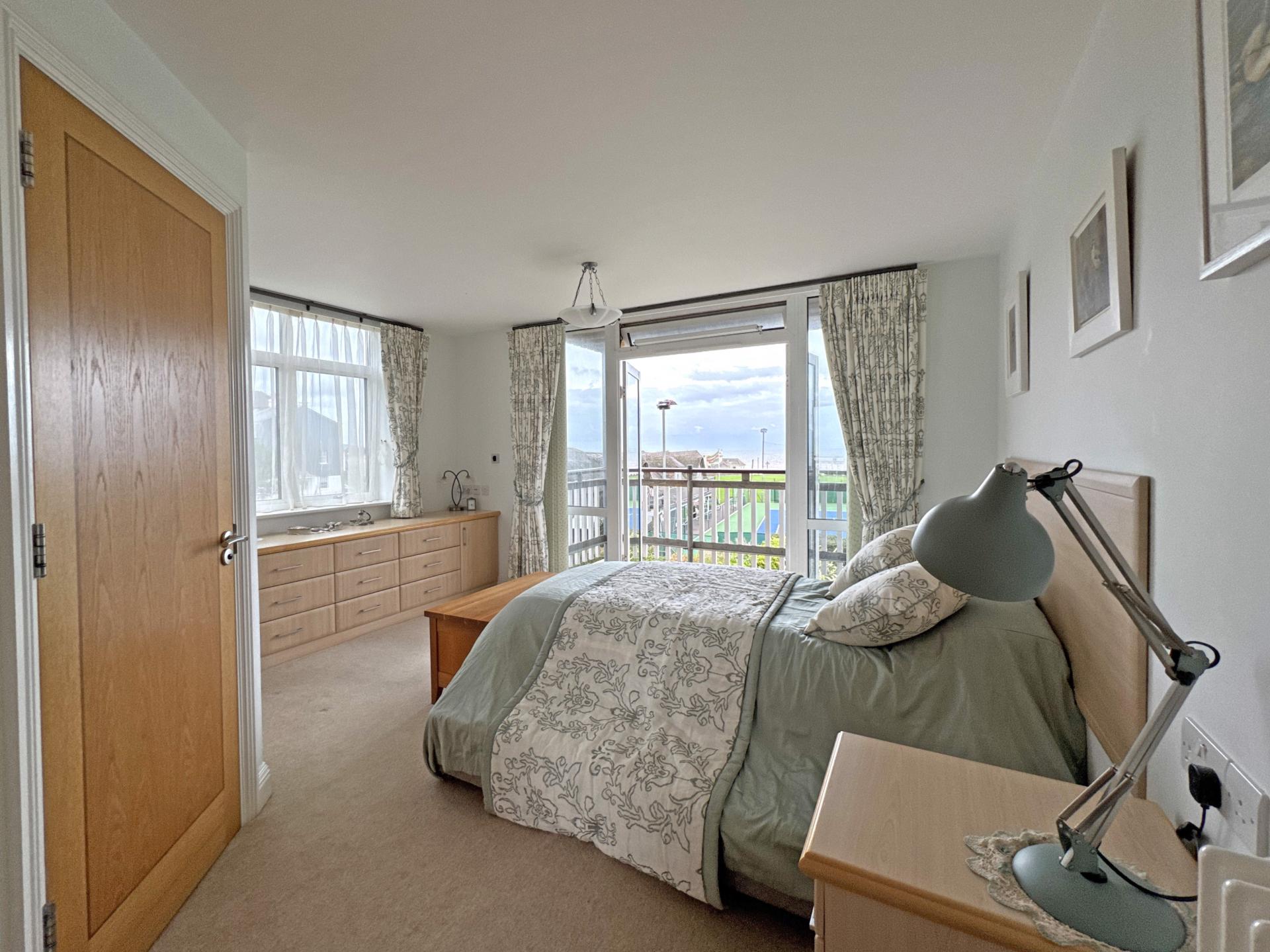 Once inside the property, an entrance hall has an airing cupboard housing a pressurised hot water cylinder and a staircase leading down to the living accommodation. Staying on the upper floor, the main bedroom is dual aspect with en suite shower room and a covered balcony looking south, enjoying a fantastic view over Sidmouth Cricket and Tennis Club to the sea beyond. There are two further double bedrooms, both with fitted wardrobes and one with an en suite shower room. A main bathroom has been recently improved with a wet room shower.