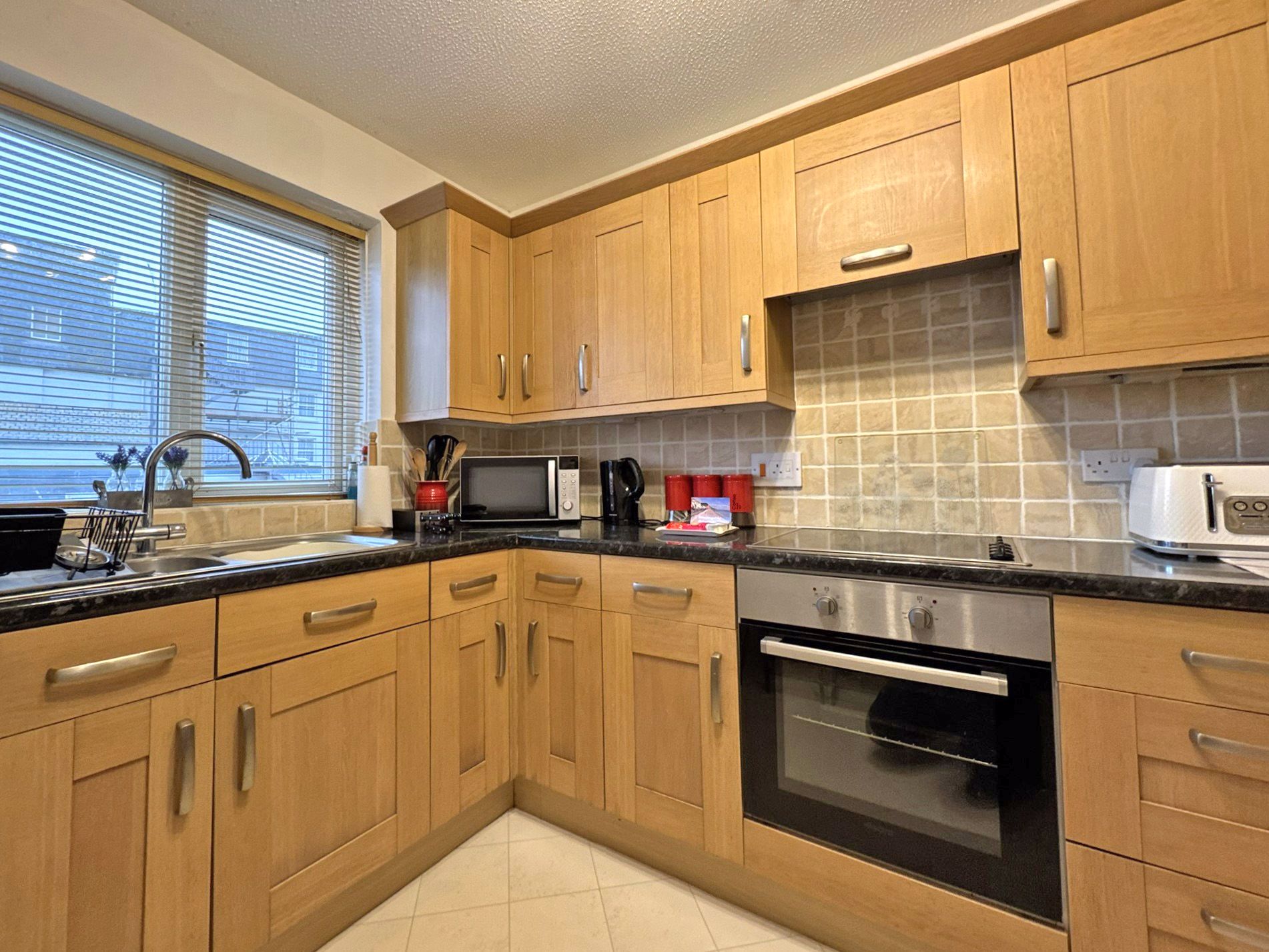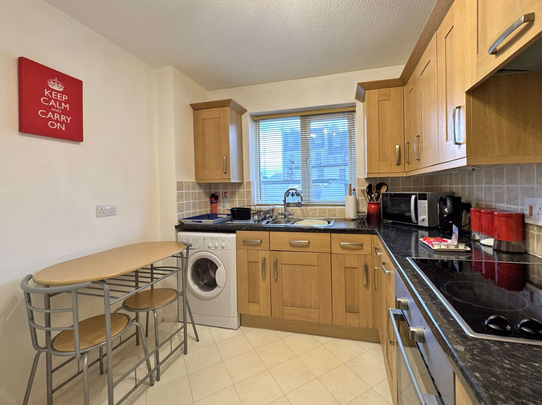 Once inside, an entrance hallway has an airing cupboard and intercom handset to the main entrance. The sitting dining room is a good size and has south facing, sliding doors opening onto a balcony. A separate kitchen is fitted with a good range of modern units with built in fridge/freezer, oven, electric hob and space for a washing machine that is available separately.