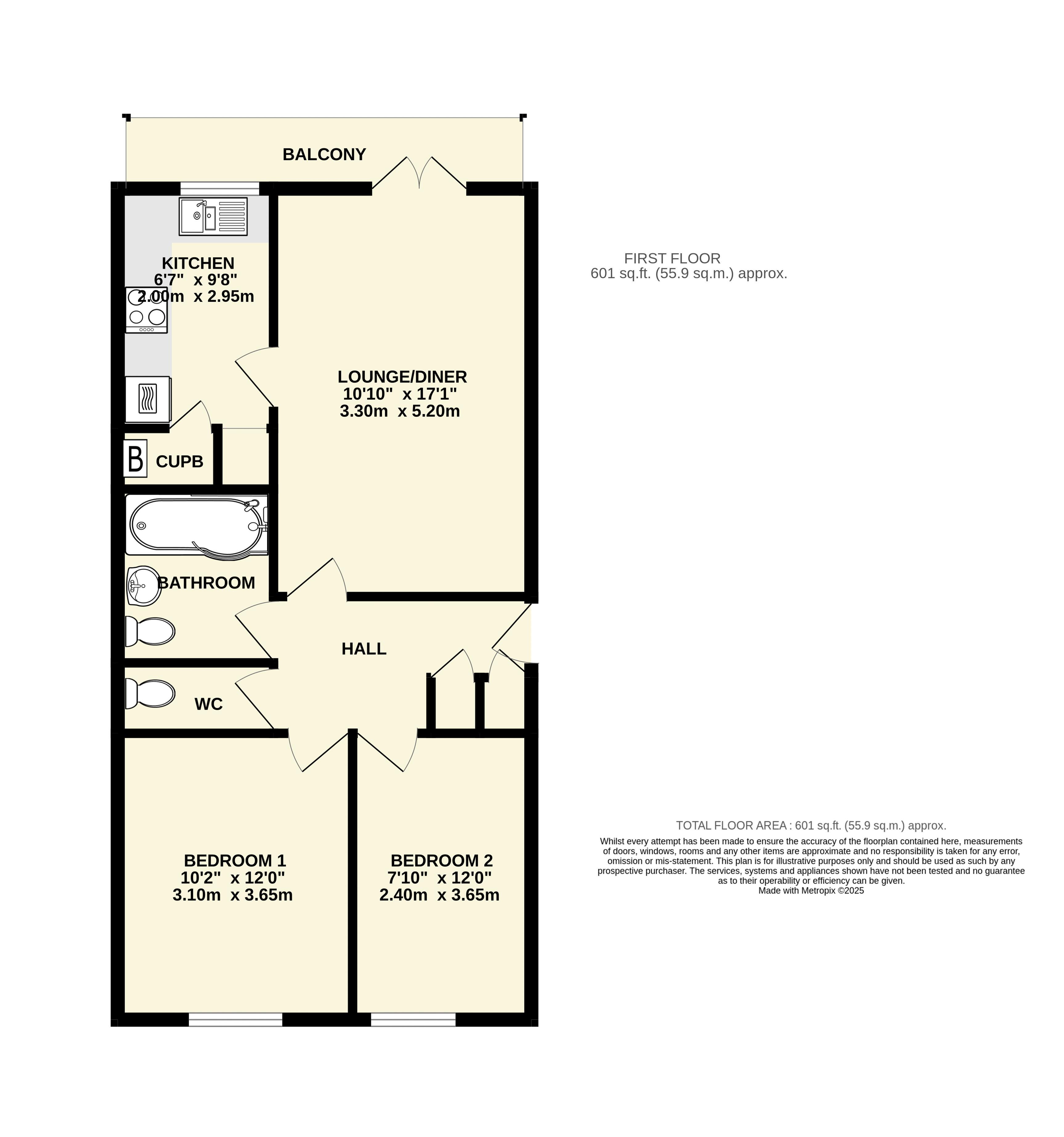 On entering the flat an entrance hall has two storage cupboards. The lounge/dining room enjoys a lovely open outlook over The Triangle and towards the cricket field and has French doors leading onto a balcony. An adjoining kitchen offers a range of storage units with worksurfaces, a built-in split level oven, ceramic hob and cooker hood along with a freestanding washing machine and fridge/freezer. A further storage cupboard houses the wall mounted gas fired boiler.