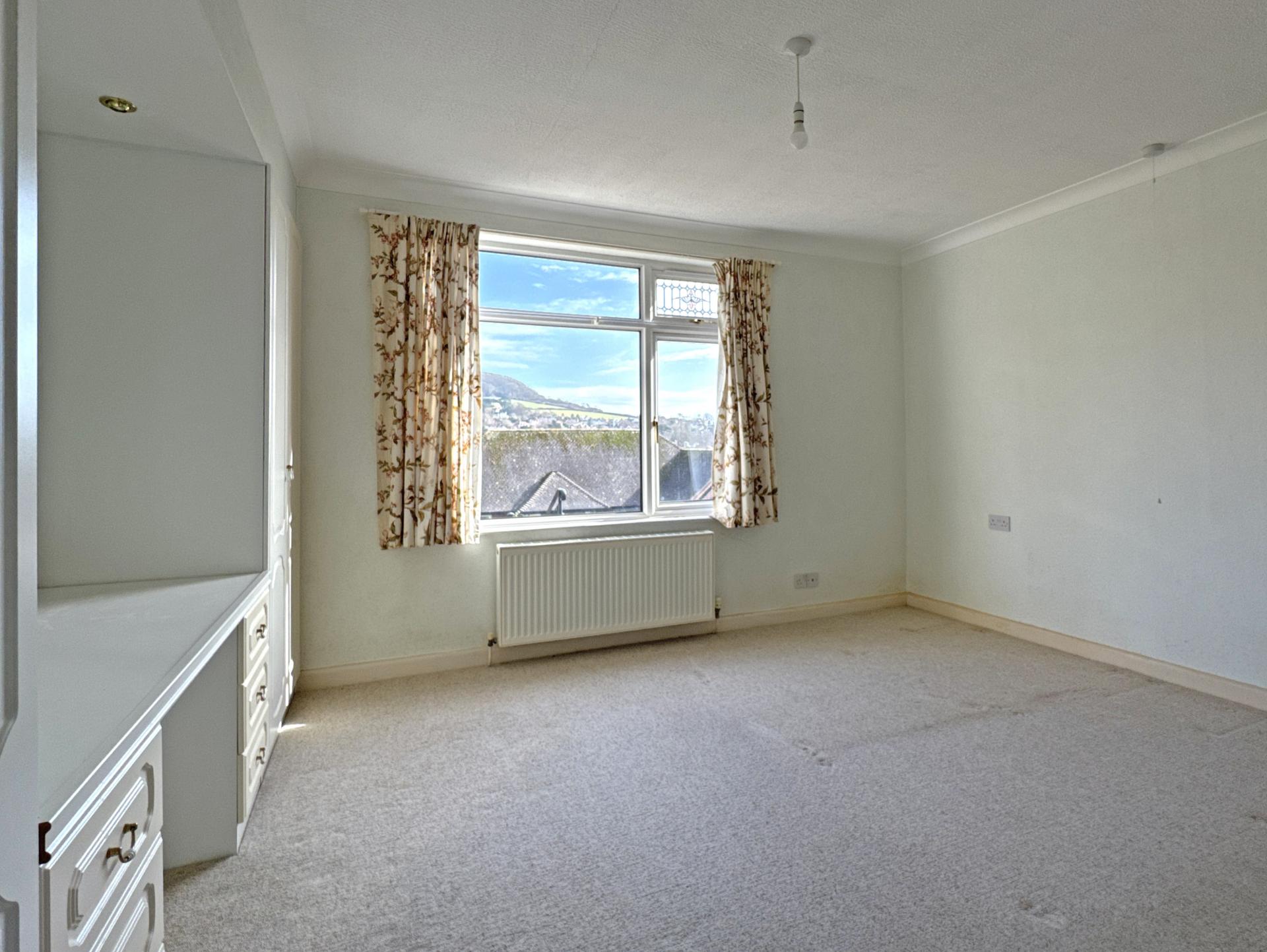 A wide entrance hall leads to a dual aspect sitting room with south facing bay window, having views over the town to the sea. Sliding patio doors look easterly and open onto a decked patio, again with fine views. A good size dual aspect kitchen/dining room is fitted with a comprehensive range of units, a gas hob and electric oven.